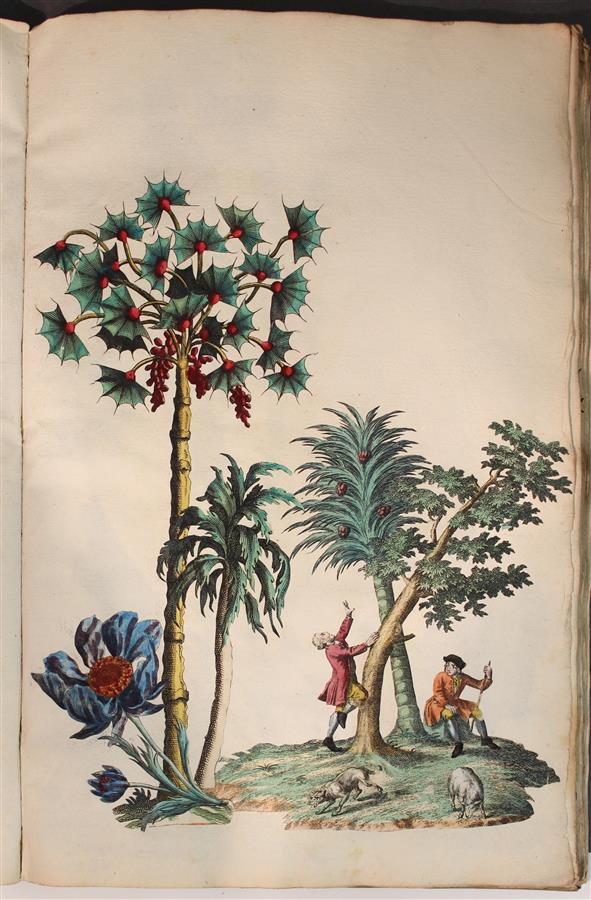 Recueil XVIIIème siècle de découpis de gravures contre-collées et rehaussées à l'aquarelle à l'époque, la plupart représentant des personnages en costumes d'époque sur fonds de paysages, mais aussi quelques scènes naturalistes, donnant lieu à des scènes et proportions parfois saugrenues - 1 volume In-4° de 30 feuillets, les 3 premiers sont annotés en marges supérieures - Reliure de l'époque en vélin crème muette (salie avec petits manques au dos) à lacets - Intérieur très frais - On y joint : 2 gravures XIXème siècle signées Rembrandt.