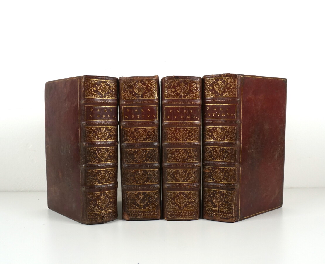 [RELIGIOSA] - Brevarium Romanum []. Pars hiemalis. Pars aestiva ; Pars autumnalis. Pars verna - Antverpiae ; Balthasar Moreti, 1698 - 4 volumes In-12° - Vign-ettes aux titres et textes à l'encre rouge et noire, culs-de-lampe en rouge ou noir - Reliure de l'époque veau glacé rouge (plats légèrement frottés, 1 fine éraflure au 2nd plat du tome automne, des coins émoussés) - Filet d'encadrement aux plats - Dos à nerfs ornés et titrés or (, 3 coiffes restaurées) - Tranches dorées - Bon ensemble.