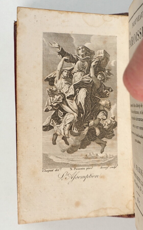 [RELIOGIOSA - MISSELS] - Ensemble de 4 missels : Nouveau paroissien contenant l'office des dimanches et fêtes en latin et en françois [] - Paris ; Genets Jeune, 1817 - 1 volume In-16° - Petites rousseurs éparses - Frontispice et gravures hors texte - Reliure de l'époque maroquin rouge à long grain - Plats encadrés d'1 filet et d'1 roulette dorée - Monogramme AB couronné au centre des plats - Dos lisse joliment orné et titré or - Tranches dorées - FLAVIGNY (Comtesse de) - Recueil de prières et de méditations [] - Tours ; A. Mame et Fils, 1898 - 2 volumes In-18° similaires - Frontispices et gravures hors texte - Reliures de l'époque maroquin chocolat signées Lesort - Larges dentelles intérieures - Contre plats et gardes doublés de toile dorée ornée - Dos à nerfs titrés or - Monogramme J. V. en lettre dorées aux 1ers plats - Tranches marbrées sur dorure - BOSSUET - Méditations sur l'eucharistie - Tours ; Mame et Fils, 1893 - 1 volume In-18° - Frontispice et gravures hors texte - Reliure de l'époque maroquin havane - Dentelle intérieure - Contre plats et gardes doublés de moire rouge - Dos à nerfs titrés or - Tranches marbrées sur dorure - Bon ensemble.
