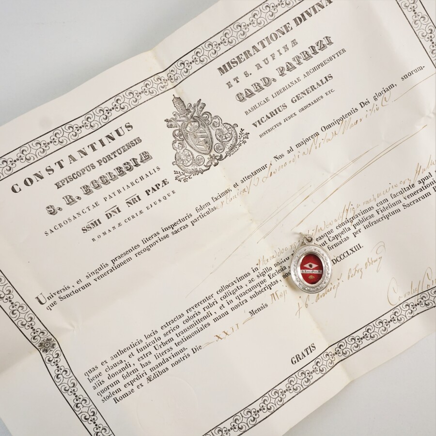 Reliquaire ovale en métal argenté ciselé contenant à l'intérieur un papier avec l'inscription manuscrite "St Louis de Gonzague" et un papier cartonné avec quelques cheveux (?) et l'inscription "b. Leo. aPor. M" (Blessed Leonardo da Porto Maurizio) scellé d'un cachet en cire au dos, avec son document, H. Hors bélière : 3.5 cm, Poids brut : 12 g environ.