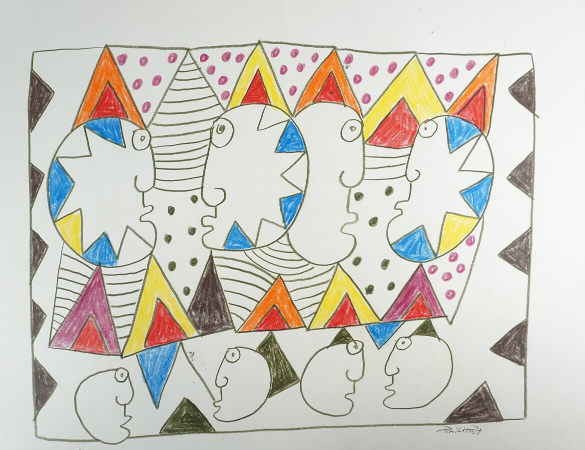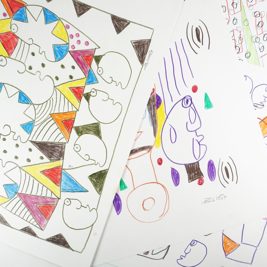 Renaud PHILIPPOT (1970), "Personnages", ensemble de cinq dessins, couleurs, signés, 50 x 65 cm.