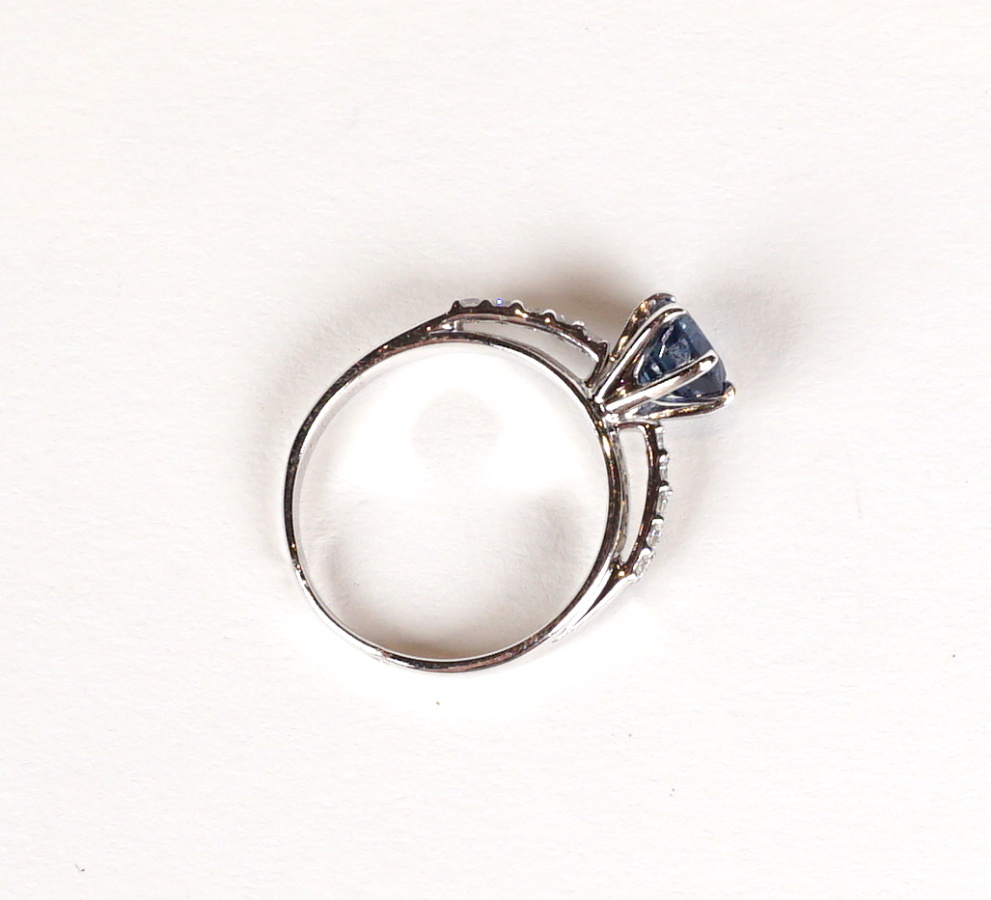 RENDRE Bague "Solitaire" en or blanc 18 K (750/oo), serti d'un saphir rond taille ovale pesant 1,41 ct, épaulé de 2 lignes sinueuses de 10 diamants blancs taille moderne 0.20 ct. TDD 54. Poids brut : 3.4 g environ.