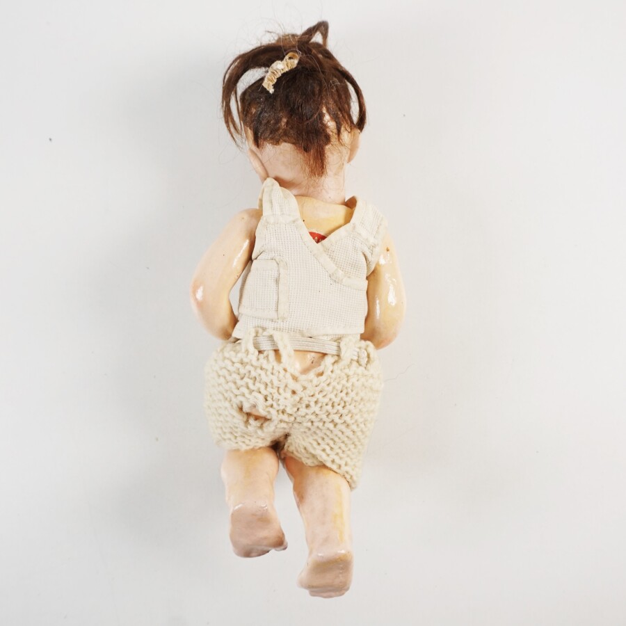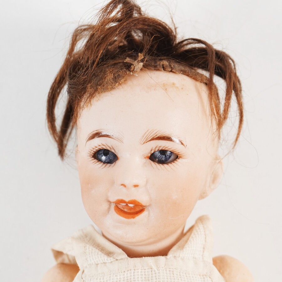 RENDRE SFBJ : Poupée caractère "rieur", corps en carton bouilli et tête biscuit, marqué, Paris, H. 21 cm (défaut de cuisson et fêle léger sur ligne de moule, petites usures).