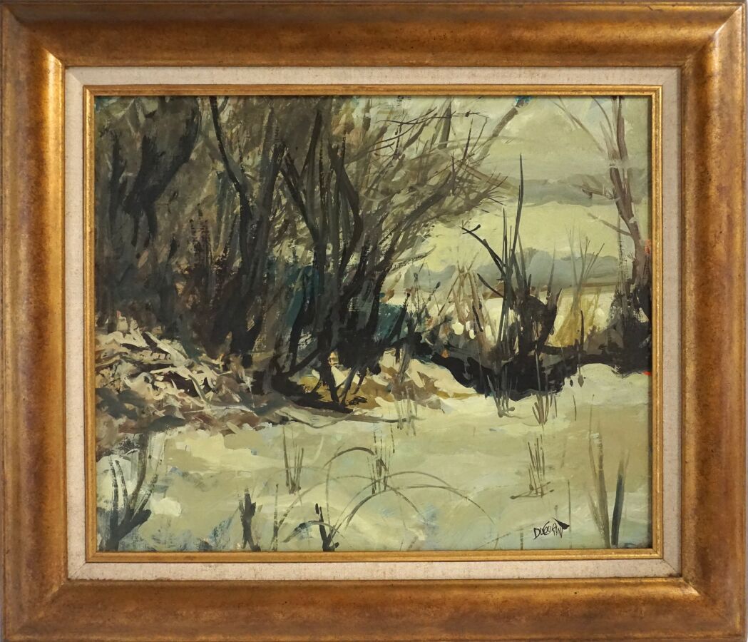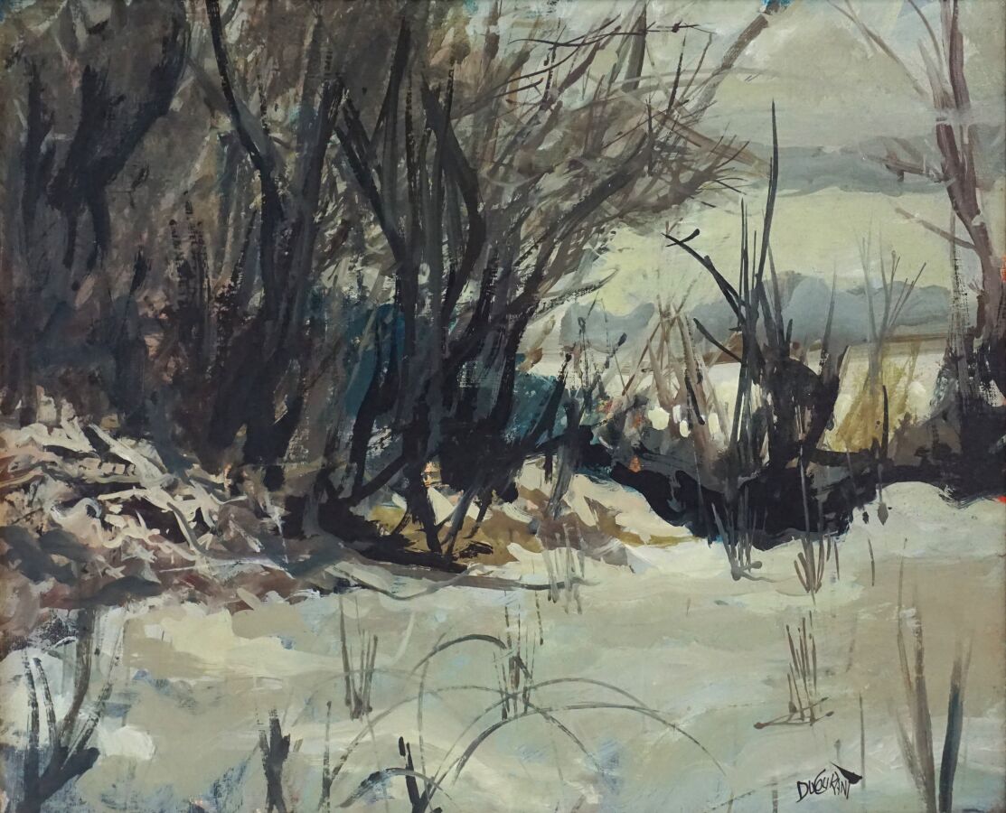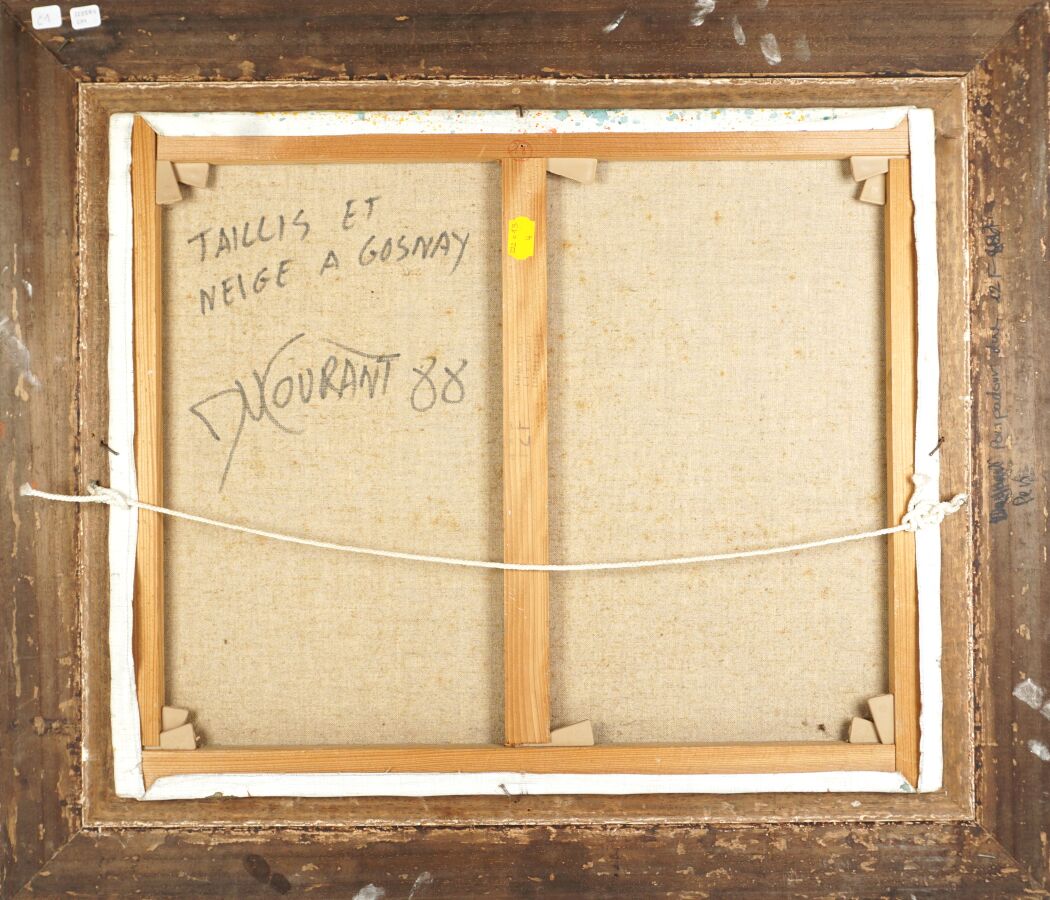 René DUCOURANT (1932), "Taillis et neige à Gosnay" 88, huile sur toile signée en bas à droite, contresignée, datée et titrée au dos, 50 x 61 cm.