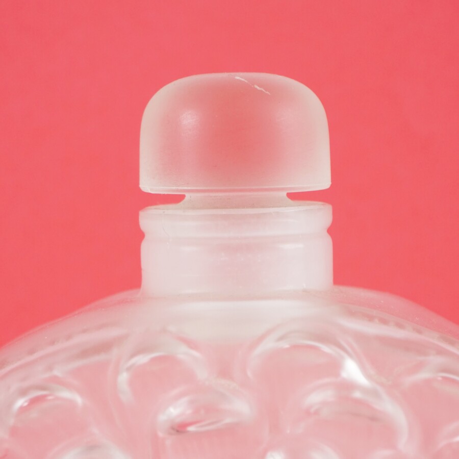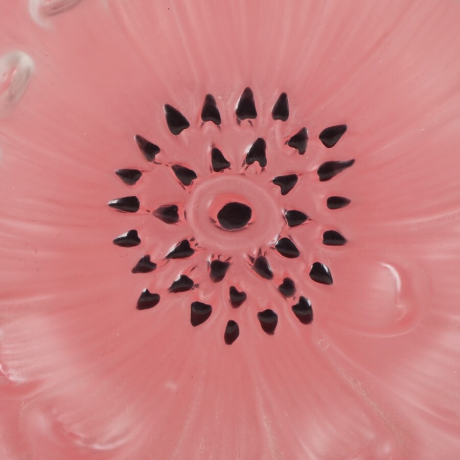 René LALIQUE France : Flacon modèle Dahlia, en verre pressé-moulé partiellement émaillé noir, signature sous la base R.LALIQUE France, H 18 cm (le bouchon coincé).