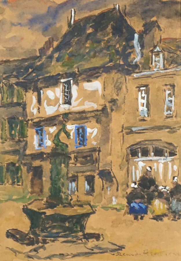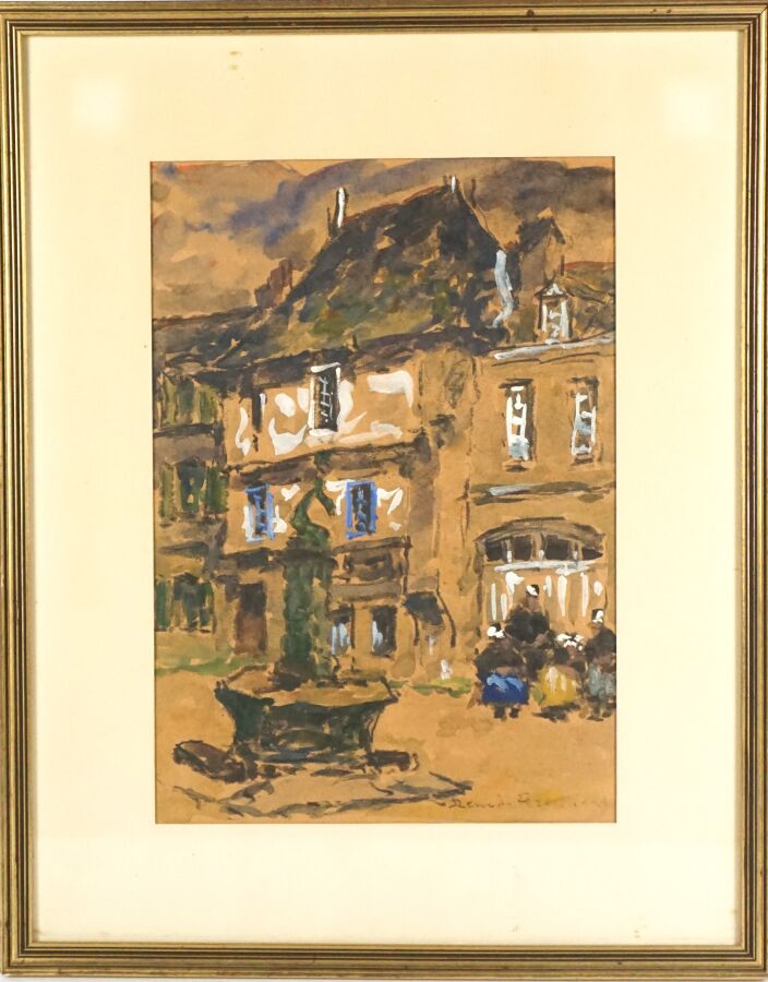 René LE FORESTIER (1868- 1951), "La fontaine au dauphin, Concarneau", pastel et aquarelle sur papier, signée en bas à droite, 30.5 x 21.5 cm (à vue).