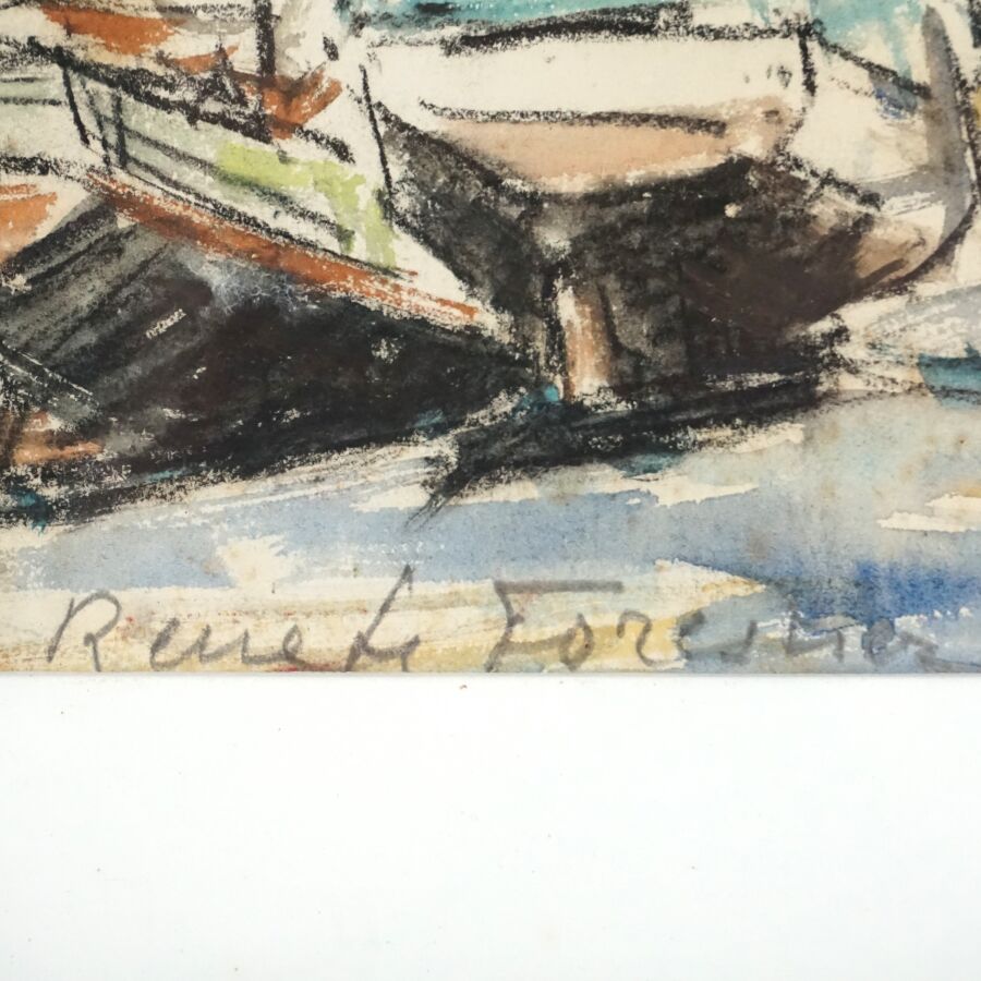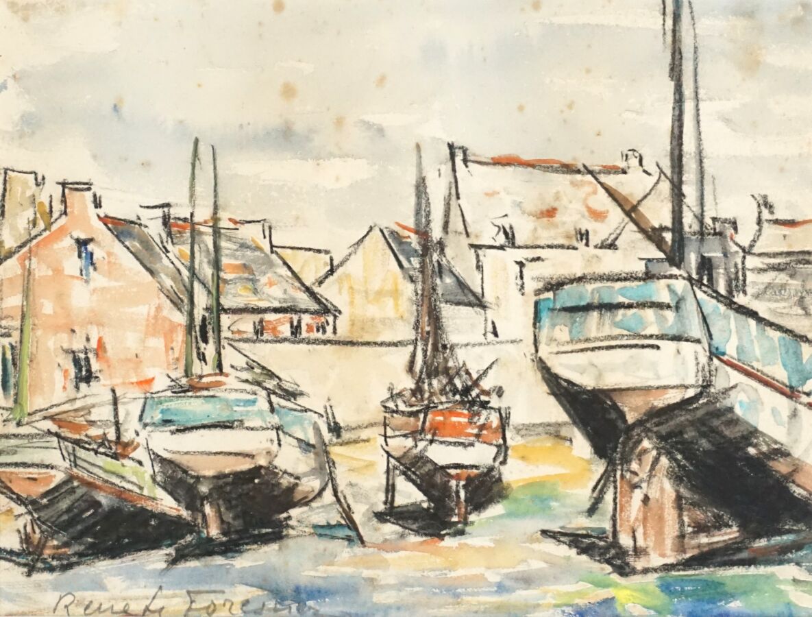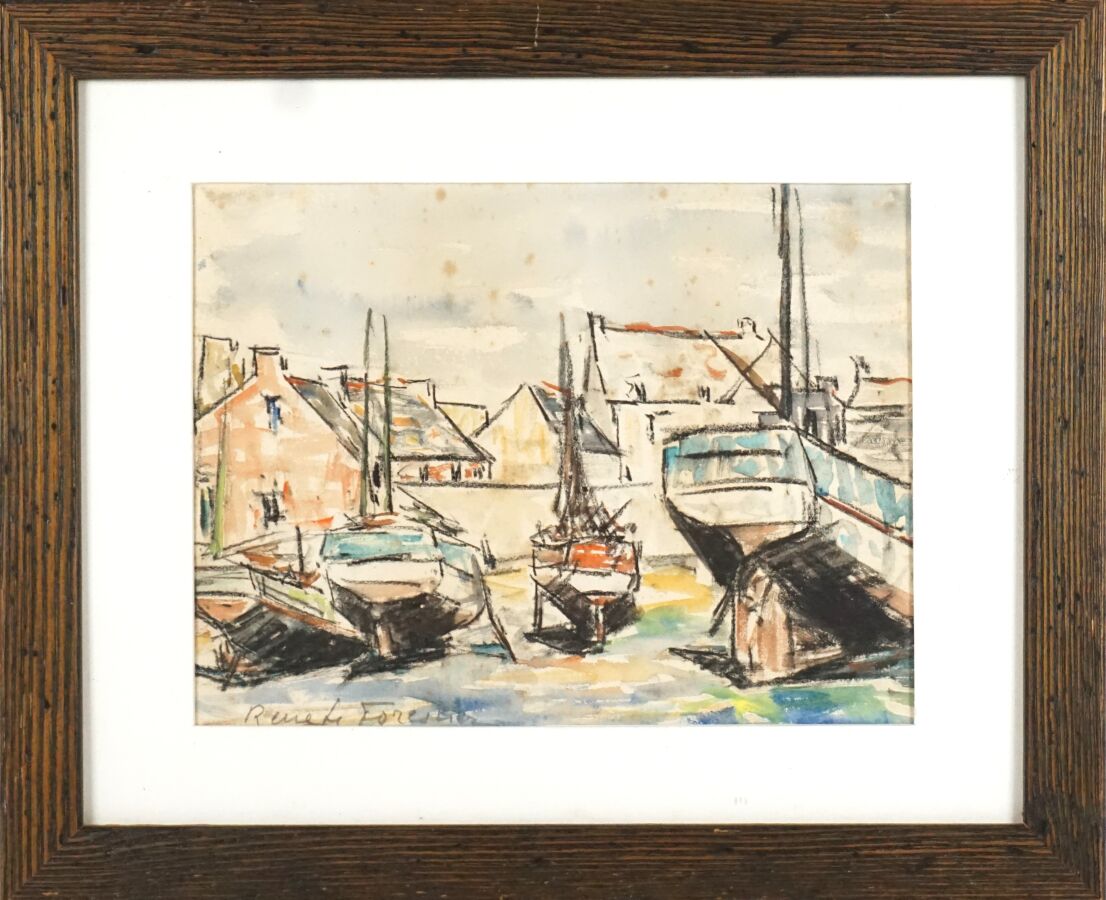 René LE FORESTIER (1903-1972), "Voiliers à quai", pastel et aquarelle, signée en bas à gauche, 16.5 x 21.5 cm (à vue) (quelques taches).