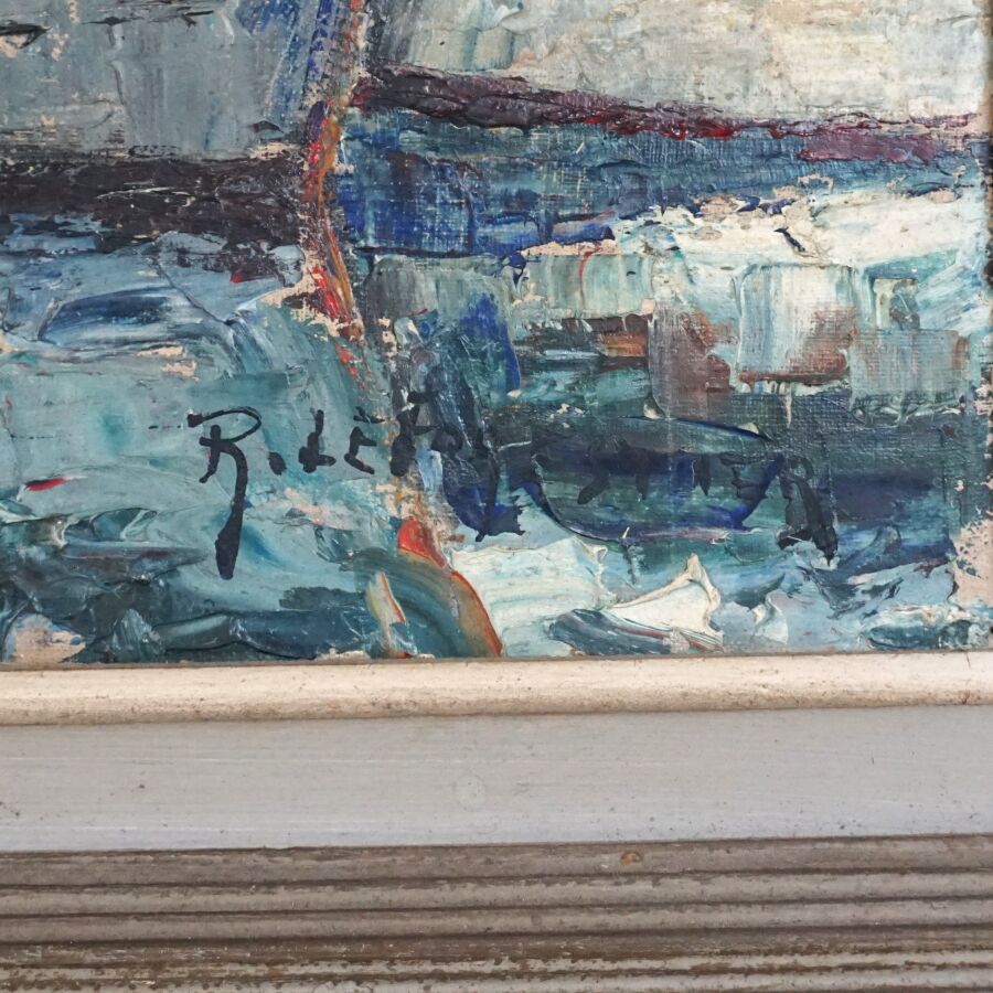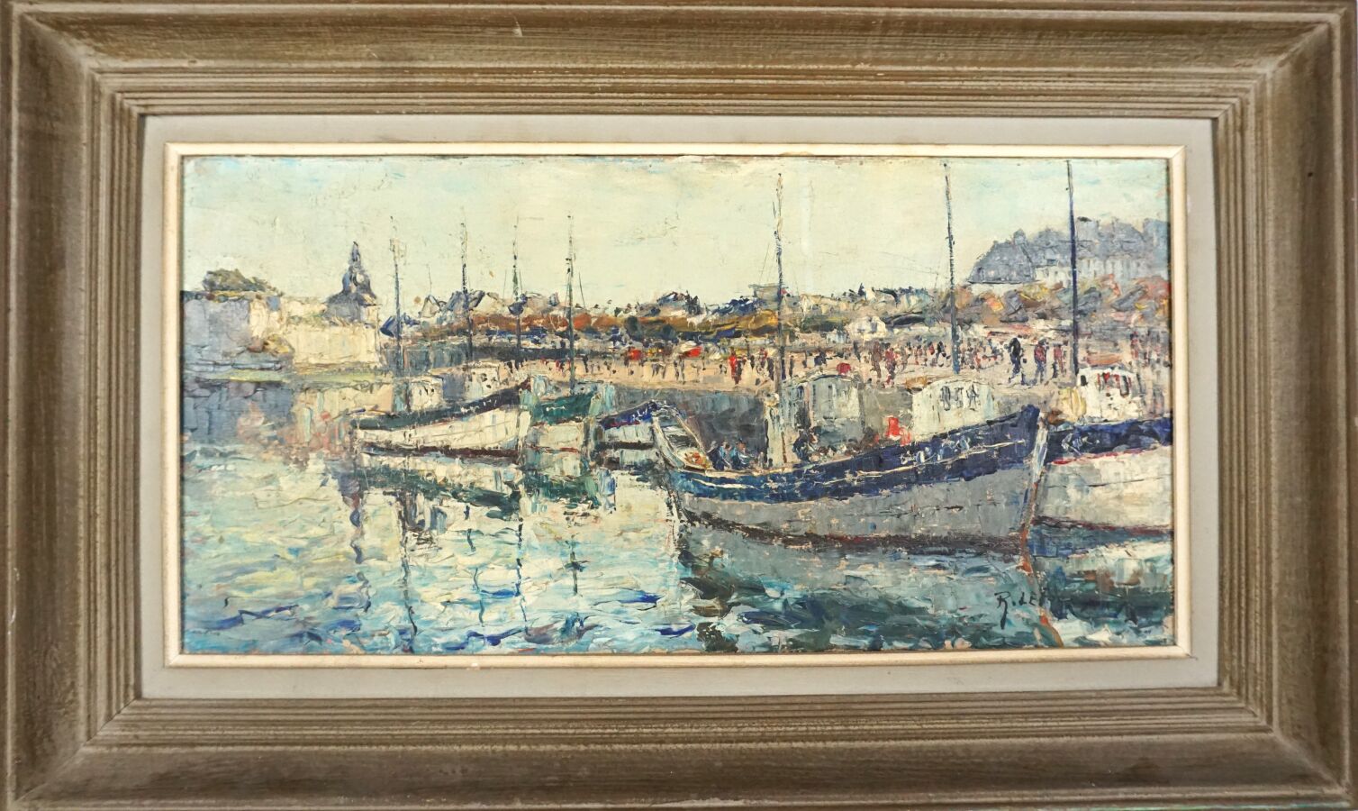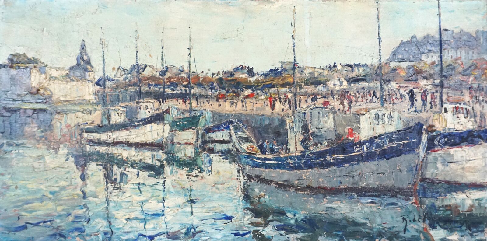 René LE FORESTIER (1903-1972), "Voiliers amarrés", huile sur toile signée en bas à droite, 30 x 60.5 cm.
