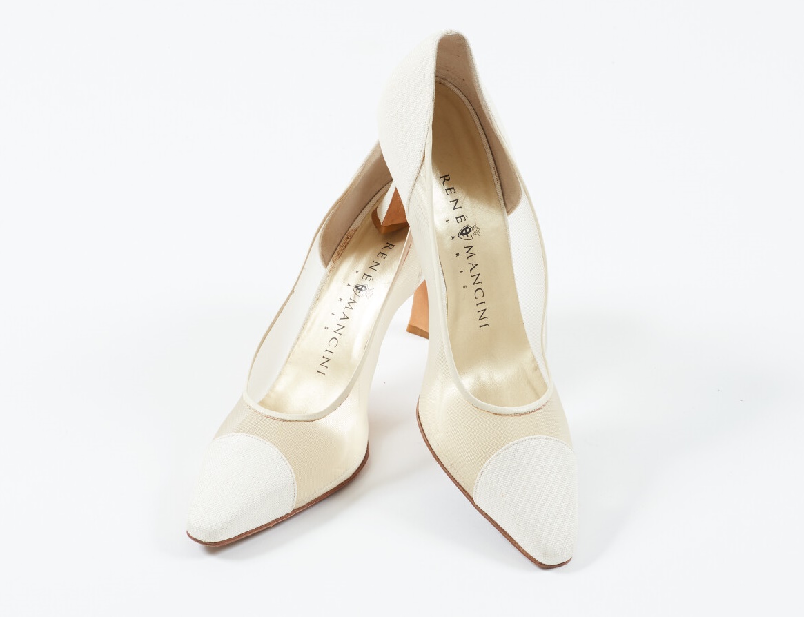 René MANCINI Escarpins en cuir façon lézard et mesh blancs. Talon 8,5 cm. Pointure 39,5. (Bon état général).