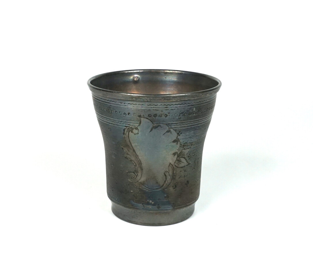René MOREL (circa 1886, 1 bis bd Magenta, Paris) : Timbale évasée en argent, poinçon Minerve 1er titre, à décor d'un cartouche feuillagé, de pastilles et plumetis sur fond guilloché, H. 7 cm. Poids brut : 50 g environ.