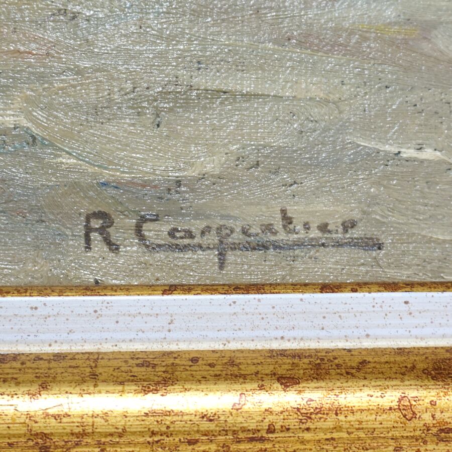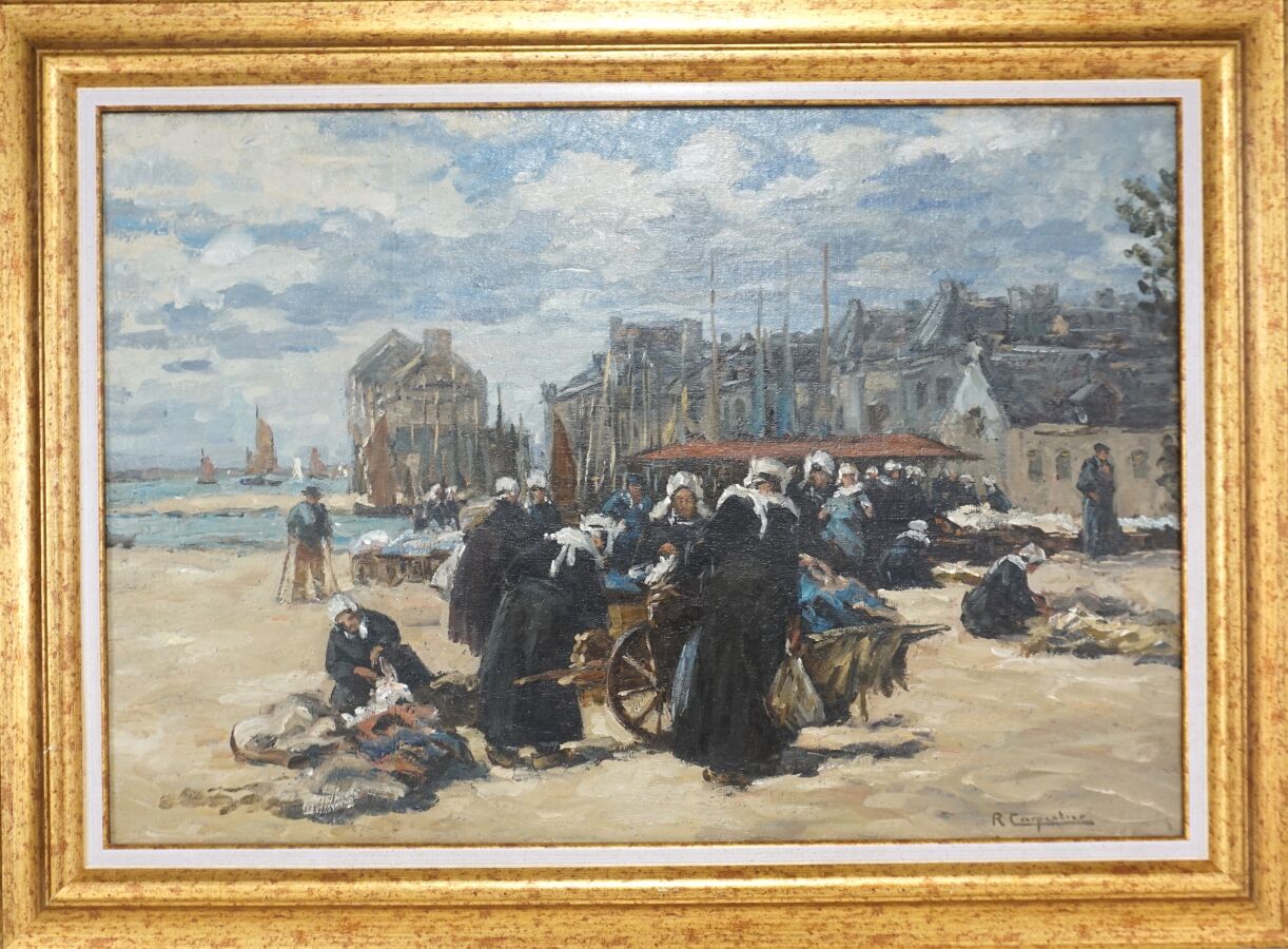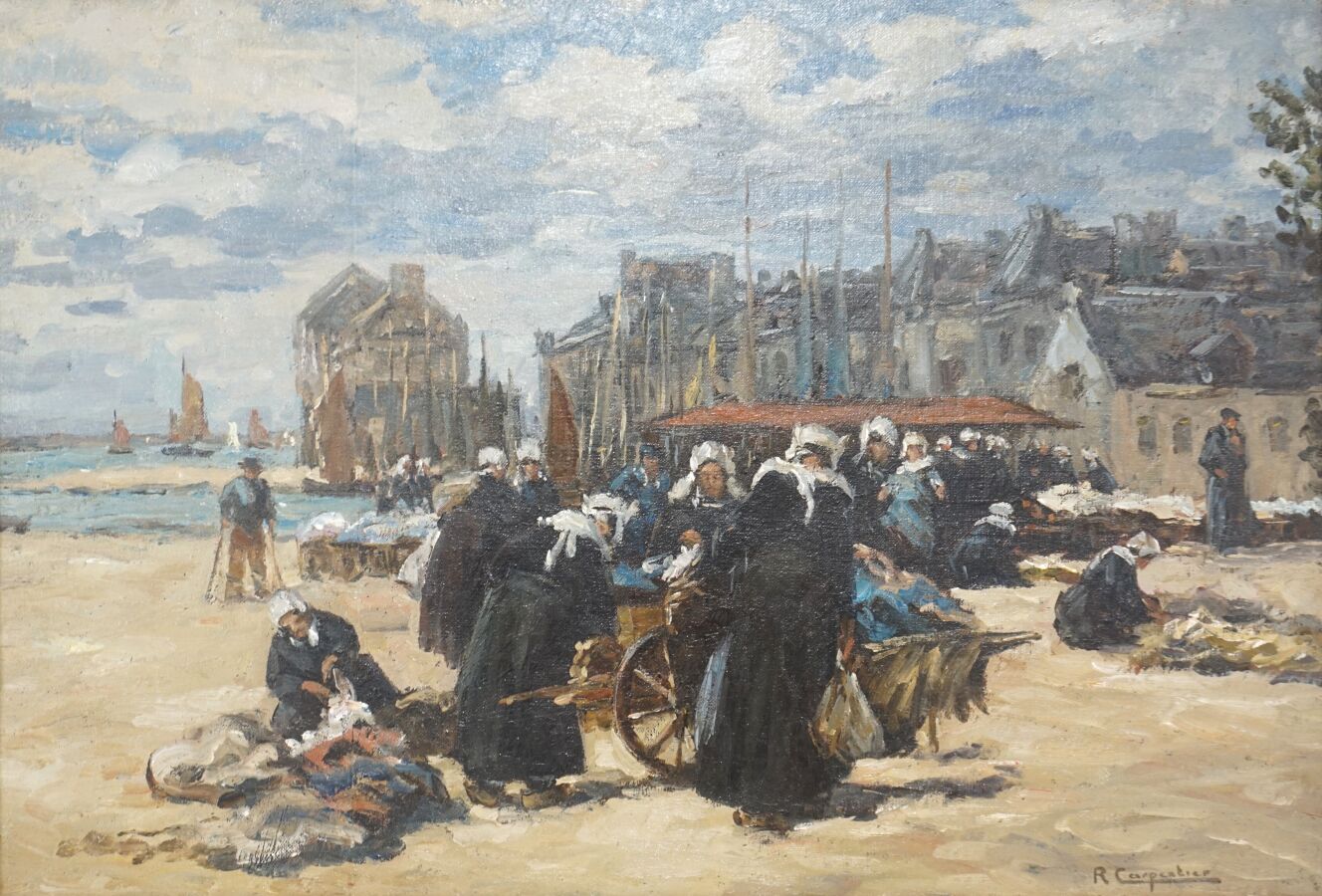 Renée CARPENTIER (1913-2003), "Le marché aux étoffes à Concarneau", huile sur toile signée en bas à gauche, 50 x 73 cm.