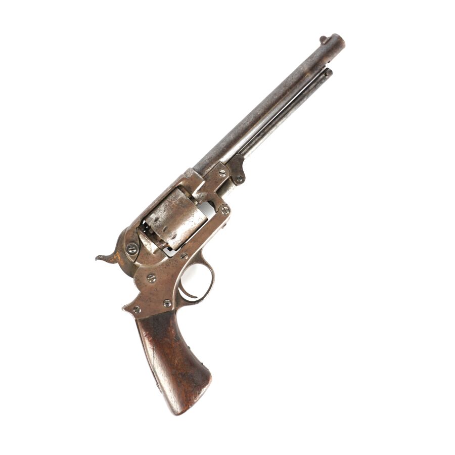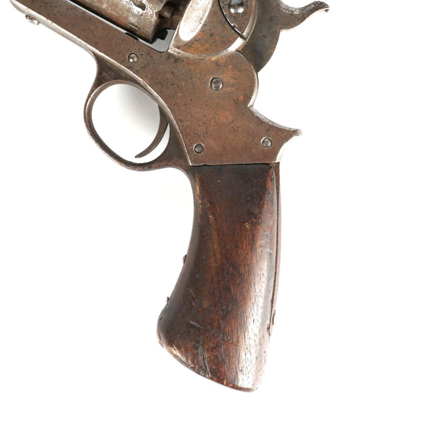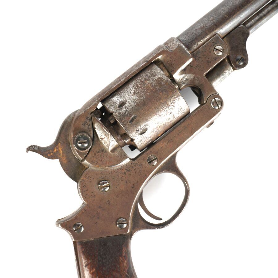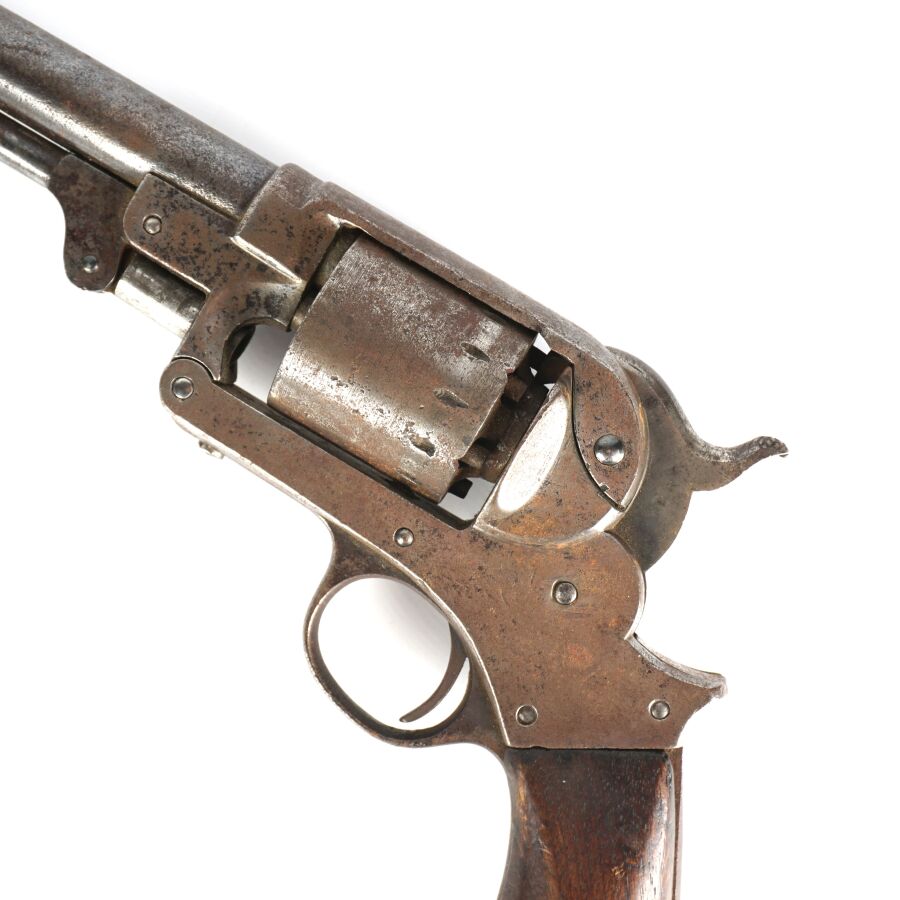Réplique de REVOLVER A POUDRE NOIRE STARR MODELE 1863, calibre 44, 6 coups, simple action, carcasse fermée à brisure (oxydations et piqures) numérotée " 55666 ", marquages " STARR. ARMS. Co. NEW. YORK. " côté gauche et " STARR'S PATENT JAN. 15. 1856 (?) " à droite pratiquement effacés, barillet numéroté " 15438 ", canon rond de 20 cm, levier de chargement sous canon (manque fixation du levier en bout de canon), poignée en noyer, mécanisme non fonctionnel (indexation du barillet à revoir), longueur totale : 34 cm, ABE.