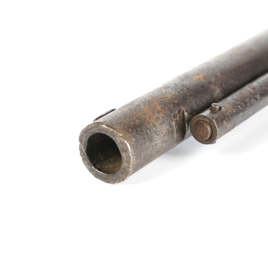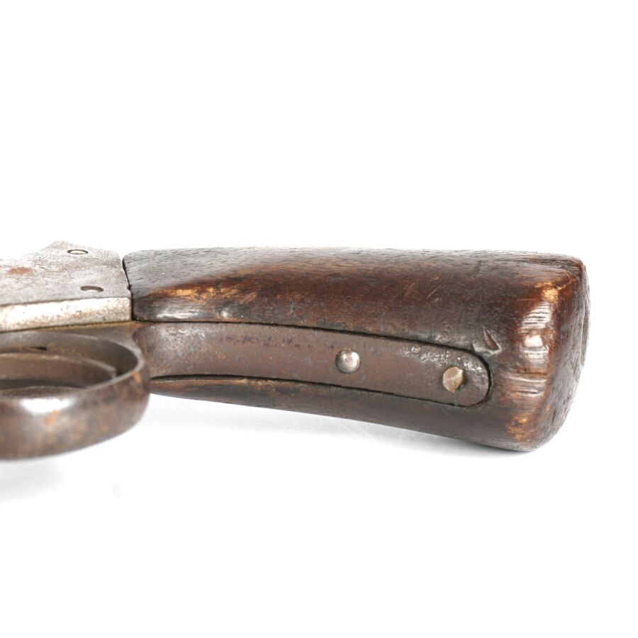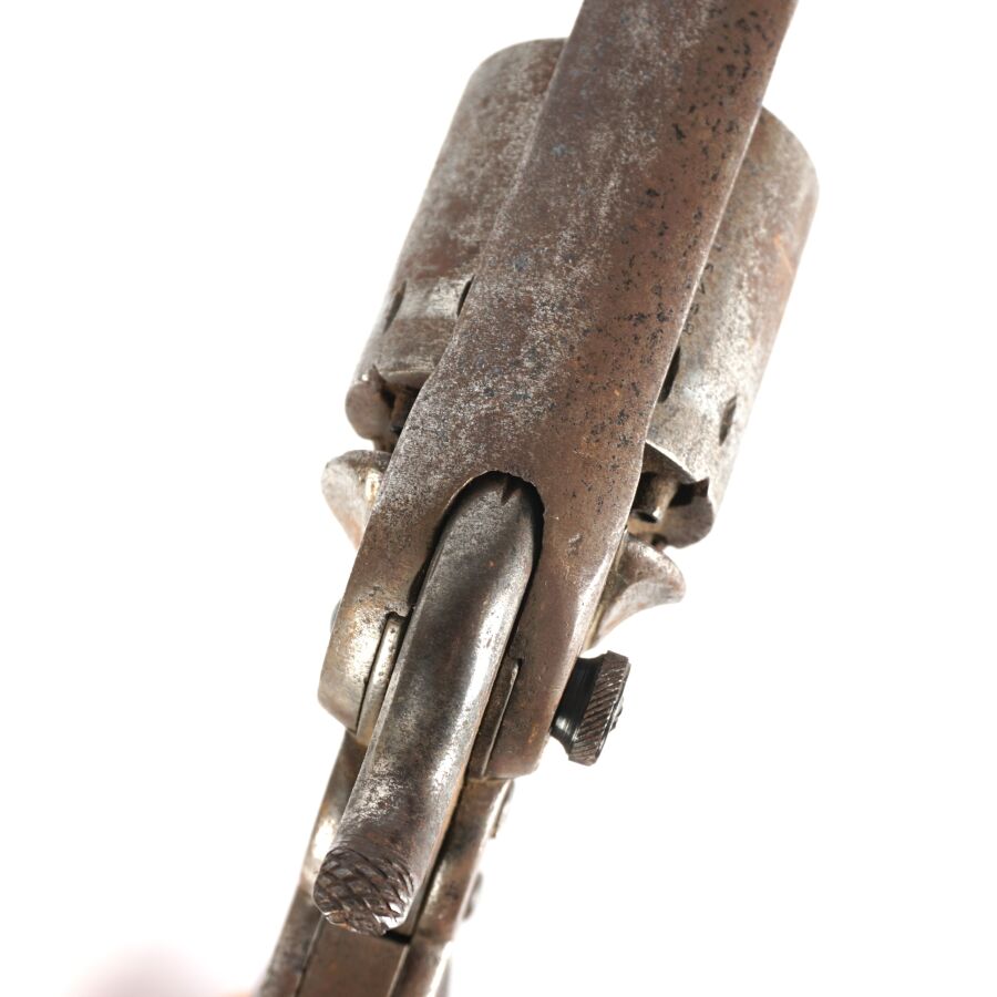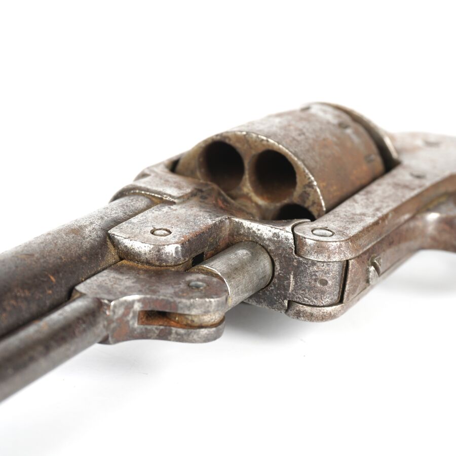 Réplique de REVOLVER A POUDRE NOIRE STARR MODELE 1863, calibre 44, 6 coups, simple action, carcasse fermée à brisure (oxydations et piqures) numérotée " 55666 ", marquages " STARR. ARMS. Co. NEW. YORK. " côté gauche et " STARR'S PATENT JAN. 15. 1856 (?) " à droite pratiquement effacés, barillet numéroté " 15438 ", canon rond de 20 cm, levier de chargement sous canon (manque fixation du levier en bout de canon), poignée en noyer, mécanisme non fonctionnel (indexation du barillet à revoir), longueur totale : 34 cm, ABE.