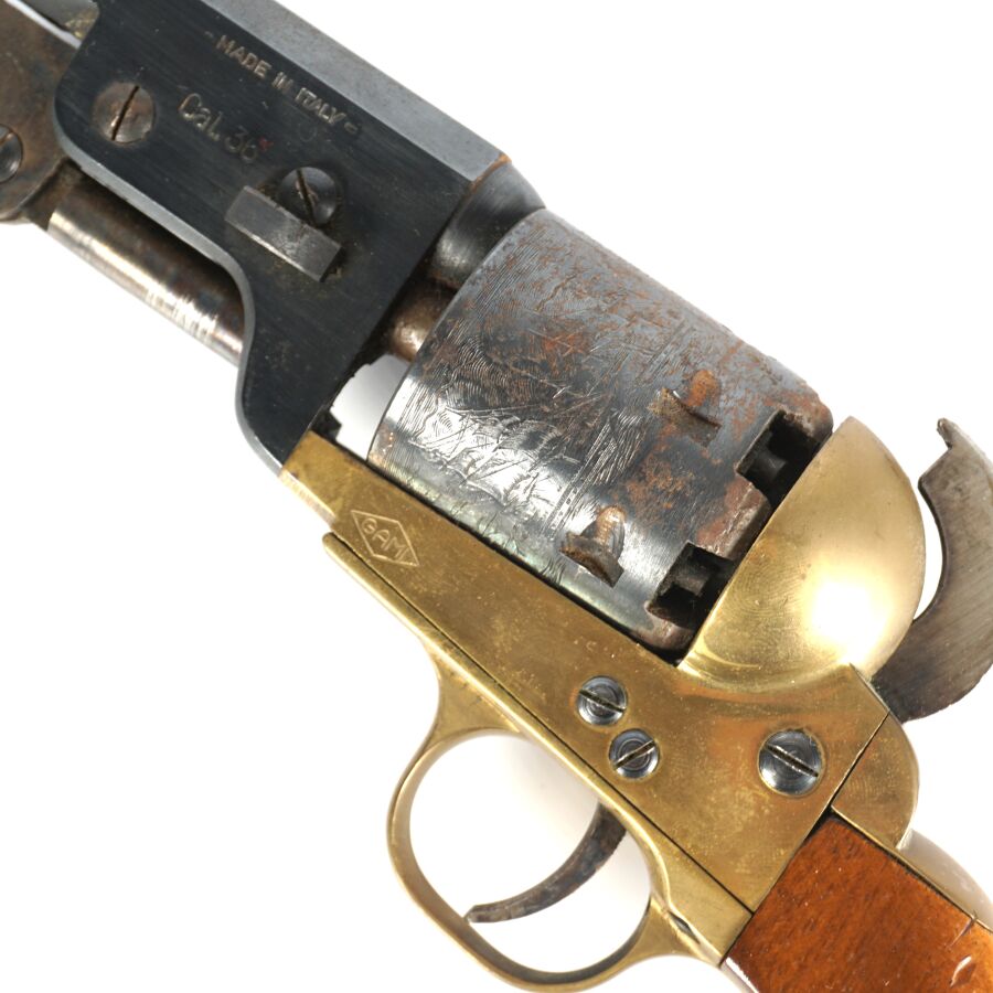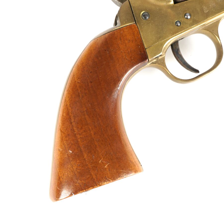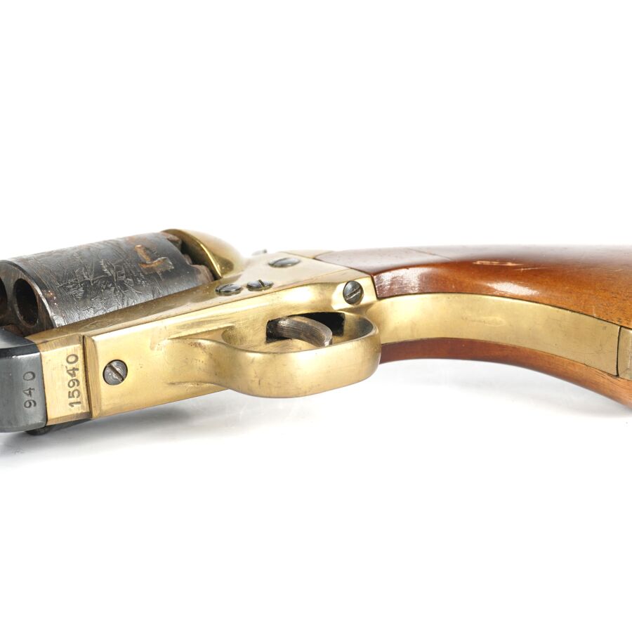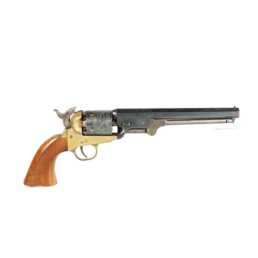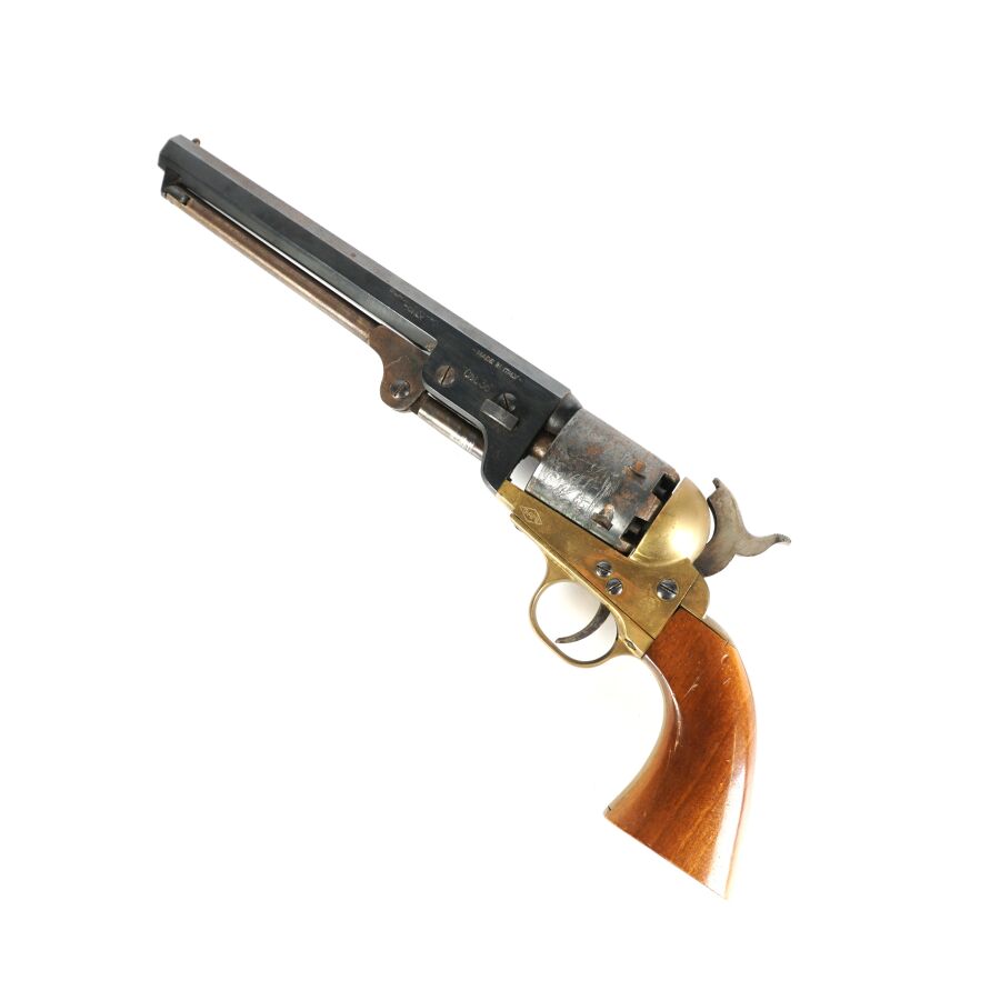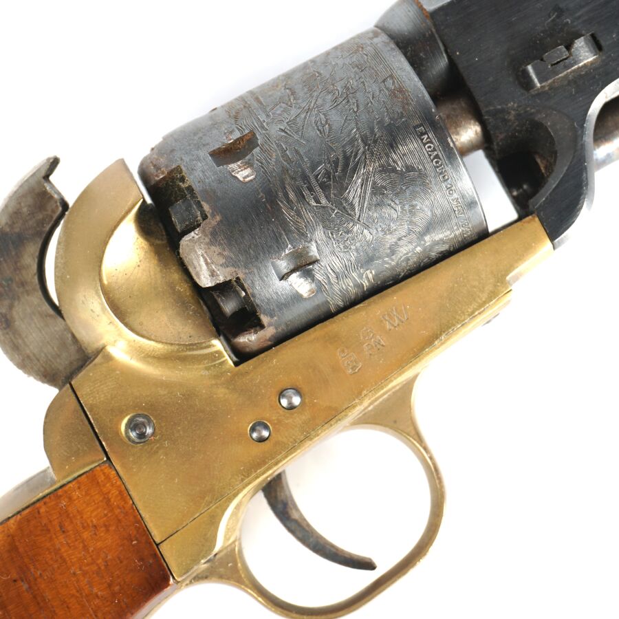 Réplique de REVOLVER US MODELE 1851 NAVY de MARQUE FAP - F. LLI PIETTA, calibre 36 à poudre noire, 6 coups, simple action, carcasse et pontet en laiton, barillet à décor gravé de scènes de batailles navales marqué " PATENT N° " & " Engaged 16 MAY 1848 ", canon rond de 18 cm bronzé (oxydations de surface), tige d'extraction, plaquettes de la poignée en noyer (coups), arme numéro 15940, catégorie D collection en vente libre, mécanisme semblant fonctionnel, longueur totale : 34 cm, BE.