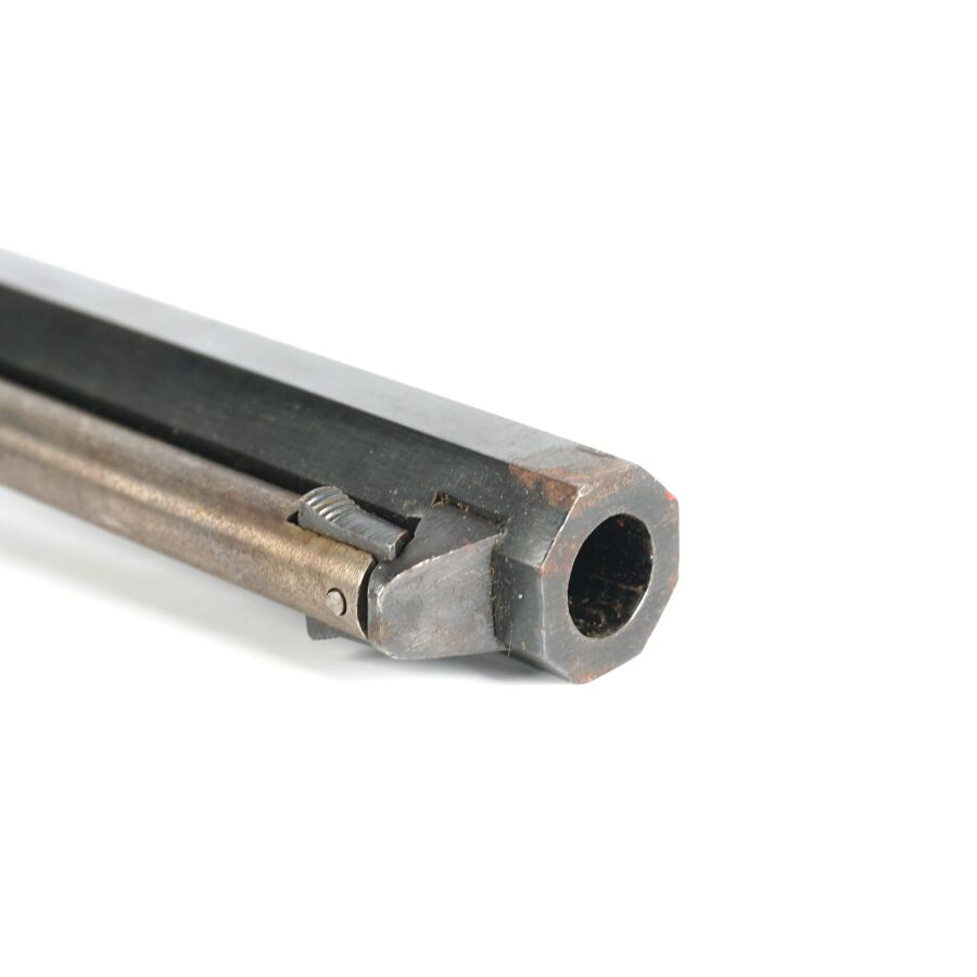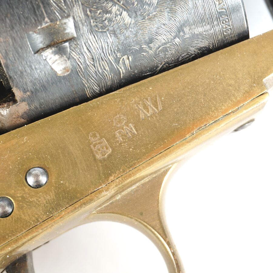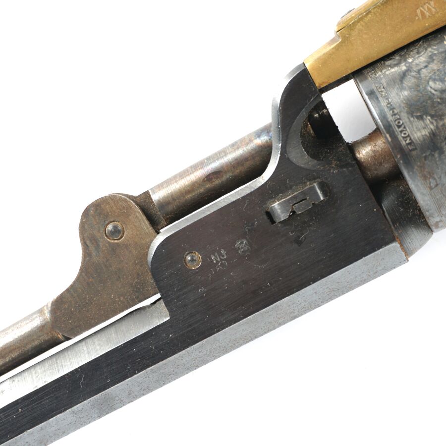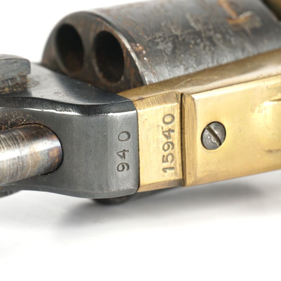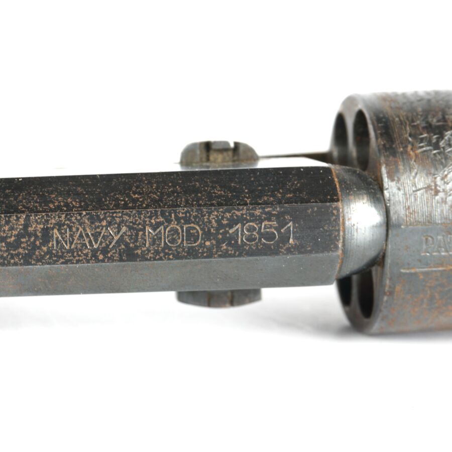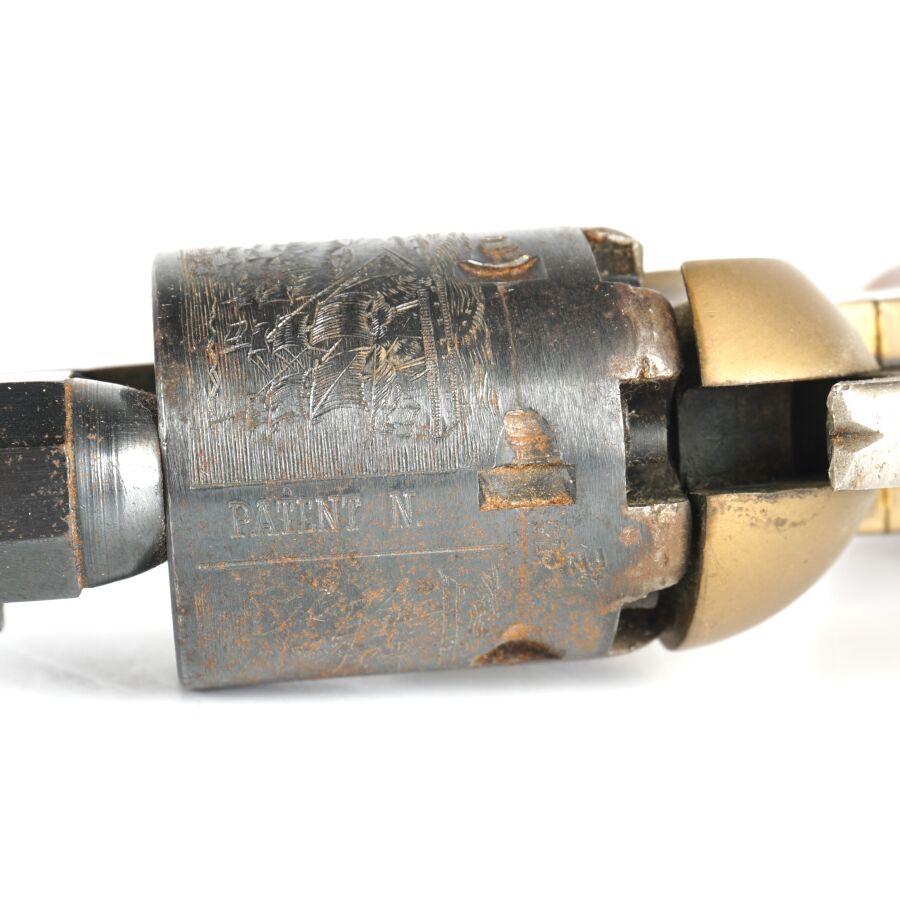 Réplique de REVOLVER US MODELE 1851 NAVY de MARQUE FAP - F. LLI PIETTA, calibre 36 à poudre noire, 6 coups, simple action, carcasse et pontet en laiton, barillet à décor gravé de scènes de batailles navales marqué " PATENT N° " & " Engaged 16 MAY 1848 ", canon rond de 18 cm bronzé (oxydations de surface), tige d'extraction, plaquettes de la poignée en noyer (coups), arme numéro 15940, catégorie D collection en vente libre, mécanisme semblant fonctionnel, longueur totale : 34 cm, BE.