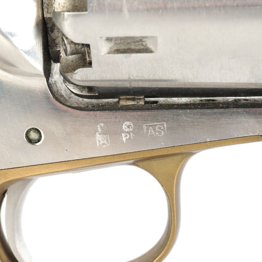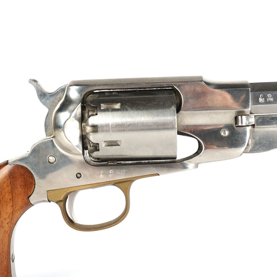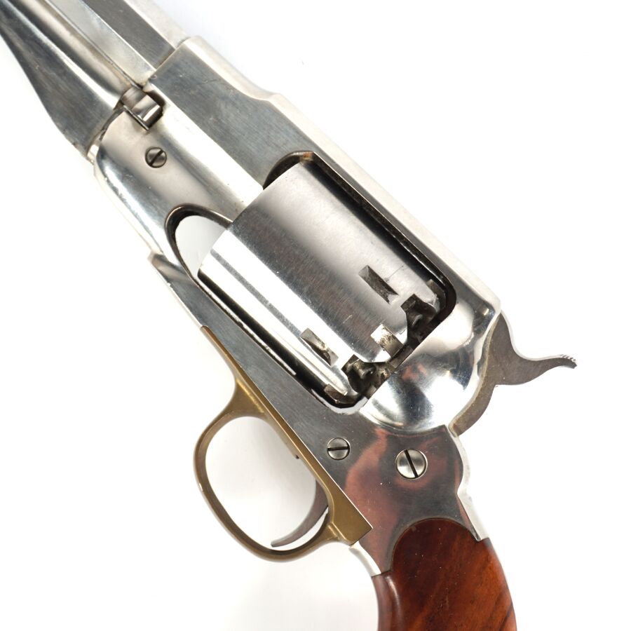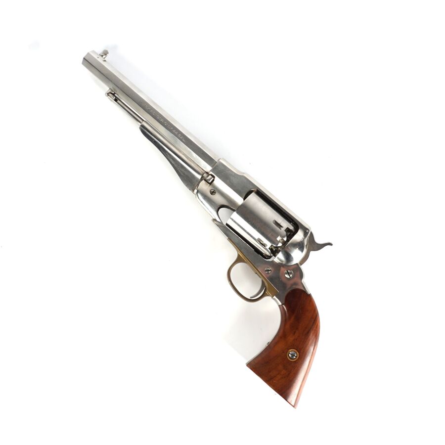Réplique de REVOLVER US MODELE 1858 NEW MODEL ARMY de MARQUE F.LLI PIETTA, calibre 44 à poudre noire, 6 coups, simple action, carcasse et canon inox de 20cm, pontet en laiton, tige d'extraction sous canon, plaquettes de la poignée en noyer, arme numéro 105085, catégorie D collection en vente libre, mécanisme semblant fonctionnel, longueur totale : 35 cm, BE.