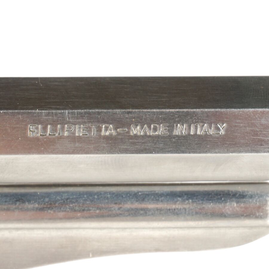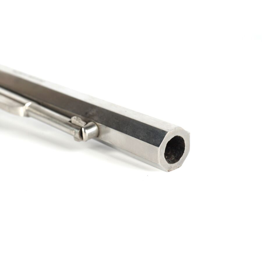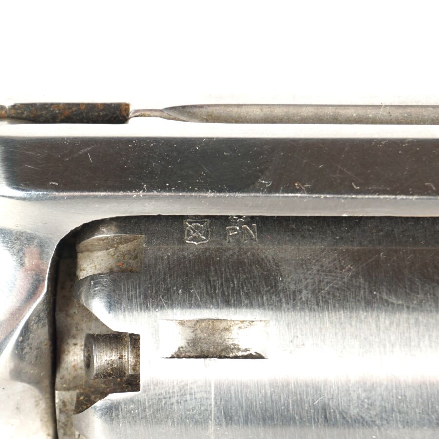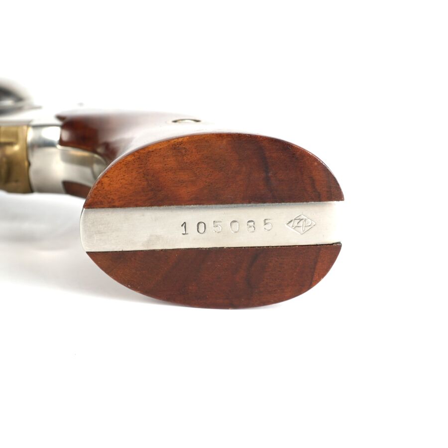 Réplique de REVOLVER US MODELE 1858 NEW MODEL ARMY de MARQUE F.LLI PIETTA, calibre 44 à poudre noire, 6 coups, simple action, carcasse et canon inox de 20cm, pontet en laiton, tige d'extraction sous canon, plaquettes de la poignée en noyer, arme numéro 105085, catégorie D collection en vente libre, mécanisme semblant fonctionnel, longueur totale : 35 cm, BE.