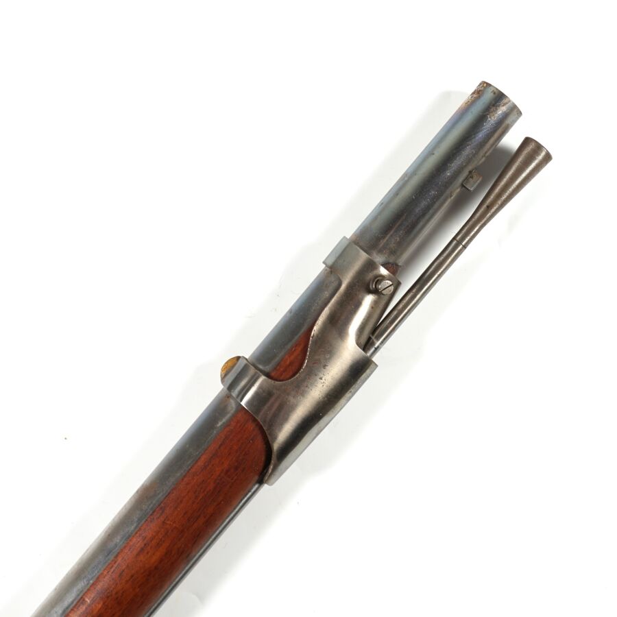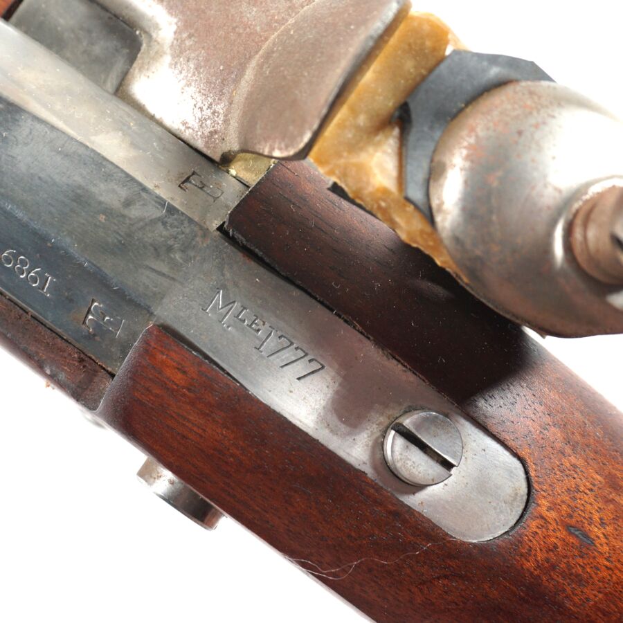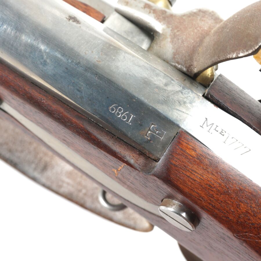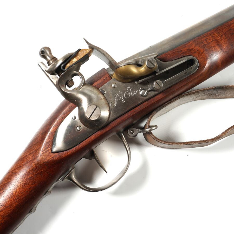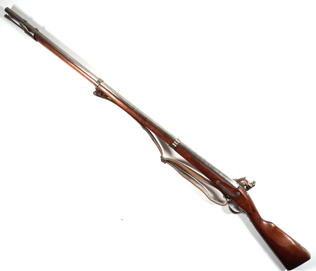 Réplique du FUSIL D'INFANTERIE MODELE 1777 pour le bicentenaire de la Révolution Française par PEDERSOLI, platine à silex à corps ronds marquée " St Etienne ", bassinet en laiton, canon rond de 114 cm à méplat au tonnerre daté " 1889 ", garnitures en fer, monture à long fût en noyer, longueur totale 152 cm, baguette en fer, mécanisme semblant fonctionnel, bretelle en cuir, BE/TBE.