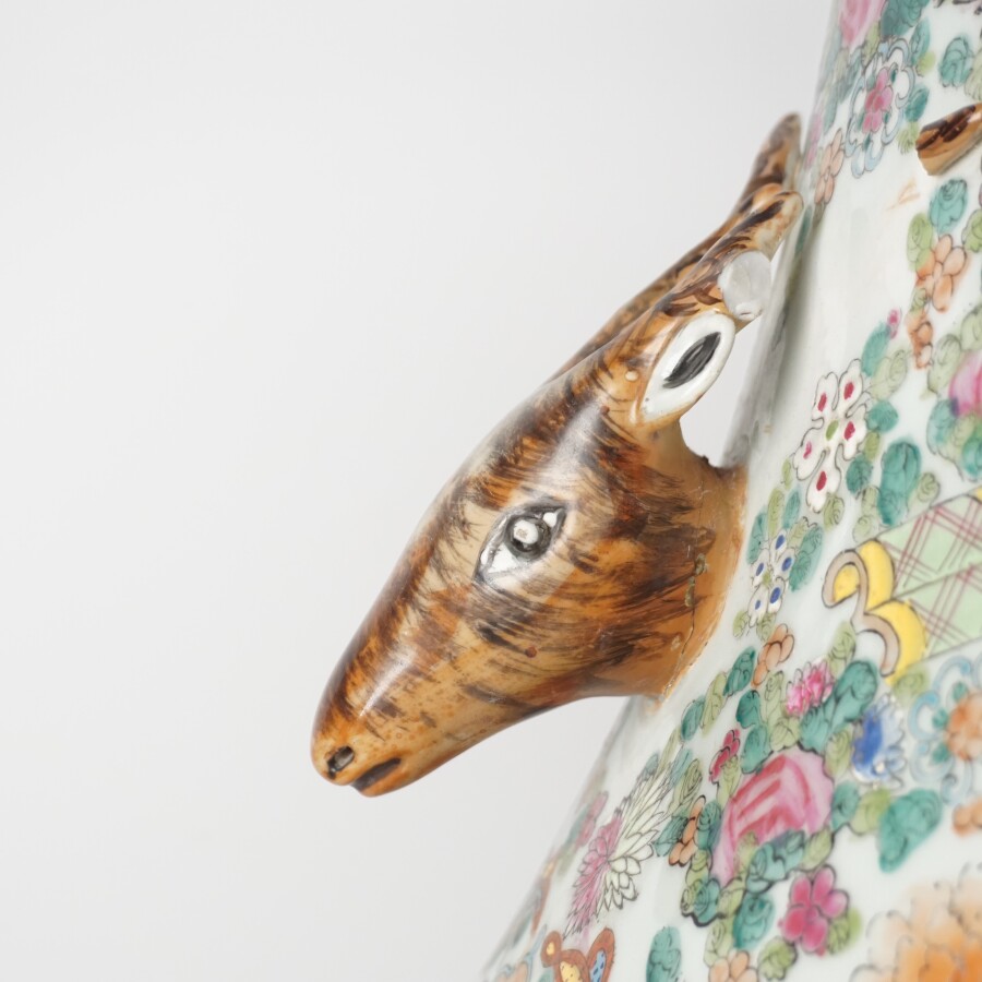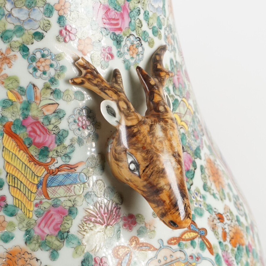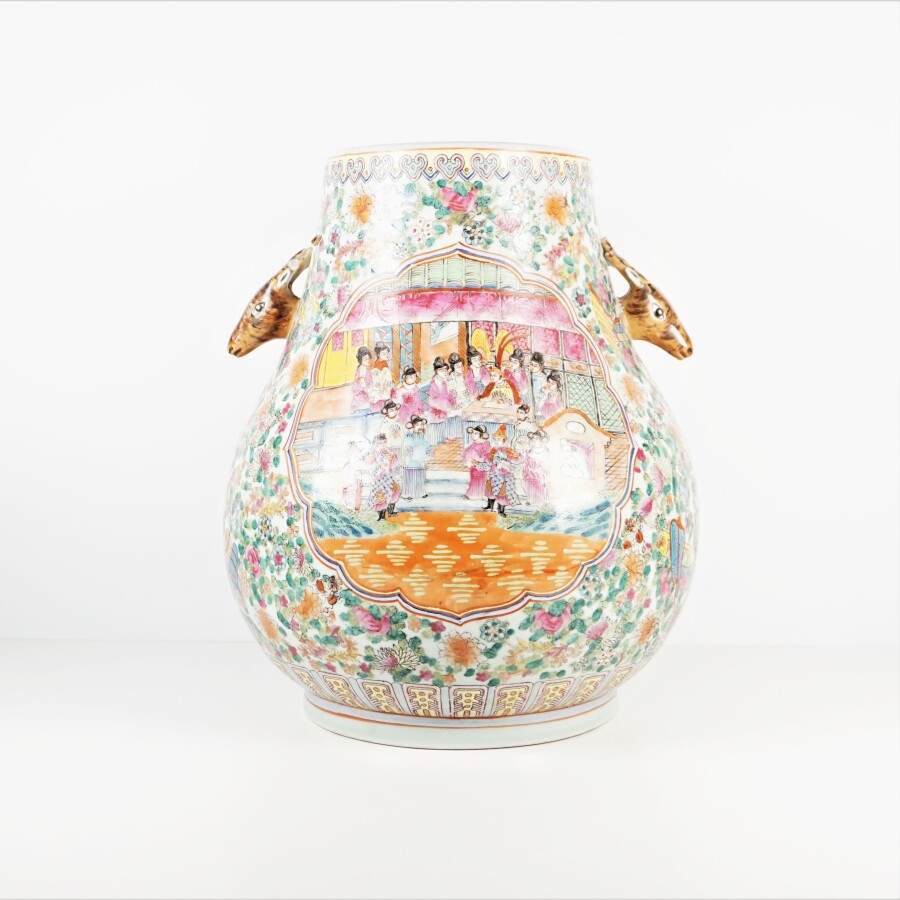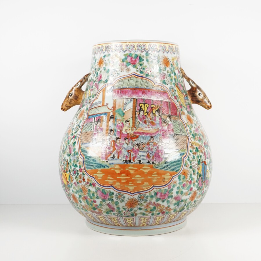 REPRENDRE Important vase Hu en porcelaine et émaux dans le style de la famille rose à décor en médaillons de scènes de personnages et dignitaires, décor des "mille fleurs" et objets mobiliers, les anses figurant des têtes de daims ornent la base du col, Chine, Canton, 20ème siècle, H. 47.5 cm (deux manques et éclat).