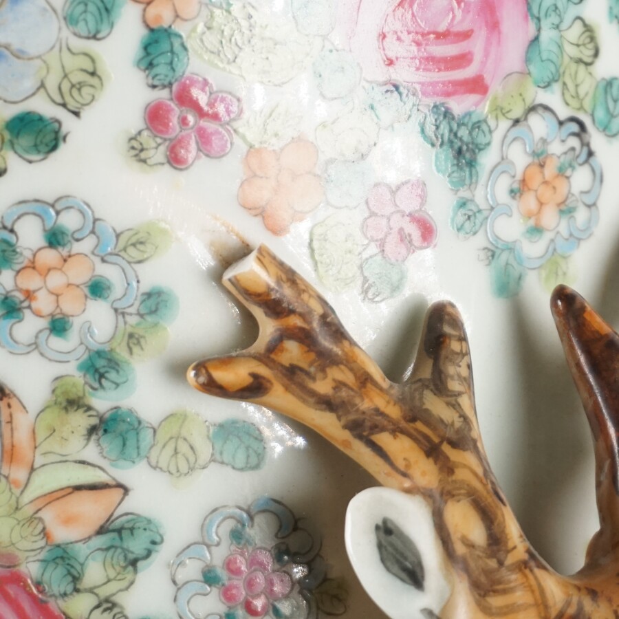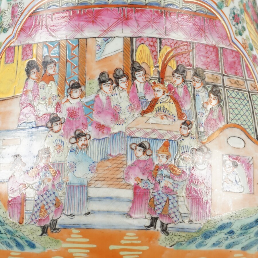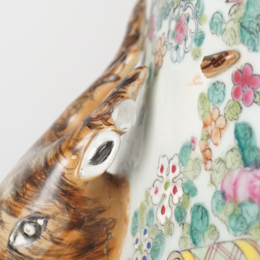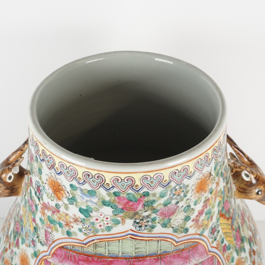 REPRENDRE Important vase Hu en porcelaine et émaux dans le style de la famille rose à décor en médaillons de scènes de personnages et dignitaires, décor des "mille fleurs" et objets mobiliers, les anses figurant des têtes de daims ornent la base du col, Chine, Canton, 20ème siècle, H. 47.5 cm (deux manques et éclat).