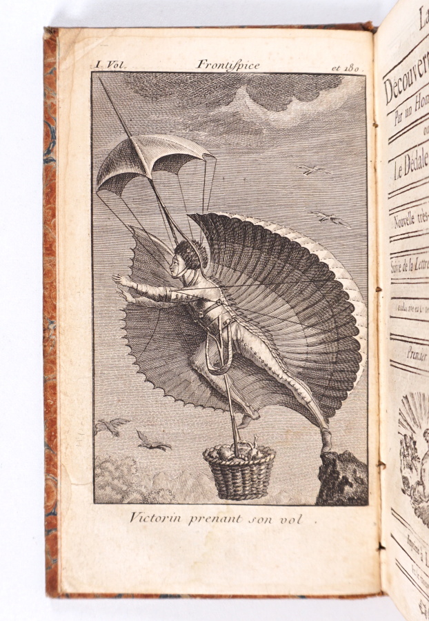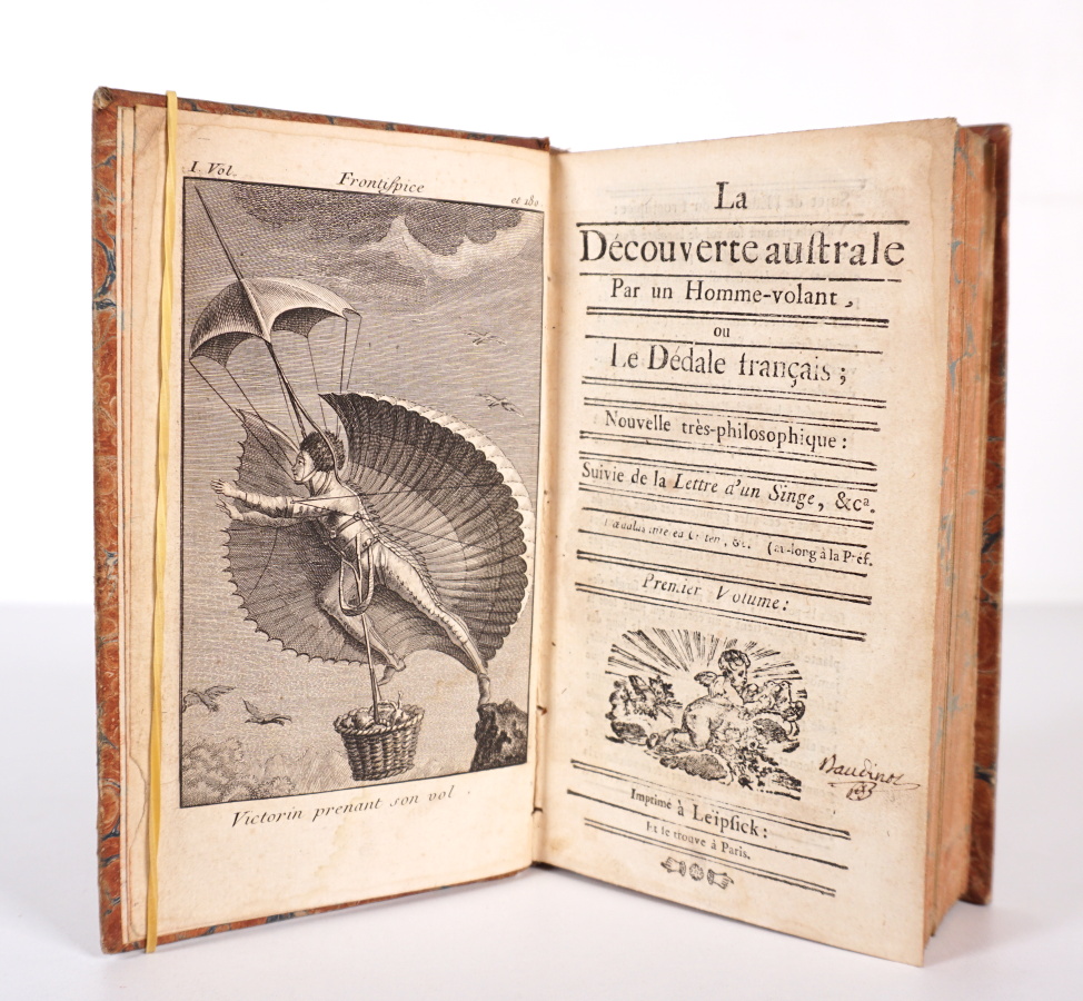 [RESTIF de LA BRETONNE (Nicolas)] - La Découverte australe par un Homme-volant, ou le Dédale français ; Nouvelle très-philosophique : Suivie de la Lettre d'un singe, &ca [Au 1er faux titre :] OEuvres posthumes de N.******* OEuvre S.de, La découverte australes, ou les antipodes : avec une estampe à chaque fait principal - Imprimé à Leïpsick et se trouve à Paris ; Sans nom, 1781 - 4 tomes en 2 volumes In-12° - Tome I : Frontispice, 240 pages, 3 figures - Tome II : Frontispice, pagination 241 à 436 y compris le titre, 15 figures - Tome III : Frontispice, pagination 437 à 624, 1 figure et 85 pp. mal chiffrées 92 (de nombreuses erreurs de pagination avec incohérences, 7 pages manquantes, lesquelles ? (feuillets signés : A2 alfabet [page de titre puis :] a 2-aa6 - b-b12 - c-c12 - d-d8 - e-e4) - Tome IV : Frontispice sur double page, pagination 93 à 334 pages (sans les diatribes indiqués sur le faux titre de la suite du tome III occupant les pages 337 à 422 comme souvent, sans les 5 feuillets non chiffrés composés de la note, sans titre de 6 pages, de la table des figures et des pièces contenues dans les 4 volumes ainsi que la liste des ouvrages de l'auteur - De très rares et petites rousseurs éparses, quelques feuillets jaunis, feuillet des pages 283-284 du tome II déchiré sur 5 cm sans perte, marge blanche supérieure du feuillet des pages 387-388 du même tome déchirée avec manque, marge blanche supérieure du feuillet des pages 151-152 du tome IV déchirée avec manque - Reliure de l'époque demi-basane fauve (2 coins légèrement usés, 3 trous de vers aux mors) - Dos lisse ornés de filets, titrés et tomés or (coiffes frottées) - Tranches marbrées - Ex-libris manuscrit ancien aux titre : Baudinot (?) - L'illustration de l'ouvrage, fort curieuse, est composée de 23 figures hors texte représentant l'homme-volant prenant son envol et les créatures hybrides les plus étranges : hommes-castors, hommes-ânes, hommes-éléphants, etc.