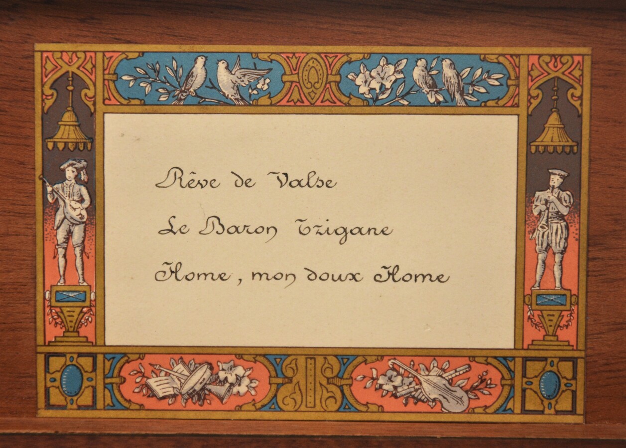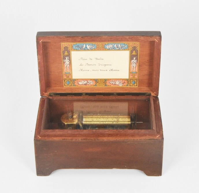 REUGE SAINTE-CROIX : Petite boîte à musique à trois airs "Rêve de Valse", "Le Baron Tzigane" et "Home", avec clé dessous, 8.5 x 16.5 x 10 cm.