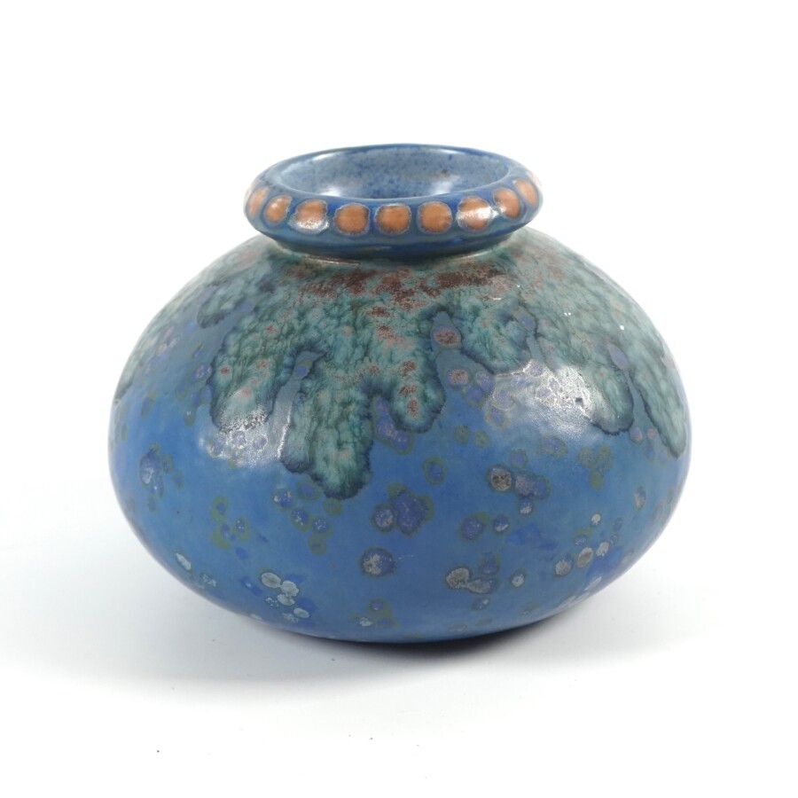 REVERNAY : Petit vase boule, céramique émaillée polychrome à décor végétal sur fond bleu, marqué dessous, numéroté 151, 42B, H. 9 cm.