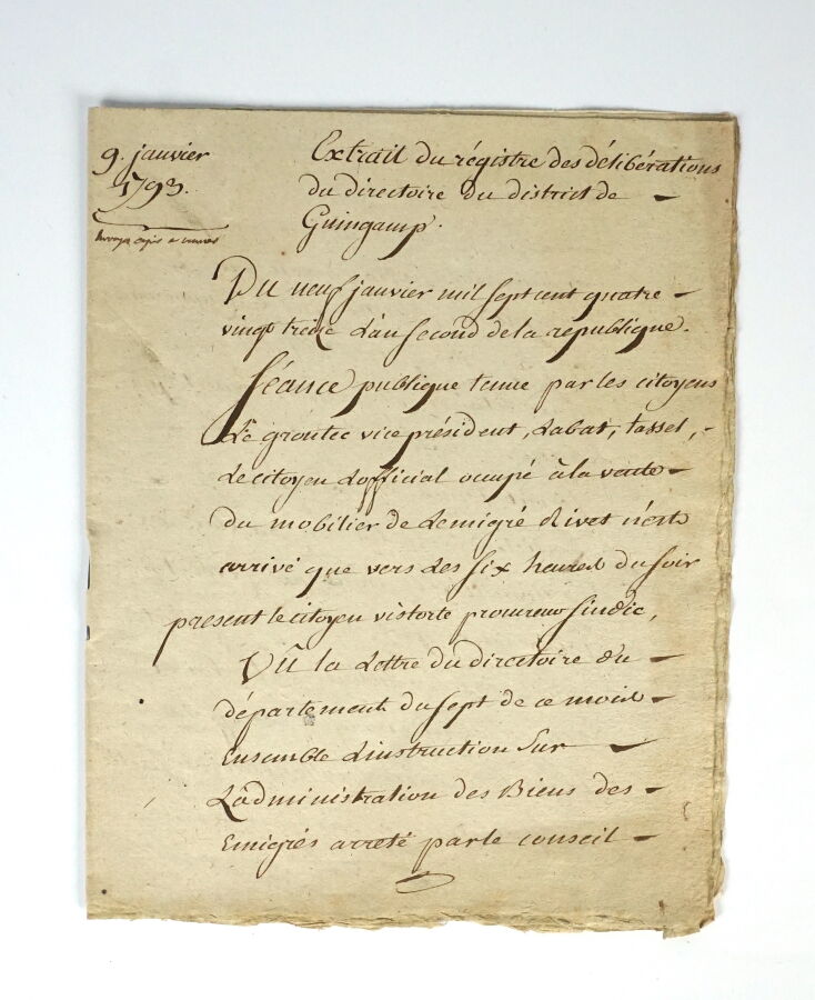 [RÉVOLUTION FRANÇAISE - Bretagne - Guingamp - 1793] - Document manuscrit - Extrait du registre des délibérations du Directoire du District de Guingamp, du 9 janvier 1793, relatif aux gardiens des biens séquestrés des émigrés qui ne pourront plus être : parents, domestiques, agents ou affidés des émigrés et qui devront être remplacés au cas où ils entreraient dans ces catégories - Les commissaires au séquestre seront chargés de renvoyer tous les domestiques des émigrés et de visiter les maisons des émigrés... d'y faire toutes les perquisitions nécessaires... - 4 pages In-4°.