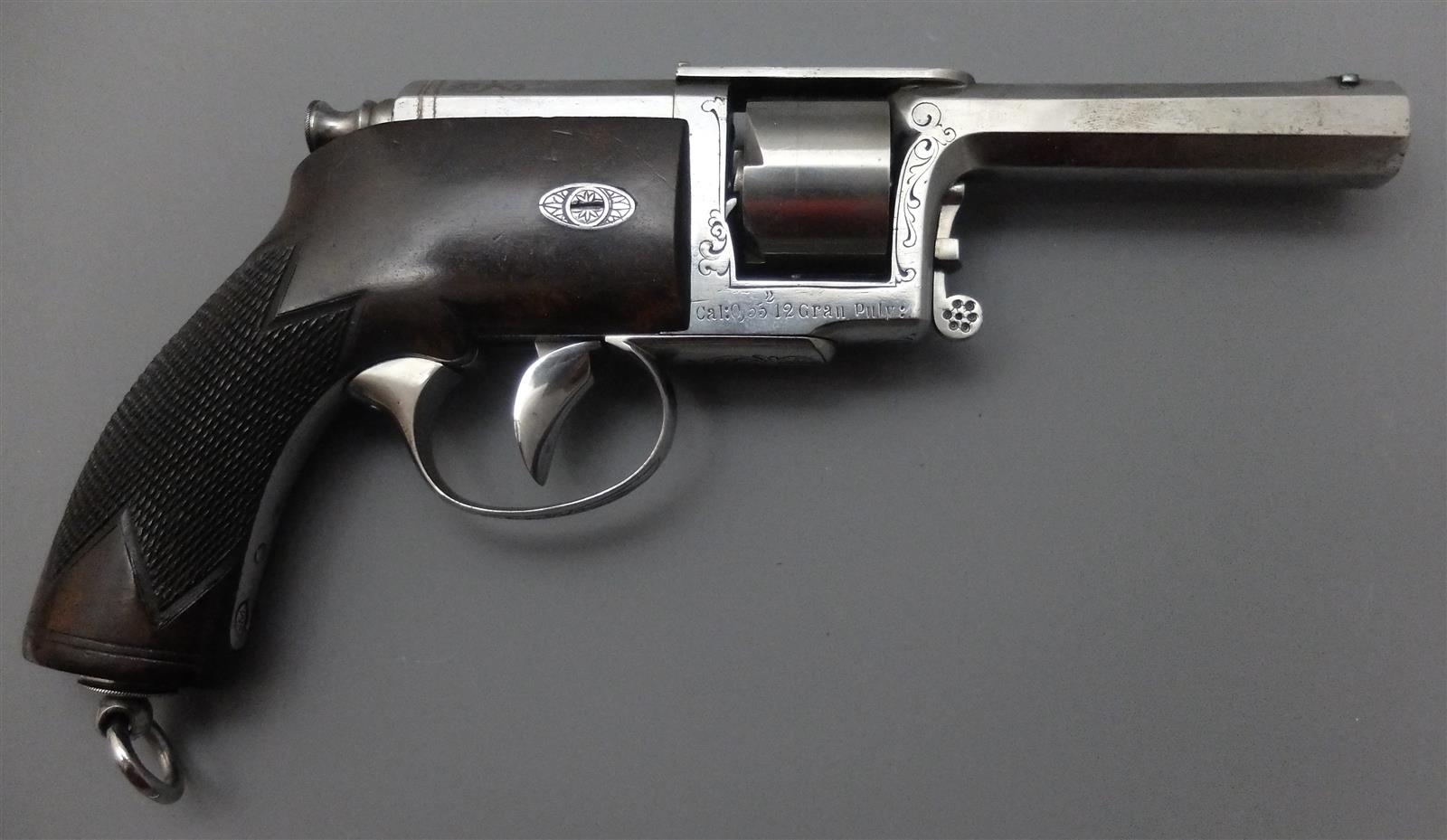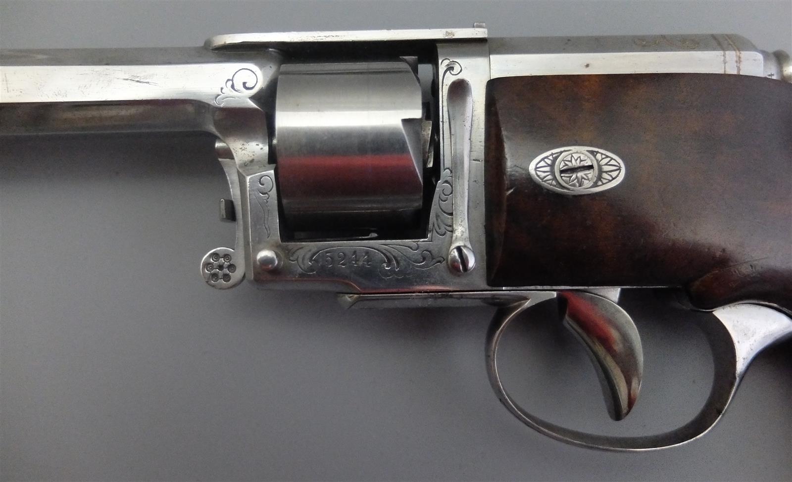 REVOLVER A AIGUILLE DREYSE-KUFAHL, MODELE MEDIUM, calibre 9 mm, 6 coups, double action, carcasse marquée sur le dessus du barillet " V.DREYSE SOMMERDA " et sur un des côtés " Cal : 0,35 12 gran Pulv ", canon lourd à pans, pan supérieur marqué en caractères japonais " 1887 (20ème année Meiji) 833 et le nom du militaire ", garnitures en fer à décor gravé de rinceaux feuillagés, crosse en noyer en partie quadrillée, anneau de calotte, finition poli blanc, mécanisme semblant fonctionnel, longueur : 27 cm, BE/TBE.