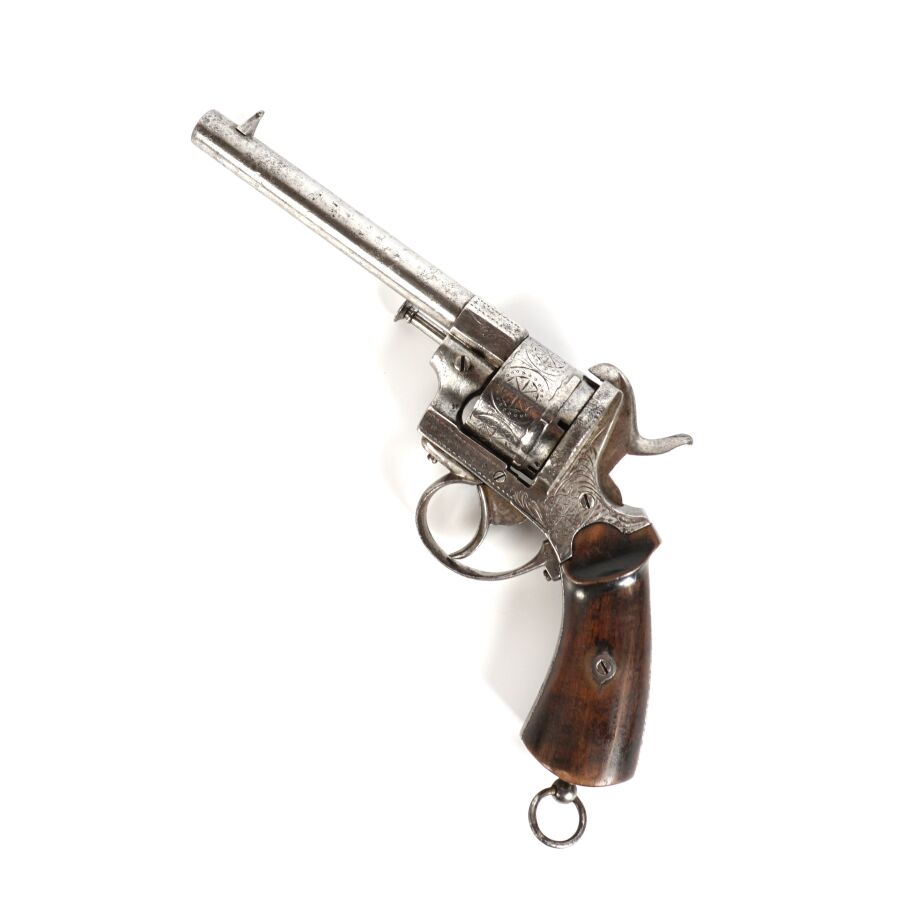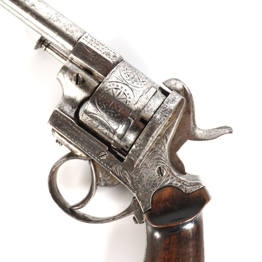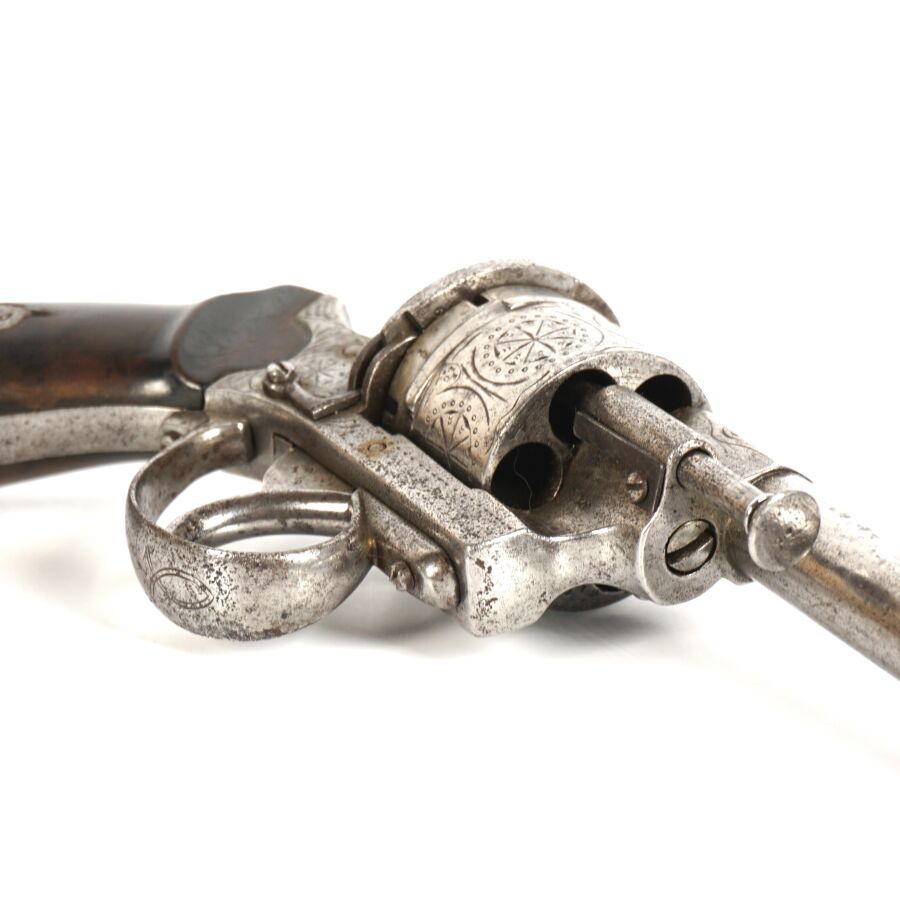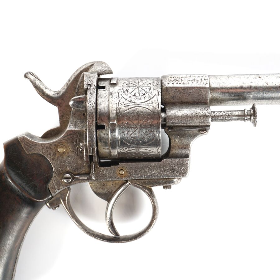 REVOLVER A BROCHE, calibre 12 mm, 6 coups, carcasse ouverte légèrement gravée, canon rond de 14,5 cm (piqures à l'extérieur), plaquettes de la crosse en bois, anneau de calotte, mécanisme semblant fonctionnel, vers 1860-1870, longueur : 25 cm, BE.