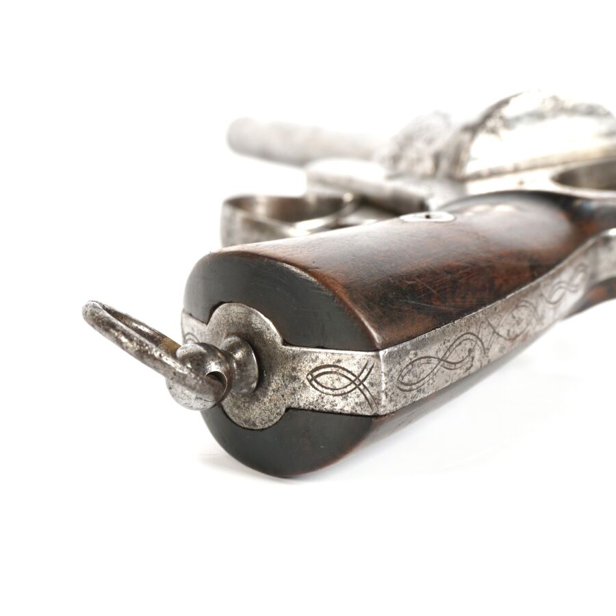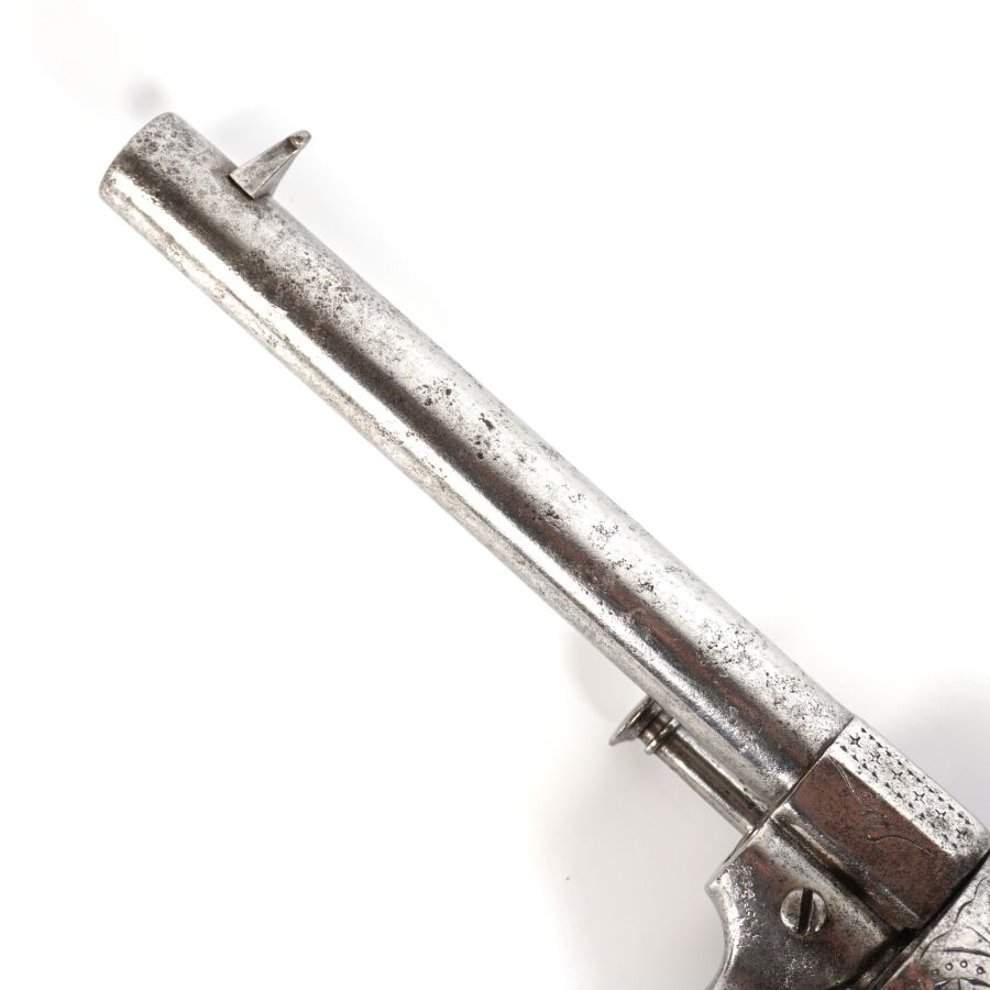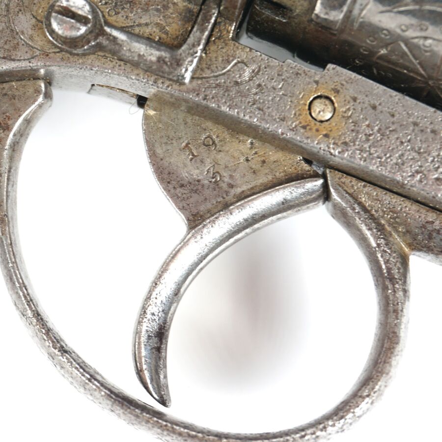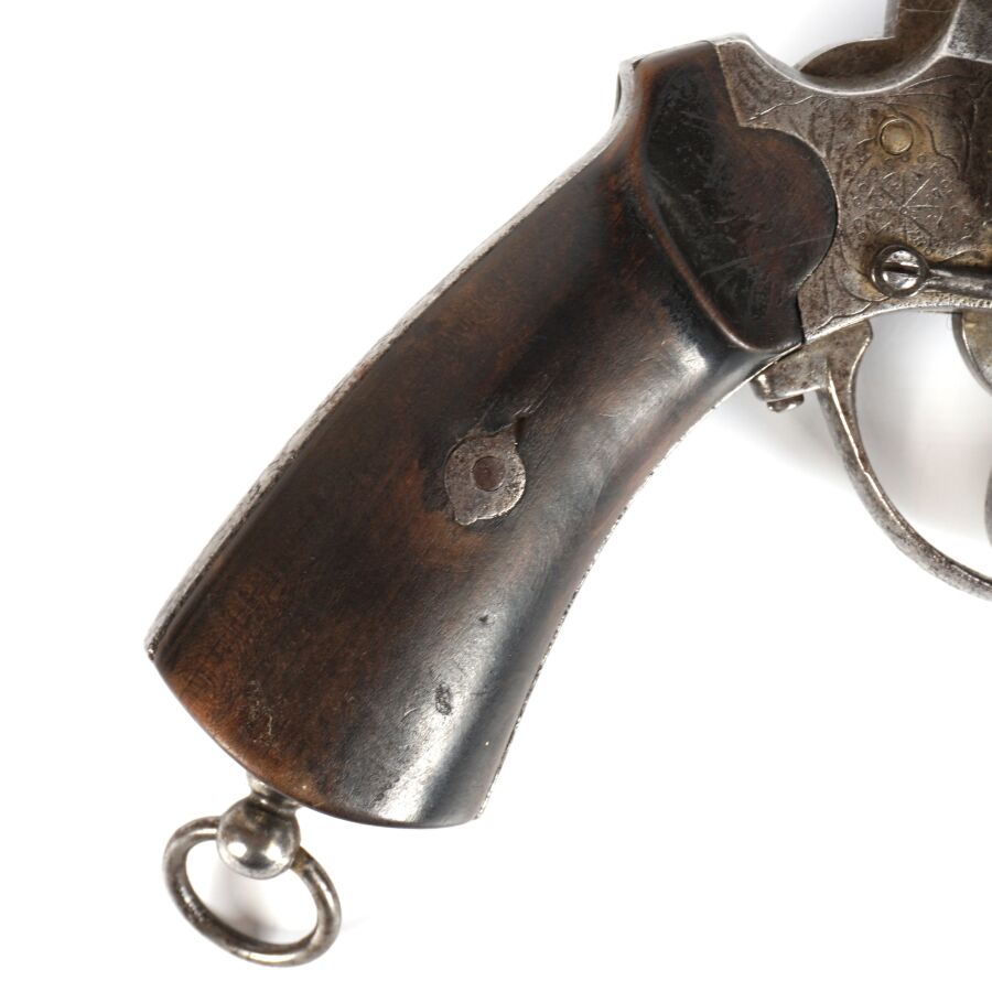 REVOLVER A BROCHE, calibre 12 mm, 6 coups, carcasse ouverte légèrement gravée, canon rond de 14,5 cm (piqures à l'extérieur), plaquettes de la crosse en bois, anneau de calotte, mécanisme semblant fonctionnel, vers 1860-1870, longueur : 25 cm, BE.