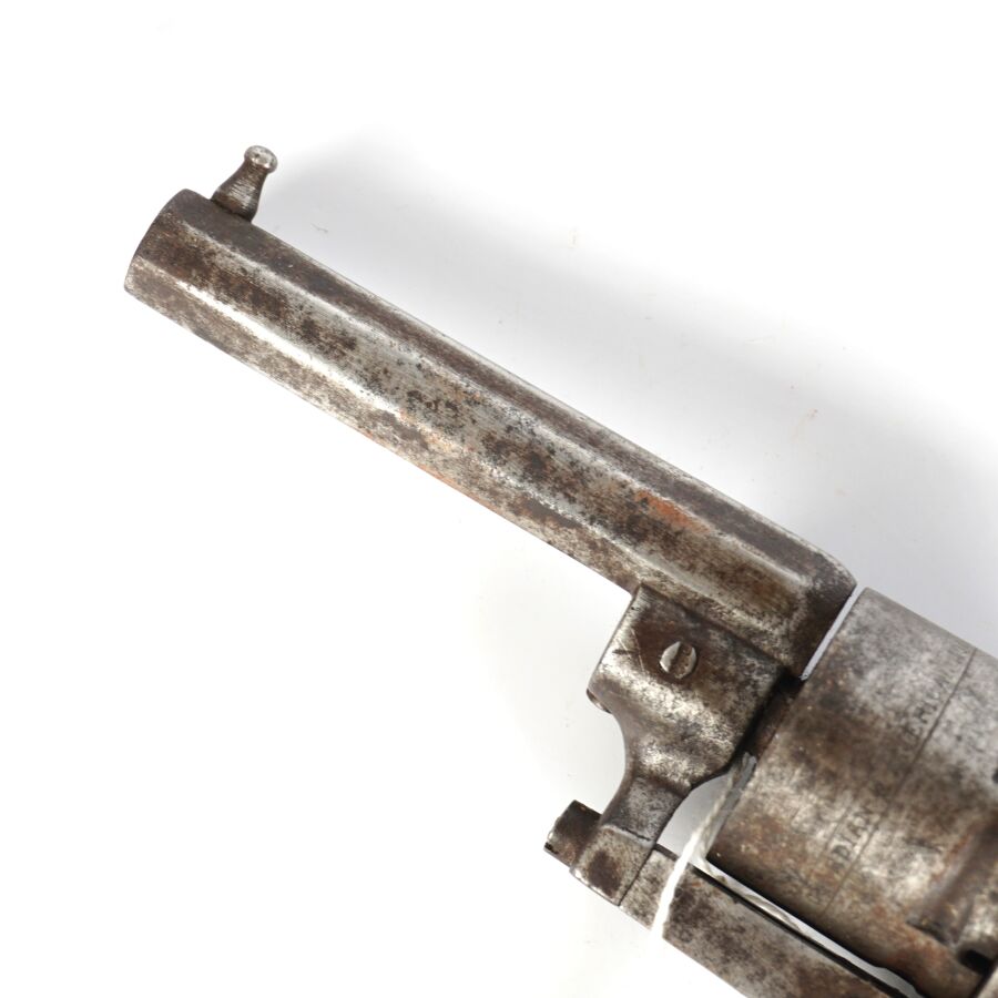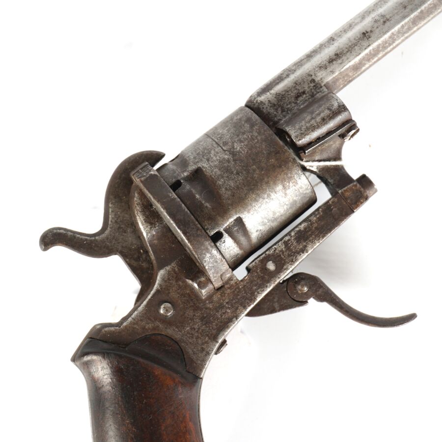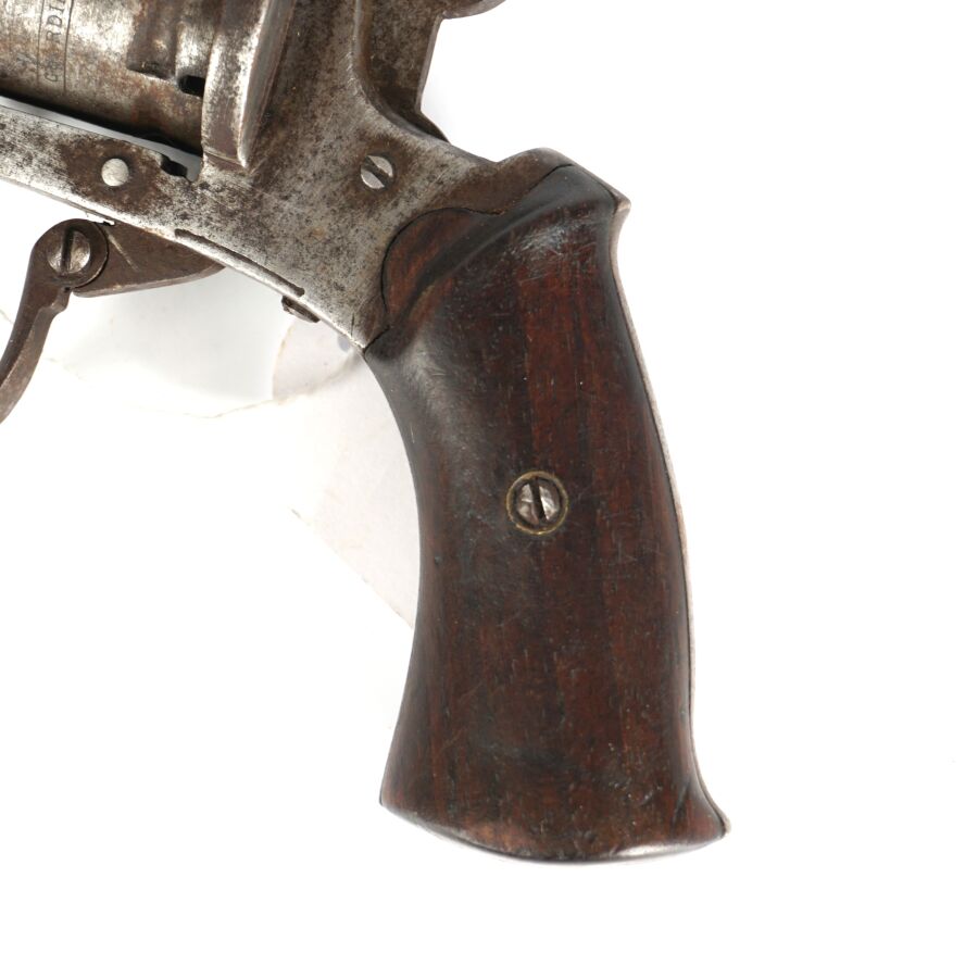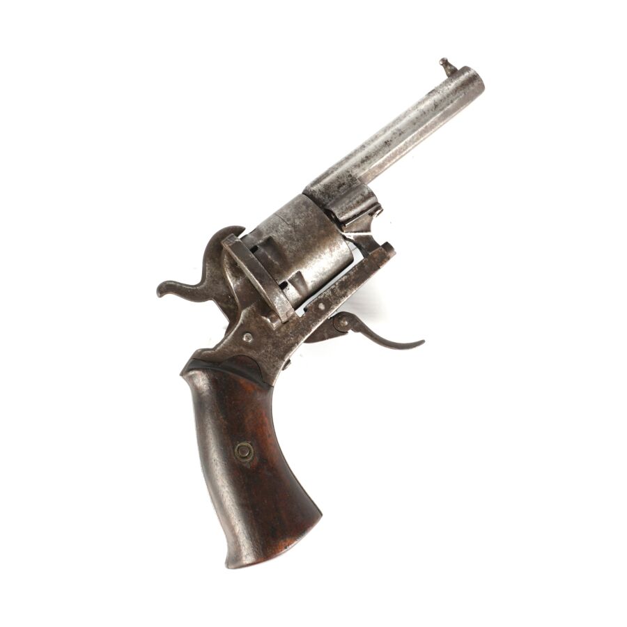 REVOLVER A BROCHE LIEGEOIS, calibres 9 mm, 6 coups, double action, carcasse ouverte, barillet marqué " The Guardian, American model of 1878 ", canon à pans de 7.5 cm, détente pliante, manque la tige d'extraction, plaquettes de la poignée en noyer (coups), longueur totale : 18 cm, mécanisme non fonctionnel (indexation barillet et mécanisme du chien et de la détente à revoir), DANS L'ETAT.