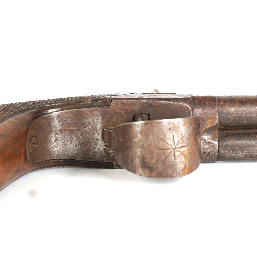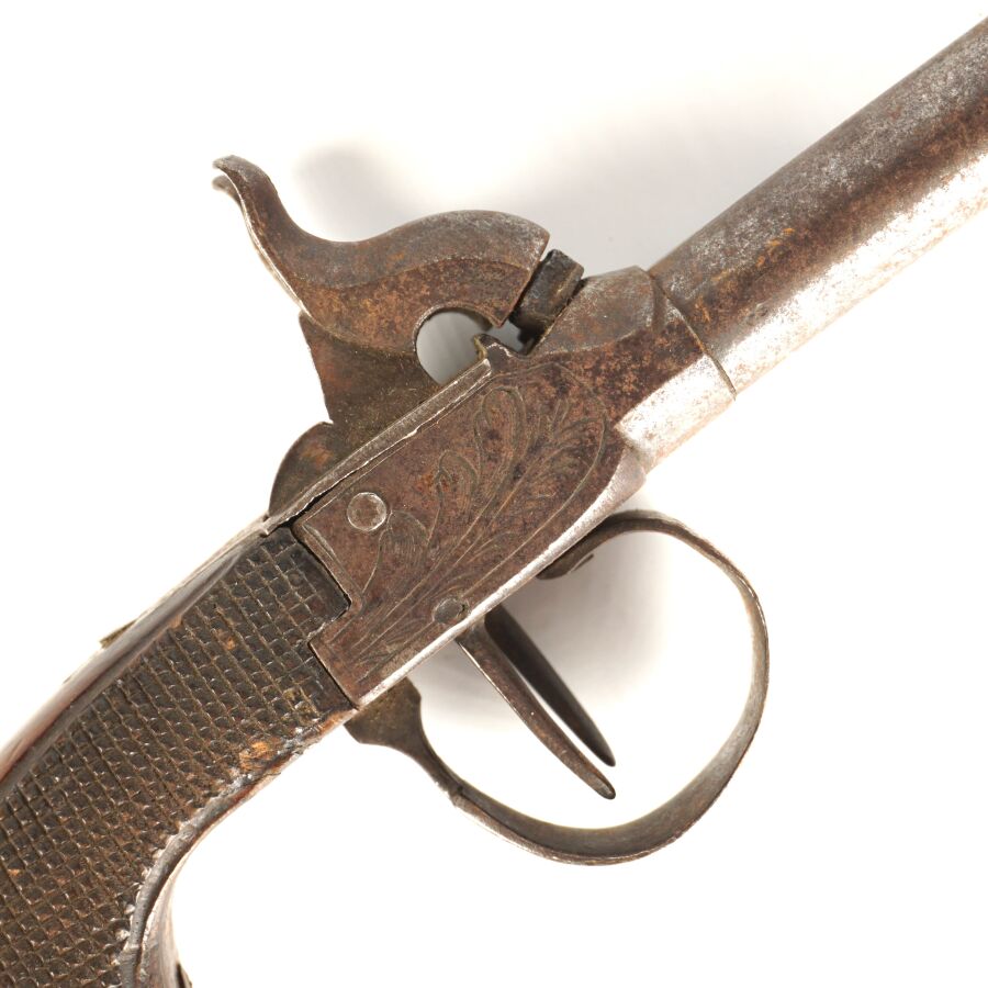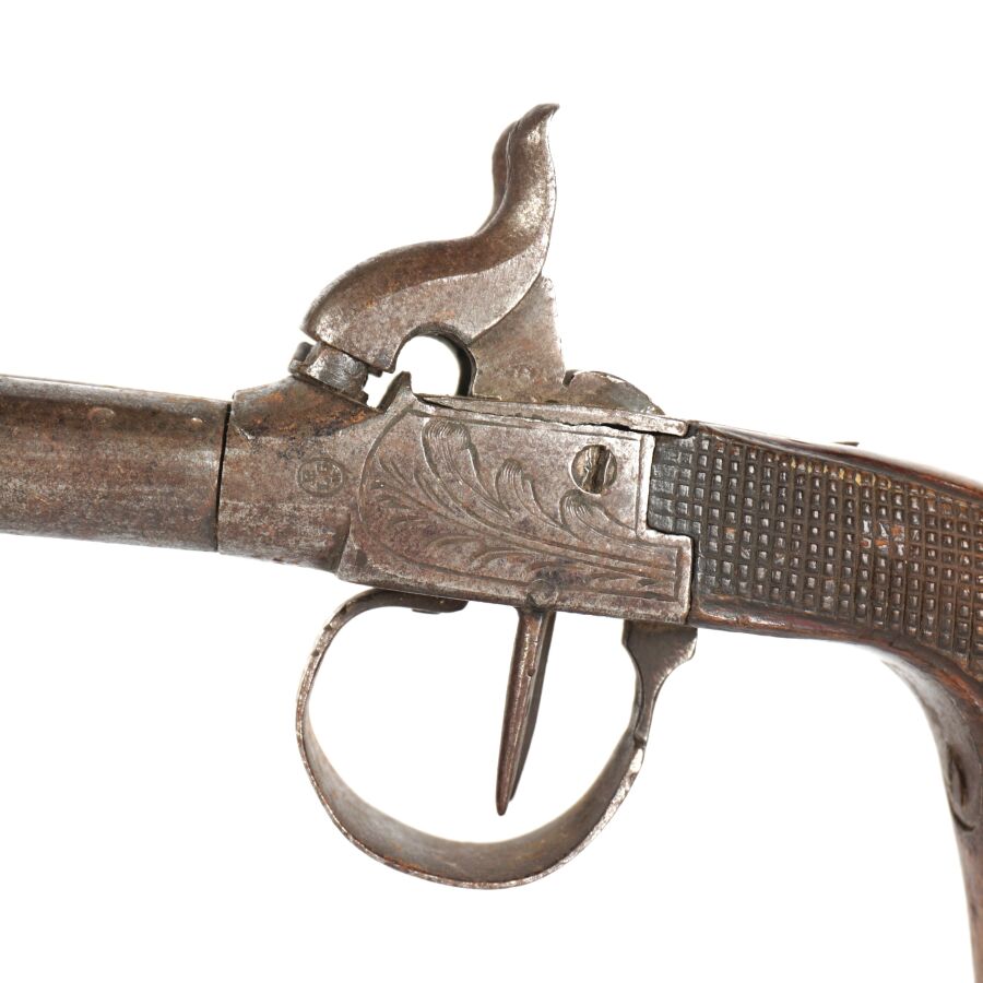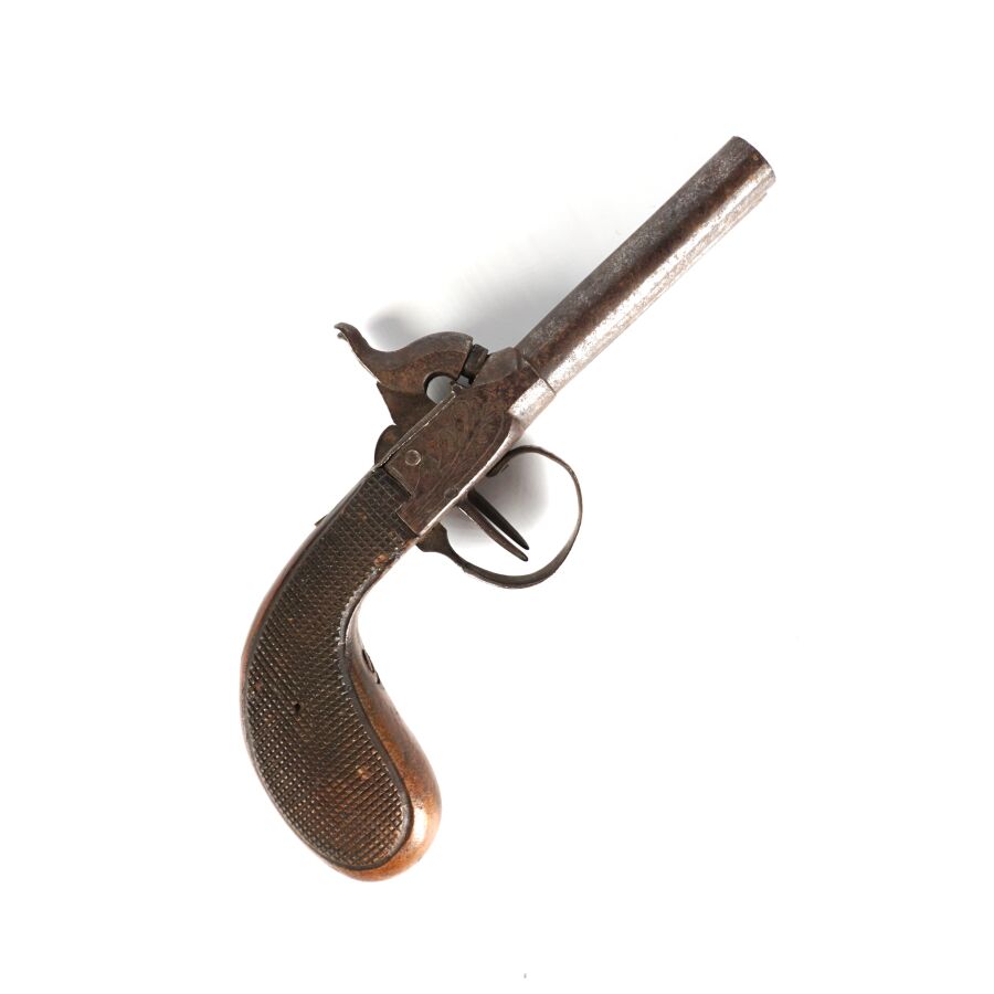 REVOLVER A PERCUSSION A COFFRE A BALLE FORCEE A DEUX CANONS EN TABLE, platine a coffre à percussion à décor gravé de rinceaux, canons à balle forcée de 7,5 cm, crosse en noyer finement quadrillé avec pièce de pouce, mécanisme semblant fonctionnel, longueur : 18,5 cm, vers 1840, BE.