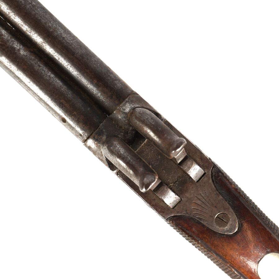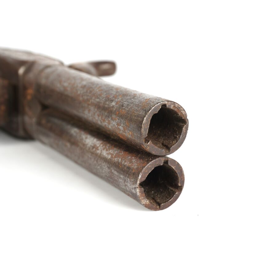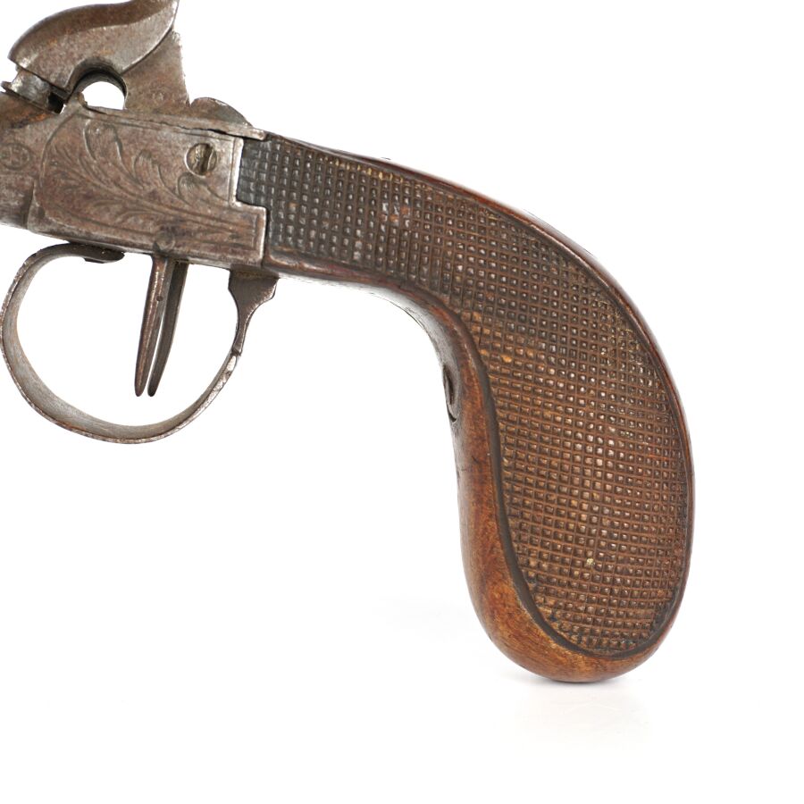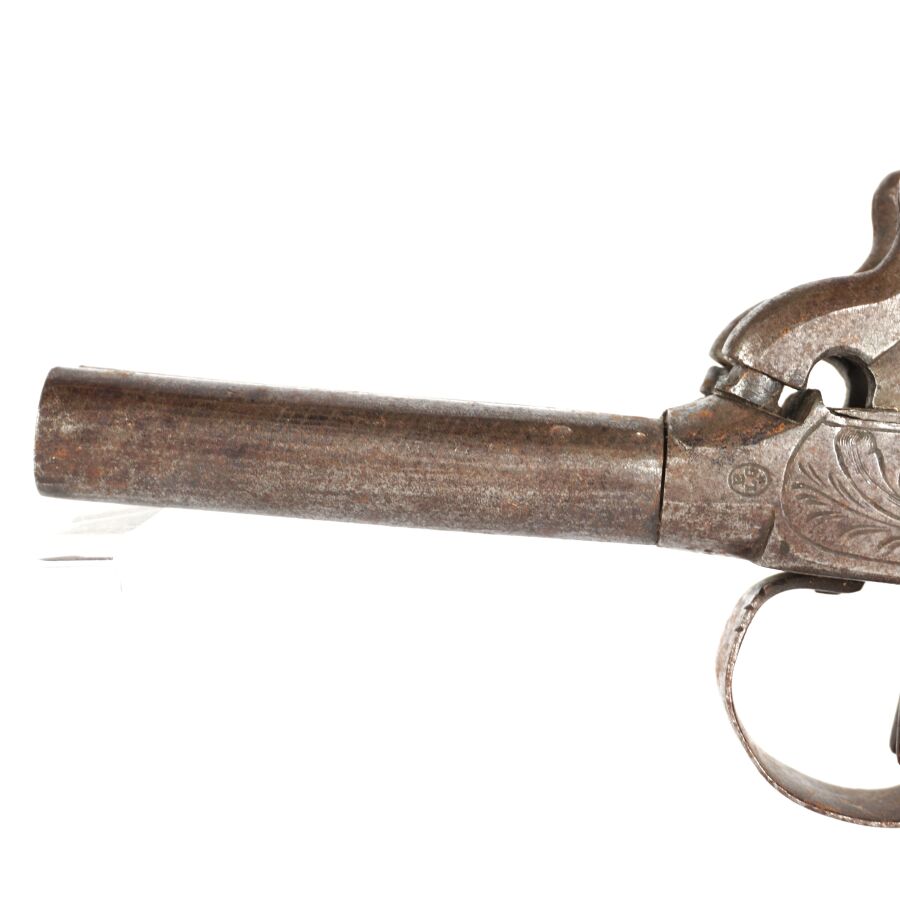 REVOLVER A PERCUSSION A COFFRE A BALLE FORCEE A DEUX CANONS EN TABLE, platine a coffre à percussion à décor gravé de rinceaux, canons à balle forcée de 7,5 cm, crosse en noyer finement quadrillé avec pièce de pouce, mécanisme semblant fonctionnel, longueur : 18,5 cm, vers 1840, BE.