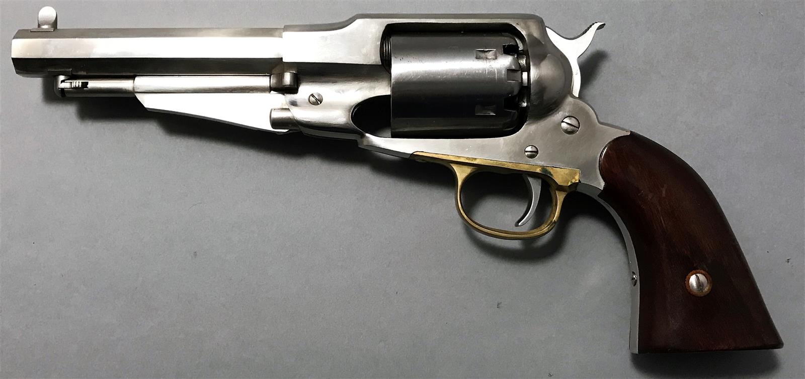 REVOLVER A POUDRE NOIRE, calibre 44 à poudre noire, 6 coups, simple action, carcasse fermée en acier poli blanc, pontet en laiton, canon à pans de 14 cm (5,5''), tige d'extraction, plaquettes de la poignée en bois, arme numéro : A74227, année de fabrication : 2009 (CD), longueur : 28,5 cm, mécanisme en bon état de fonctionnement, TBE.