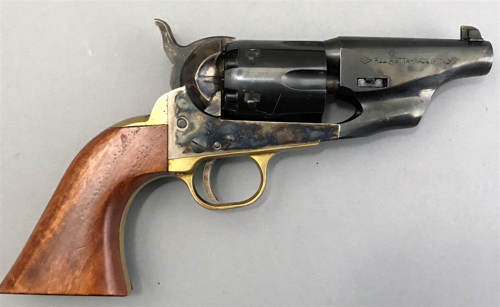 REVOLVER A POUDRE NOIRE DE MARQUE PIETTA-FAP, MODELE POLICE POCKET 1862, calibre 36 à poudre noire, 6 coups, simple action, carcasse en acier jaspé, barillet cannelé et canon rond de 7,5 cm (3'') en acier bronzé noir, manque la tige d'extraction, pontet en laiton, arme numéro P81471, année de fabrication : 2003 (BT), longueur : 22 cm, mécanisme en bon état de fonctionnement, ABE.
