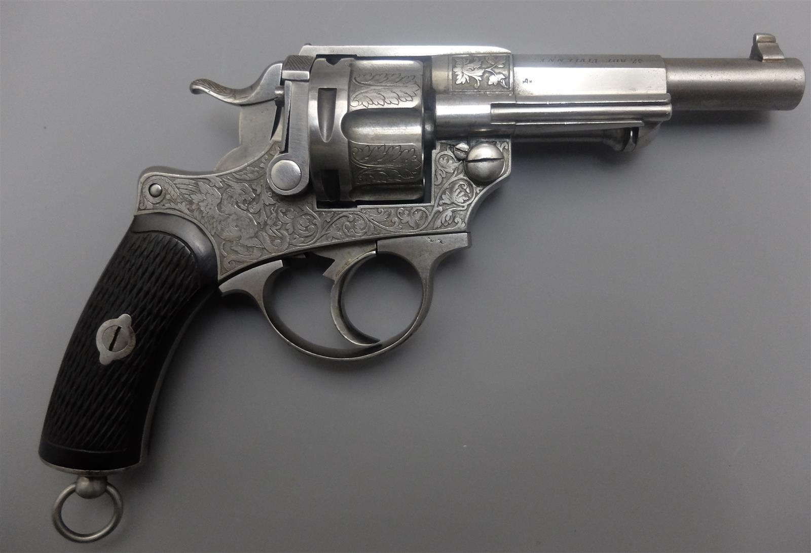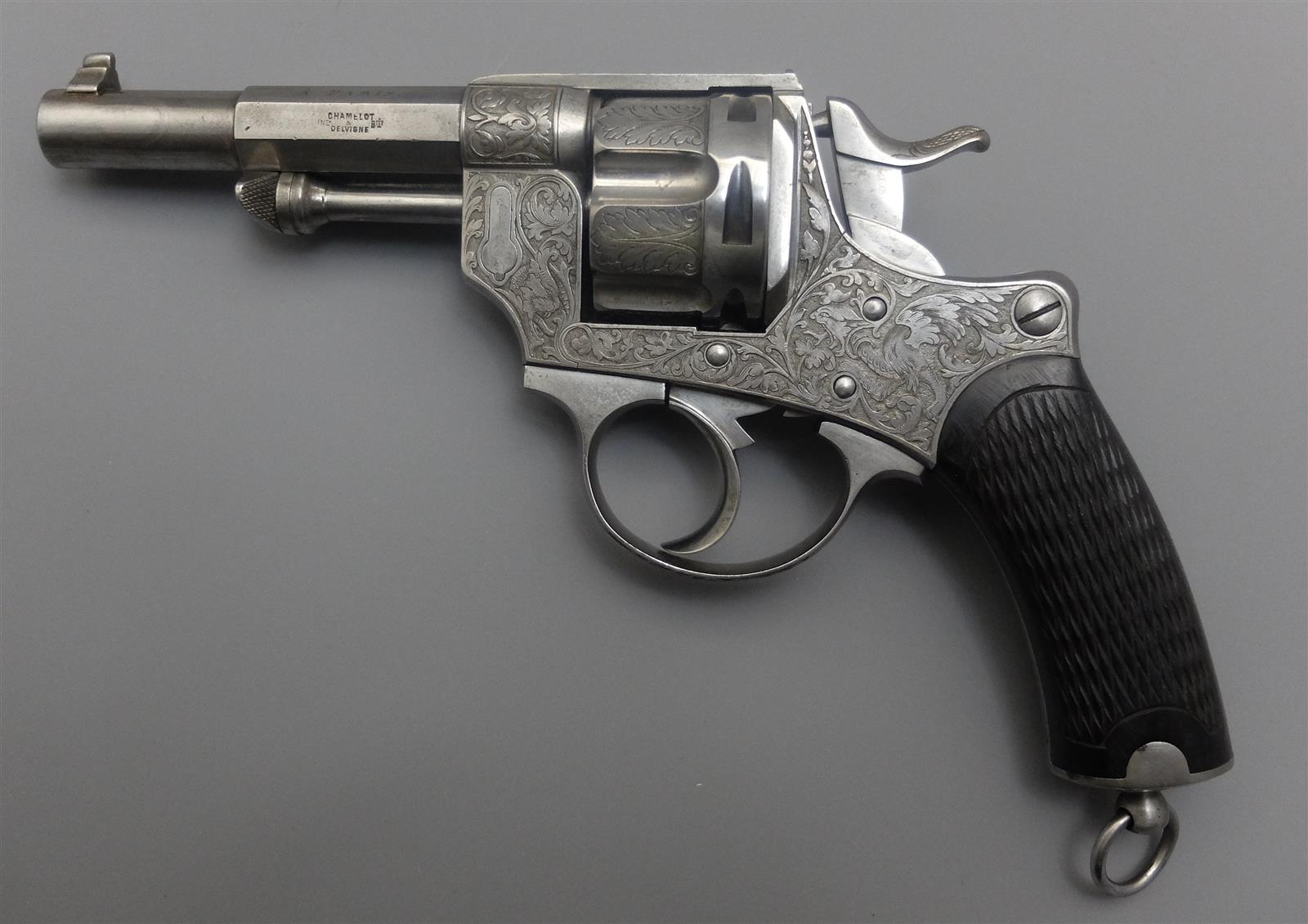 REVOLVER CHAMELOT & DELVIGNE TYPE 1874 - MODELE DE LUXE LEFAUCHEUX - HENRY RIEGER SUCCESSEUR, calibre 11 mm 73, 6 coups, double action, carcasse à décor richement gravé de rinceaux feuillagés et d'animaux fantastiques (fêlure entre le chien et la détente) barillet évidé décoré en suite avec poinçon de Liège, canon à pans puis rond gravé sur le côté sur deux lignes " CHAMELOT & DELVIGNE - Inon Bté " et sur le pan supérieur " LEFAUCHEUX HENRY RIEGER Sr " et sur les deux pans latéraux " 37 RUE VIVIENNE A PARIS ", tige d'extraction, plaquettes de la poignée en ébène finement quadrillé, anneau de calotte, mécanisme semblant fonctionnel, longueur : 24 cm, TBE.