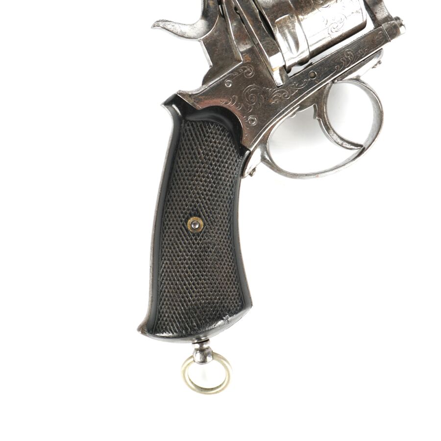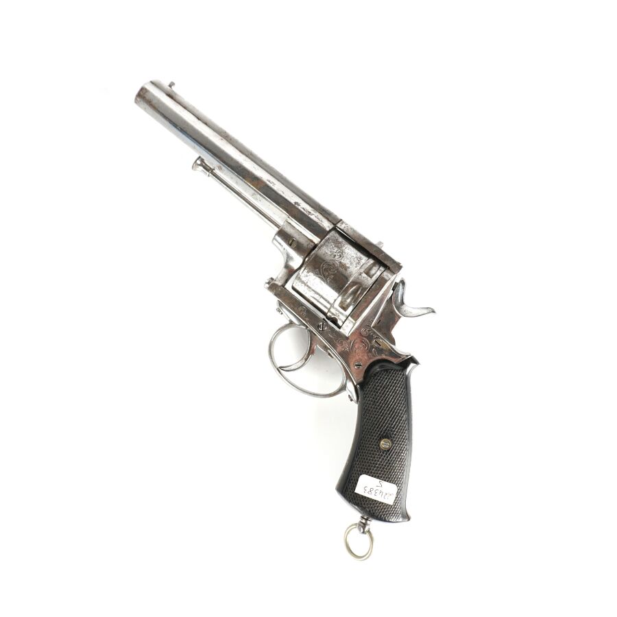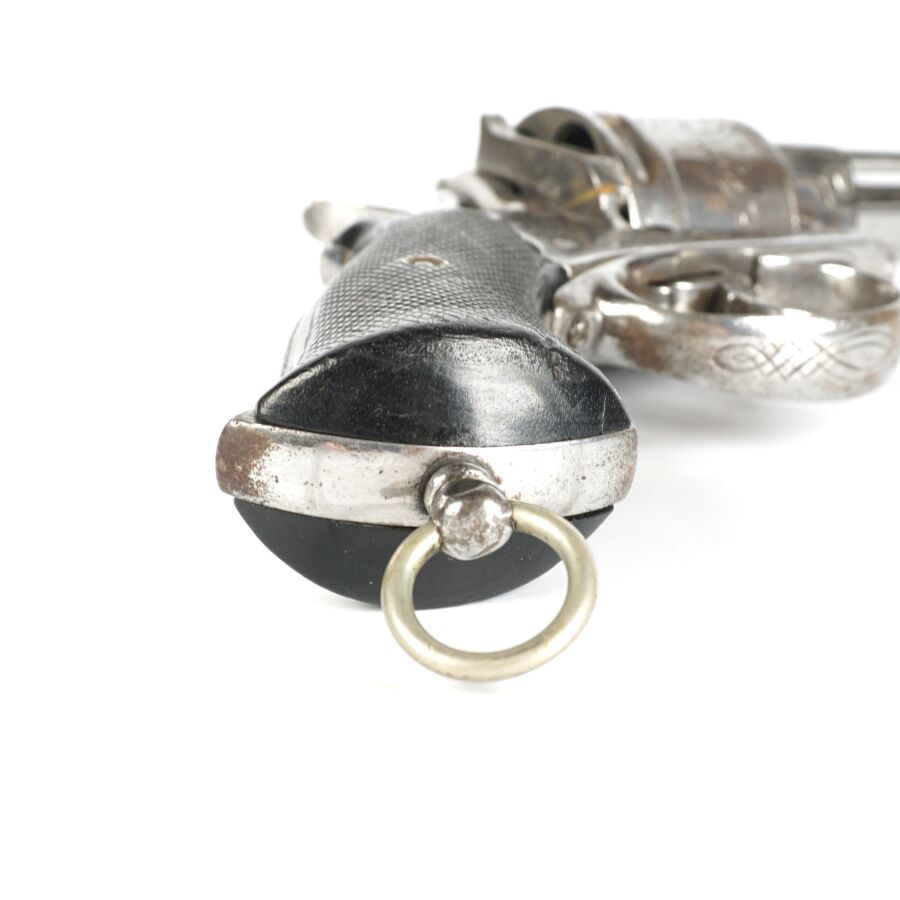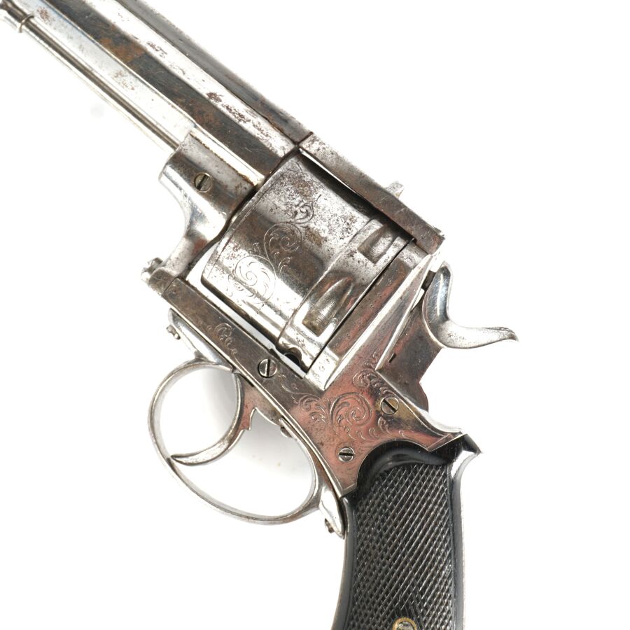 REVOLVER D'ORDONNANCE, calibre environ 11 mm, 6 coups, simple action, carcasse nickelée à décor de rinceaux, tige d'extraction, plaquettes de la crosse en ébonite finement quadrillé, anneau de calotte, mécanisme semblant fonctionnel, longueur : 28 cm,