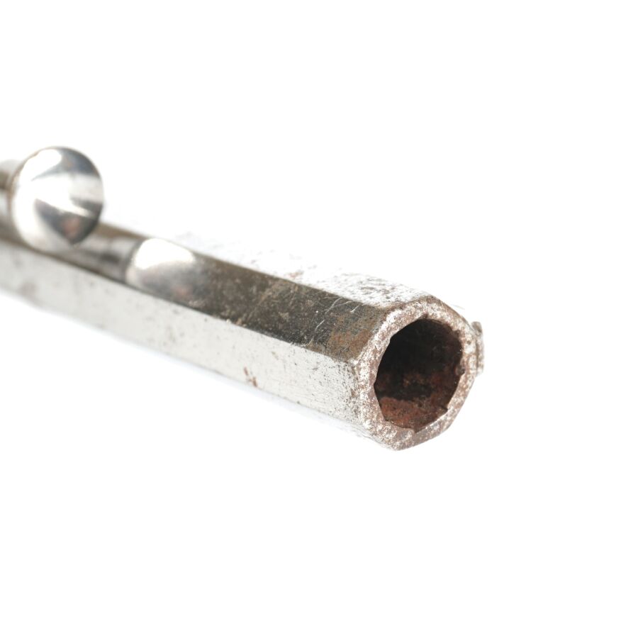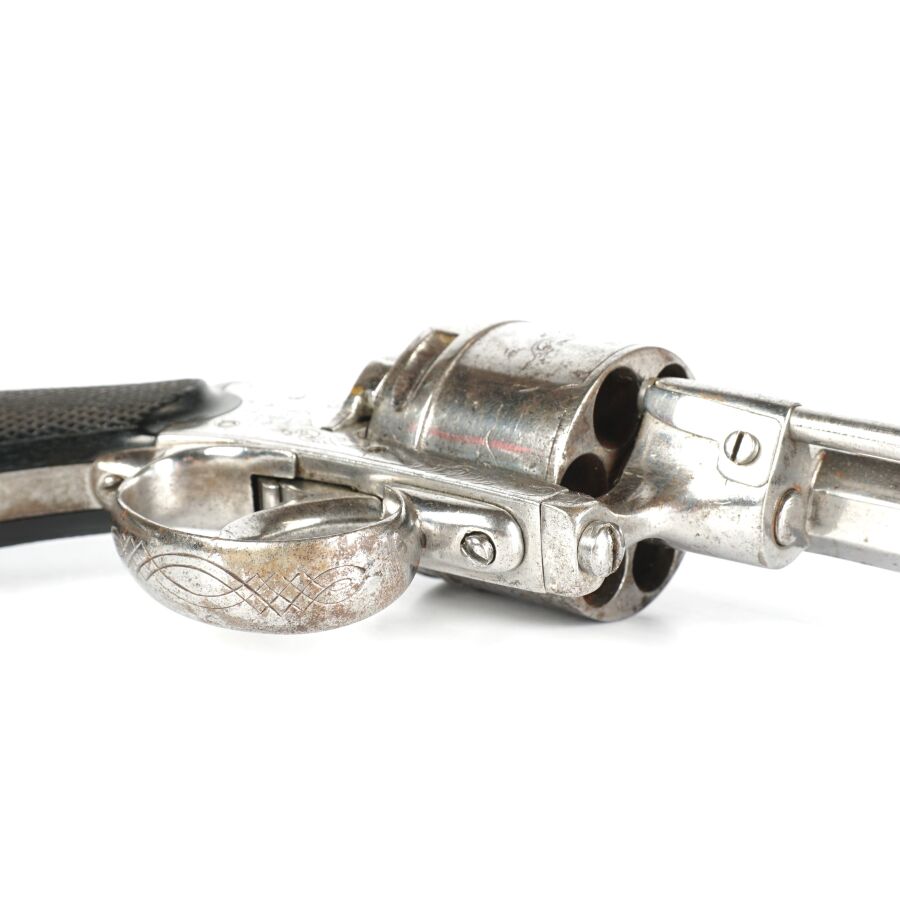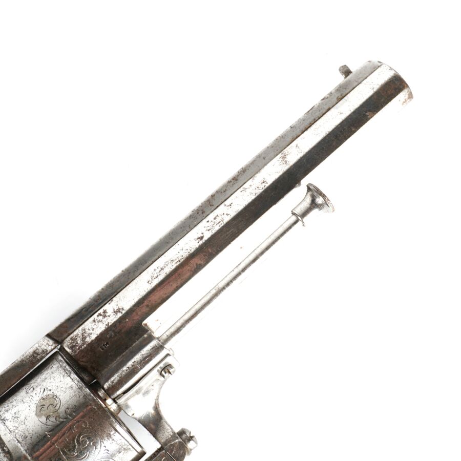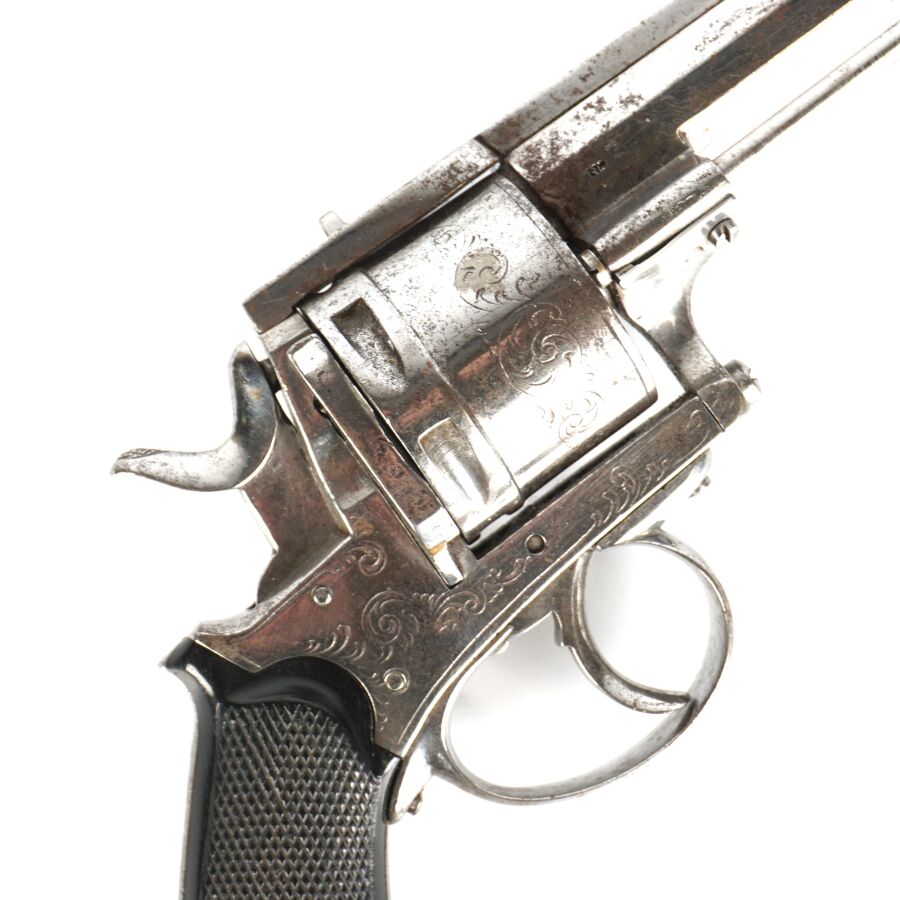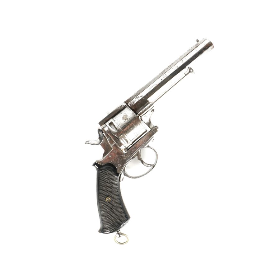 REVOLVER D'ORDONNANCE, calibre environ 11 mm, 6 coups, simple action, carcasse nickelée à décor de rinceaux, tige d'extraction, plaquettes de la crosse en ébonite finement quadrillé, anneau de calotte, mécanisme semblant fonctionnel, longueur : 28 cm,