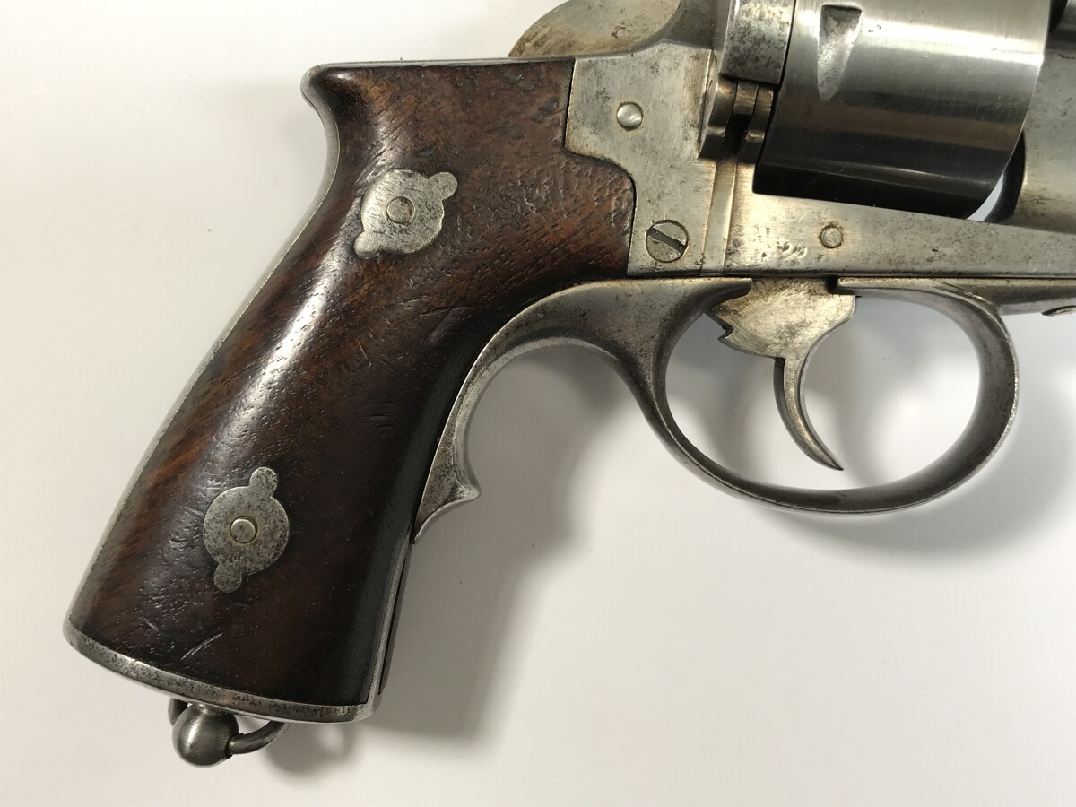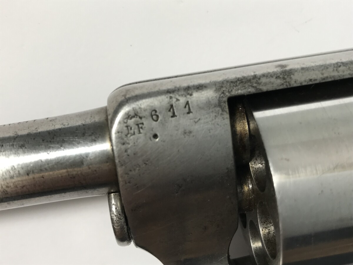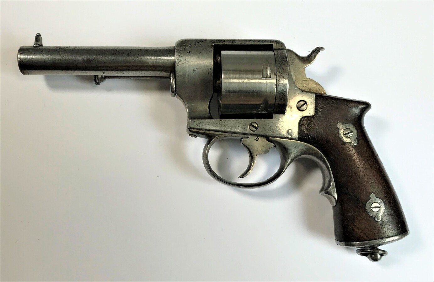 REVOLVER LEFAUCHEUX MODELE 1870 VERSION CIVILE, calibre 11,1 mm à percussion centrale, 6 coups, simple et double action, carcasse en acier poli blanc marquée sur le côté " LF " et " 611 ", canon rond rayé de 12 cm, dessus du canon marqué " E. LEFAUCHEUX BRté S.G.D.G. A PARIS ", tige d'extraction, plaquettes de la poignée en noyer, anneau de calotte, mécanisme fonctionnel, longueur : 24,5 cm, BE.