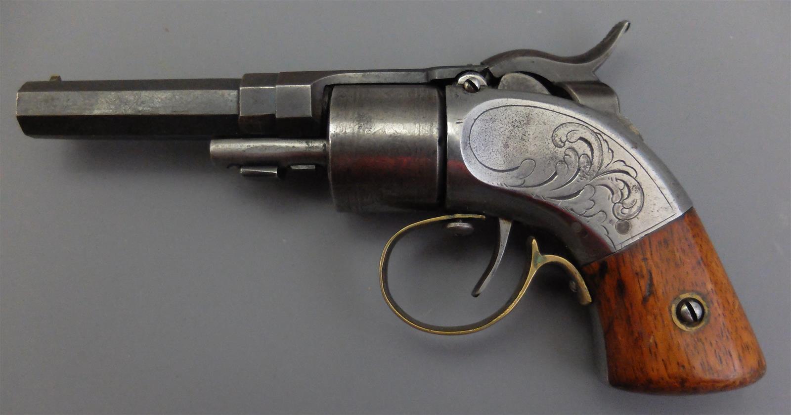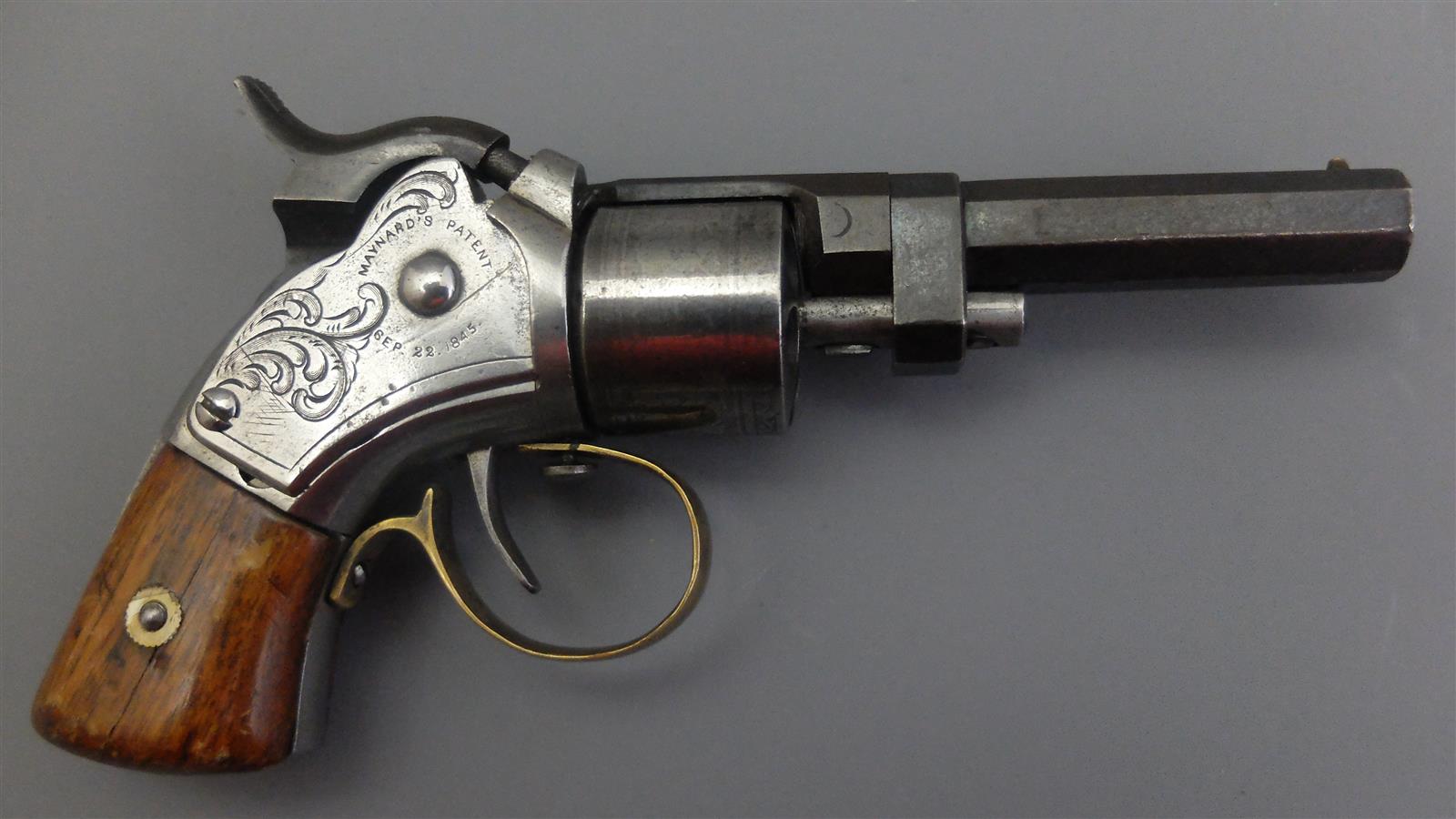 REVOLVER MEYNARD A BANDE AMORCES, calibre 28 à percussion, 6 coups, simple action, carcasse à portière sur le côté droit se relevant pour accéder à la bande-amorce, portière marquée " MEYNARD'S PATENT - SEP. 22. 1845 ", canon rayé à pans pivotant vers le haut, bride marquée sur deux lignes " MASS. ARMS CO CHICOPEE FALLS ", barillet à rotation manuelle à décor de feuillage, détente sous pontet en laiton avec bouton de débrayage de la rotation du barillet, petites plaquettes de crosse en noyer, mécanisme semblant fonctionnel, longueur : 16,5 cm, BE.