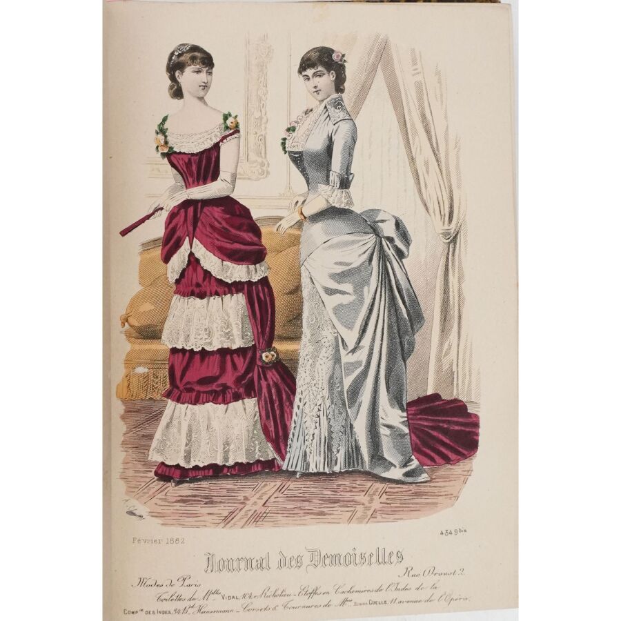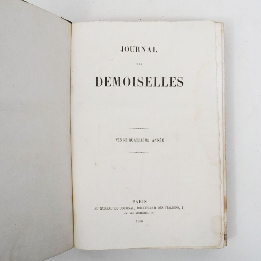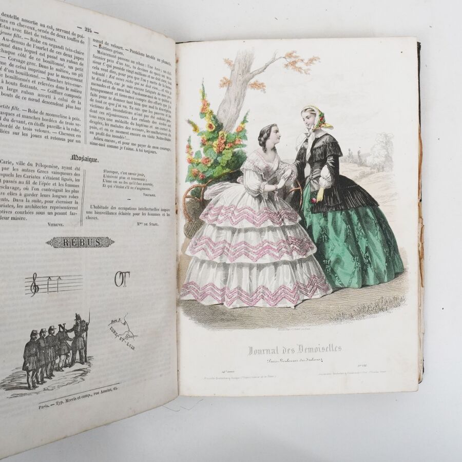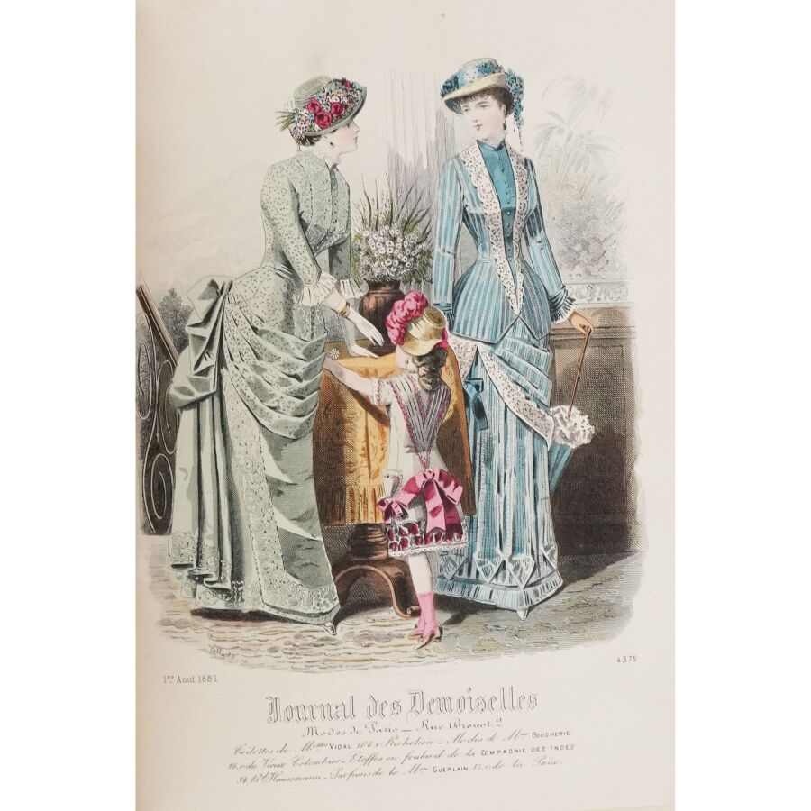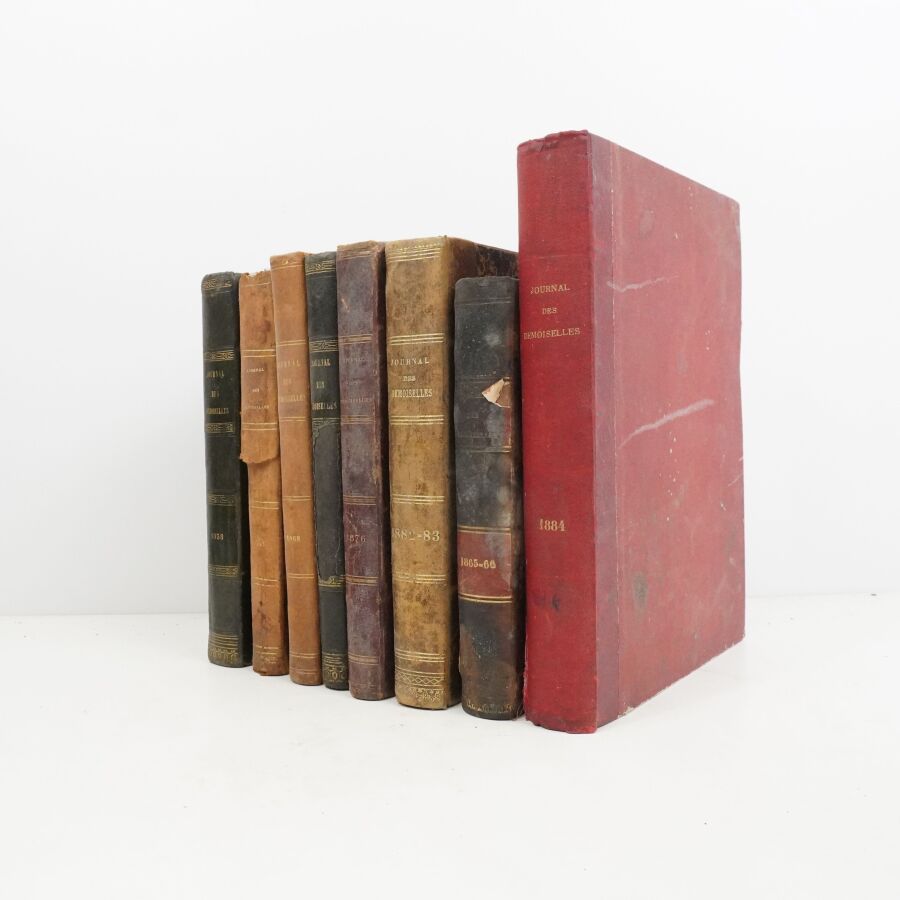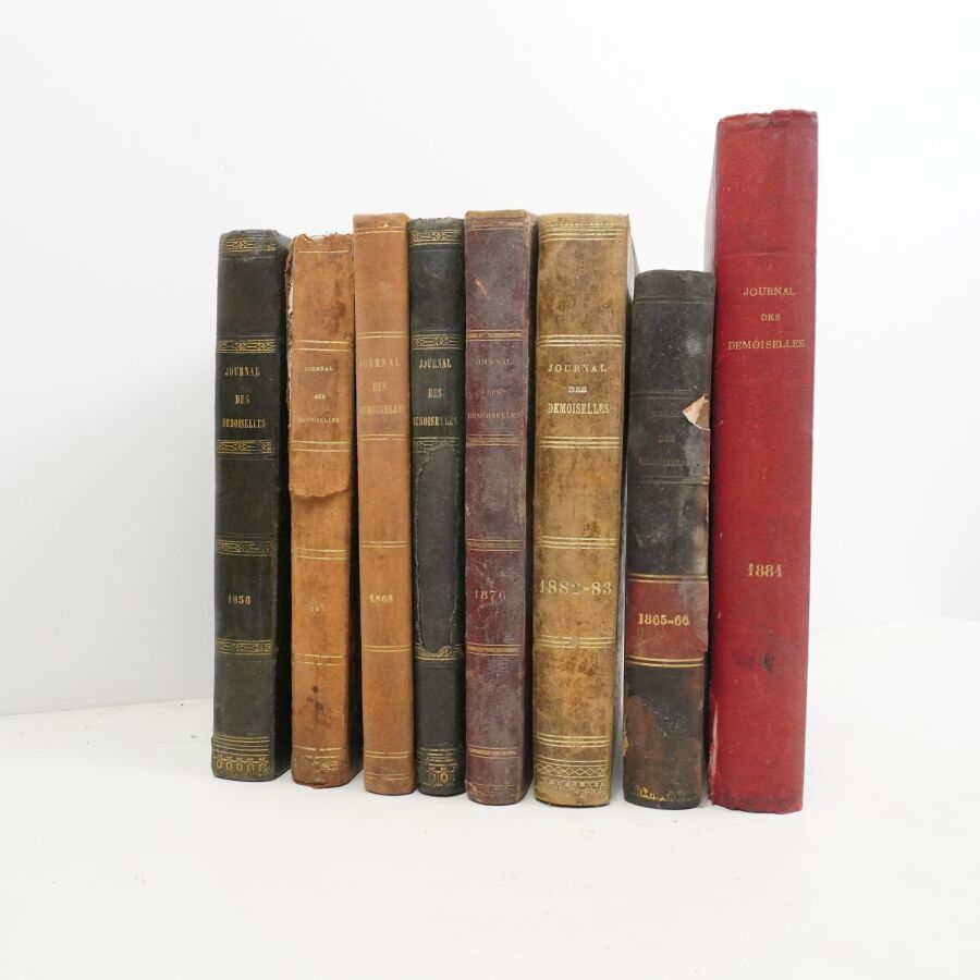 [Revue]. Journal des demoiselles. Paris, au Bureau du Journal, 1856-1884. 7 vol. dont 6 grands in-8 et 1 in-folio, reliures de l'époque, états divers, comprenant les années : 1856 : 7 planches en couleurs, 8 en noir, 4 pl. dépliantes, qqs ff. détachés ; 1867 : 10 pl. coul., 6 en noir. Reliure abîmée ; 1868 : 10 pl. coul, 4 en noir ; 1874 : 10 pl. coul., 4 en noir. Manque de cuir au dos ; 1876 : 9 pl. coul., 5 pl. en noir. Reliure abîmée, qqs ff. déchirés ; 1882-1883 : 12 pl. couleurs ; 1883-1884 : 50 pl. couleurs.