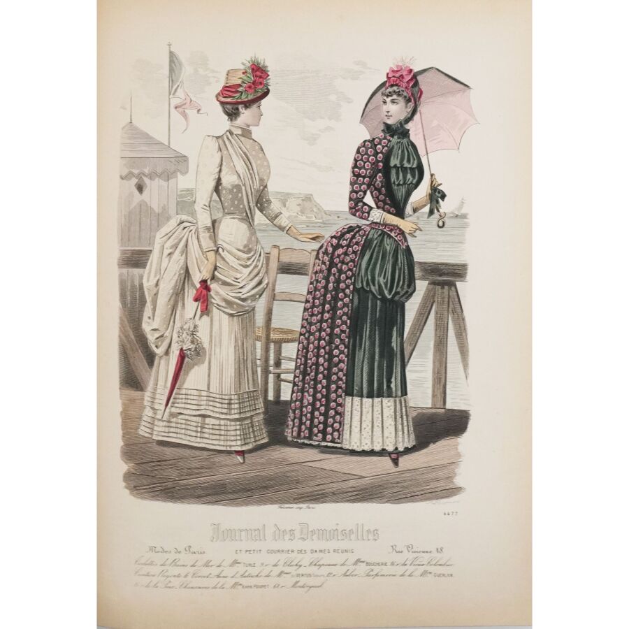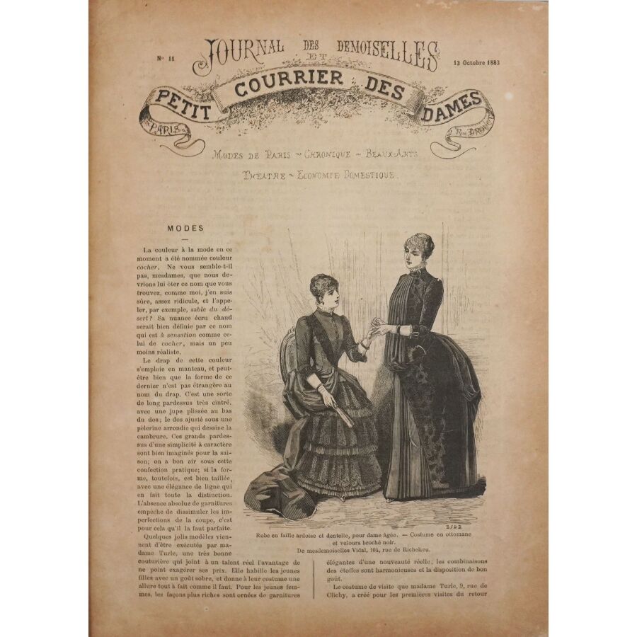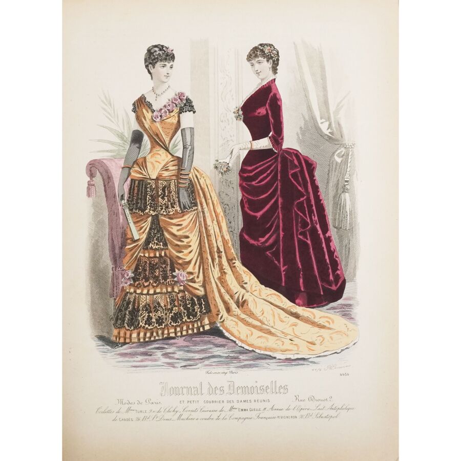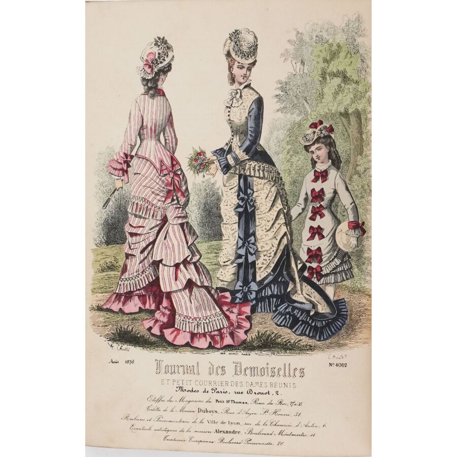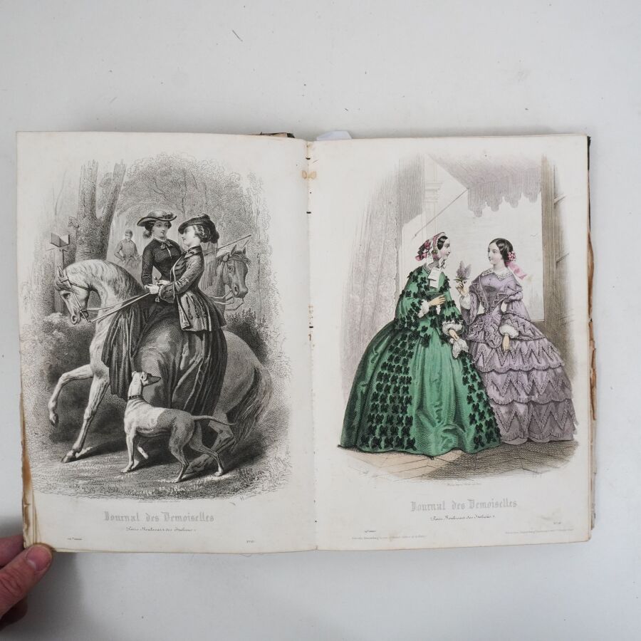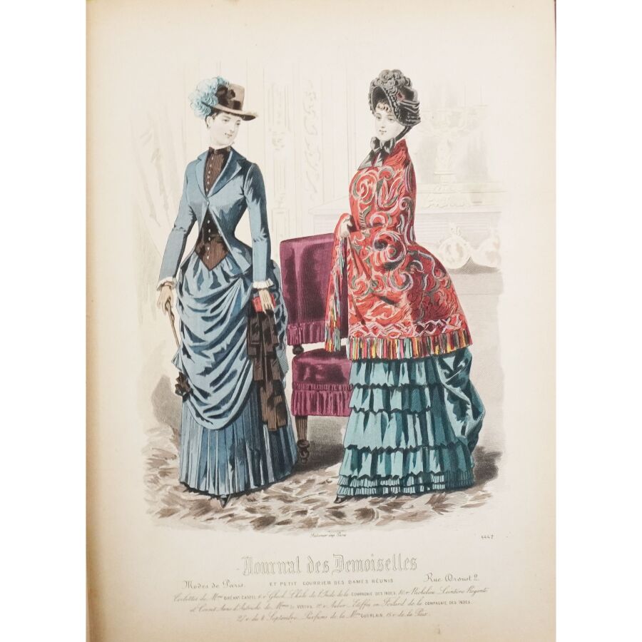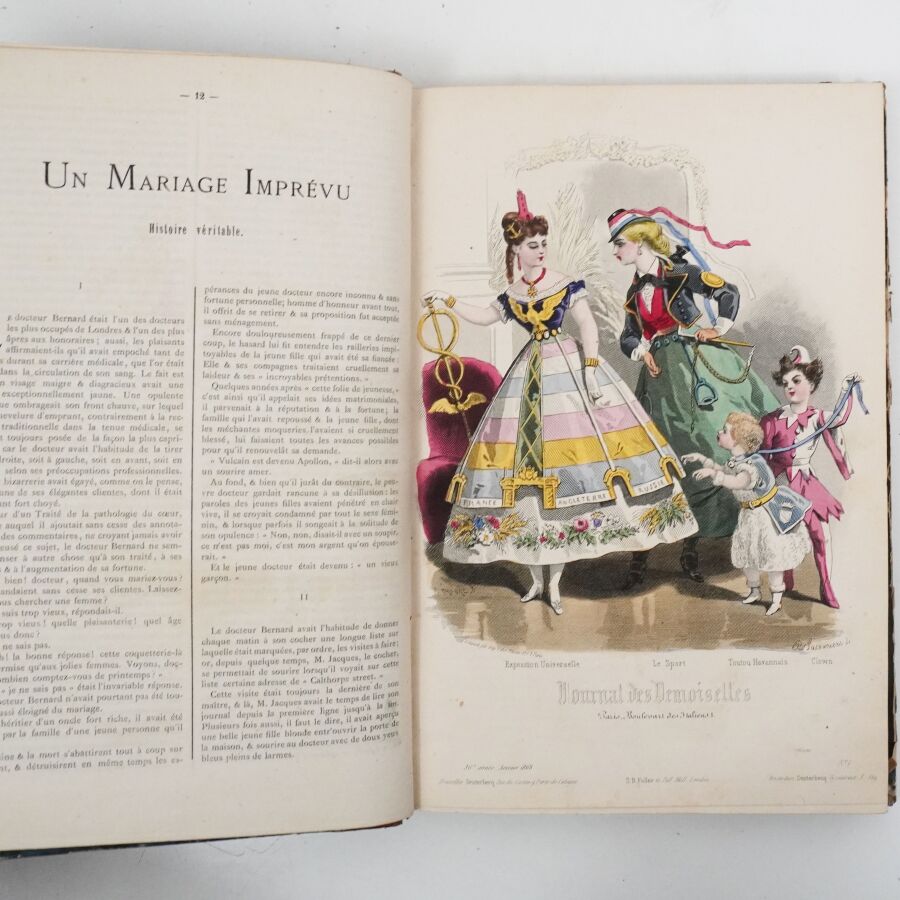 [Revue]. Journal des demoiselles. Paris, au Bureau du Journal, 1856-1884. 7 vol. dont 6 grands in-8 et 1 in-folio, reliures de l'époque, états divers, comprenant les années : 1856 : 7 planches en couleurs, 8 en noir, 4 pl. dépliantes, qqs ff. détachés ; 1867 : 10 pl. coul., 6 en noir. Reliure abîmée ; 1868 : 10 pl. coul, 4 en noir ; 1874 : 10 pl. coul., 4 en noir. Manque de cuir au dos ; 1876 : 9 pl. coul., 5 pl. en noir. Reliure abîmée, qqs ff. déchirés ; 1882-1883 : 12 pl. couleurs ; 1883-1884 : 50 pl. couleurs.