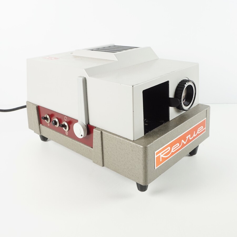 REVUE : Projecteur de diapositives, modèle N24, circa 1960, présenté avec sa télécommande. On y joint une boîte à diapositives.