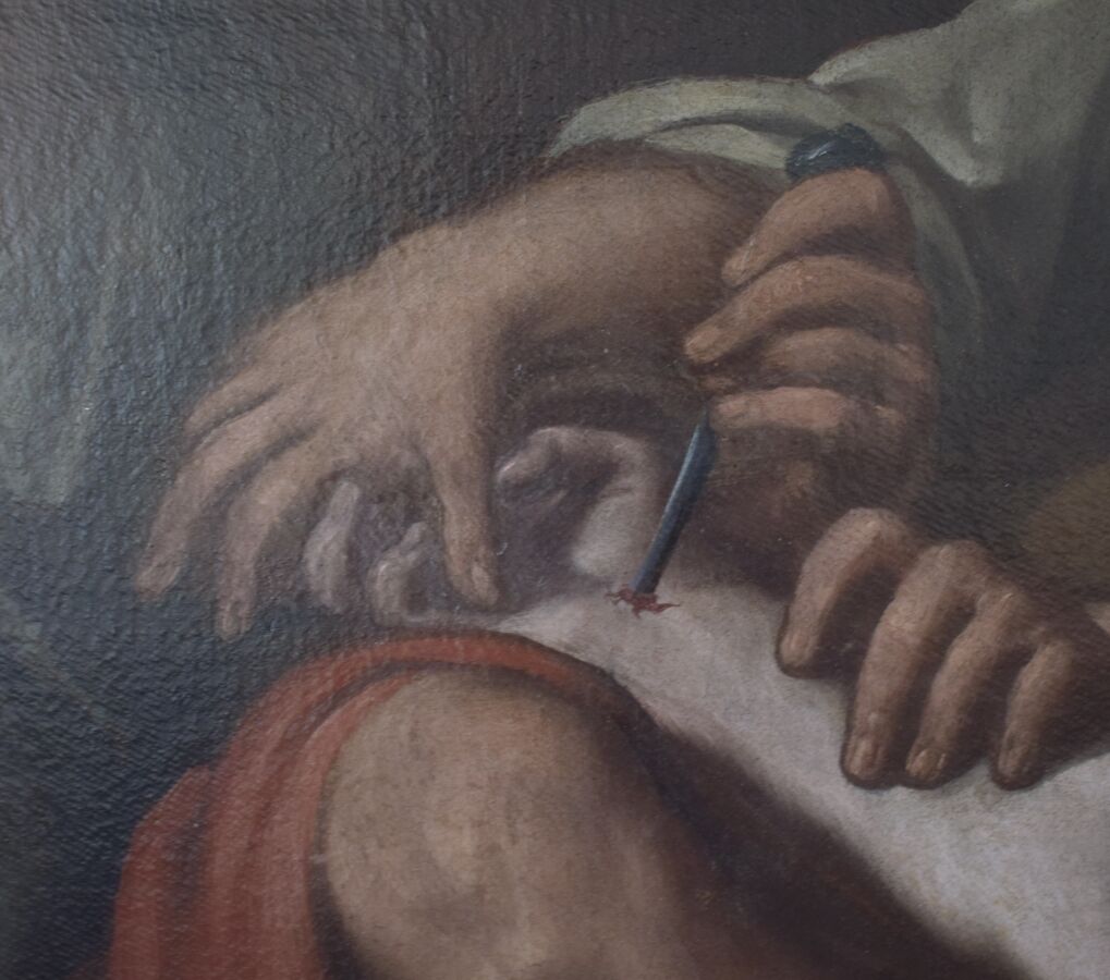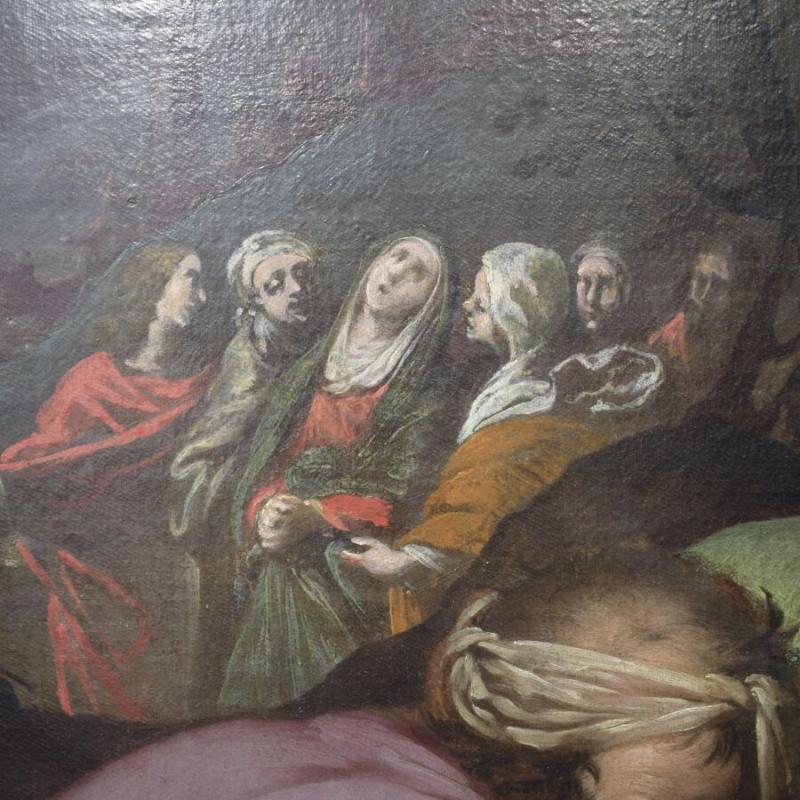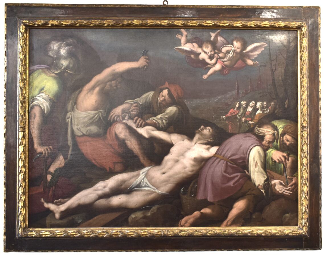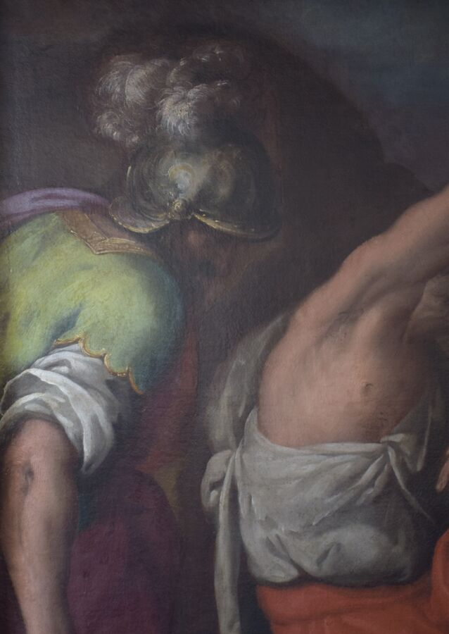 Riccardo TAURINI (1608 - 1678), "Le Christ mis en croix", huile sur toile, encadrement de la première partie du 18ème siècle, 97 x 129 cm, rentoilage et restaurations.