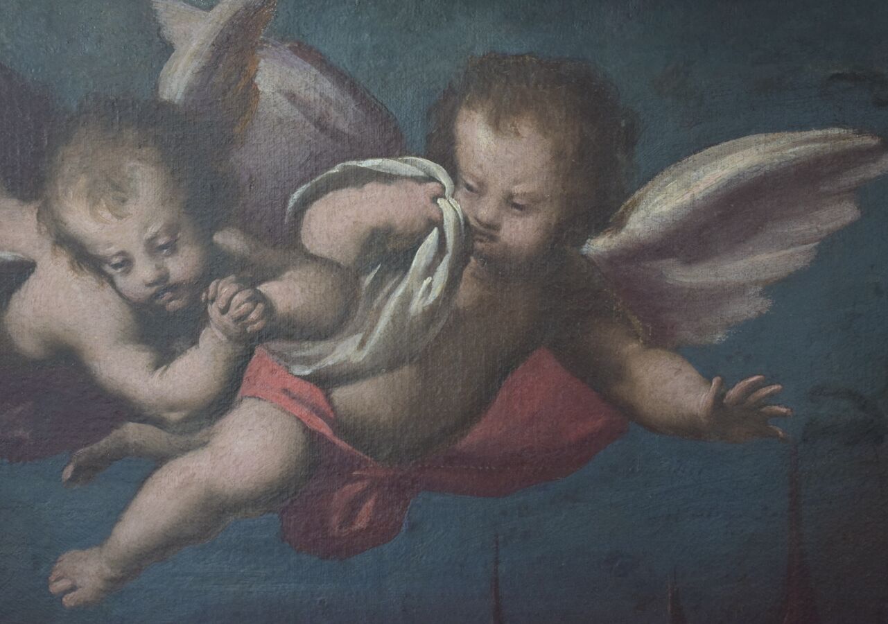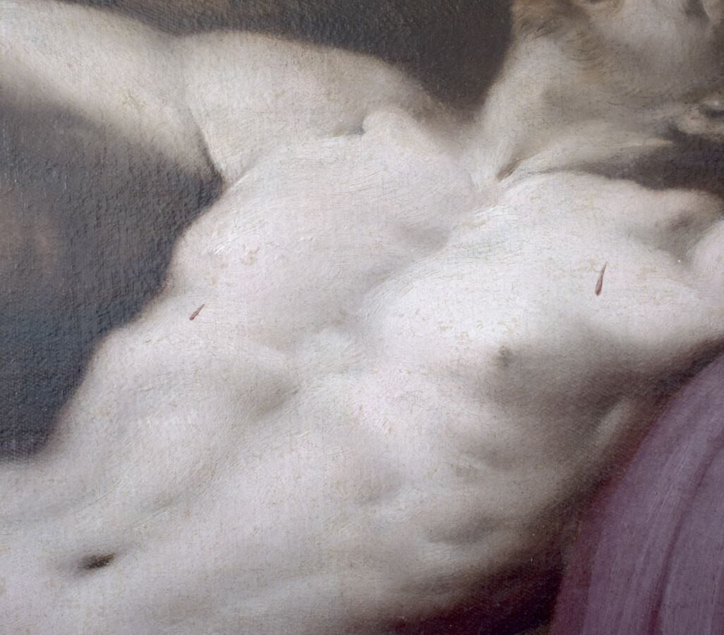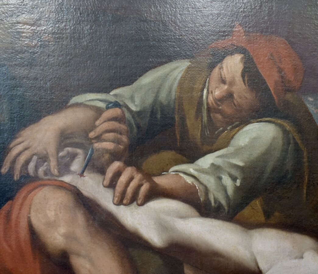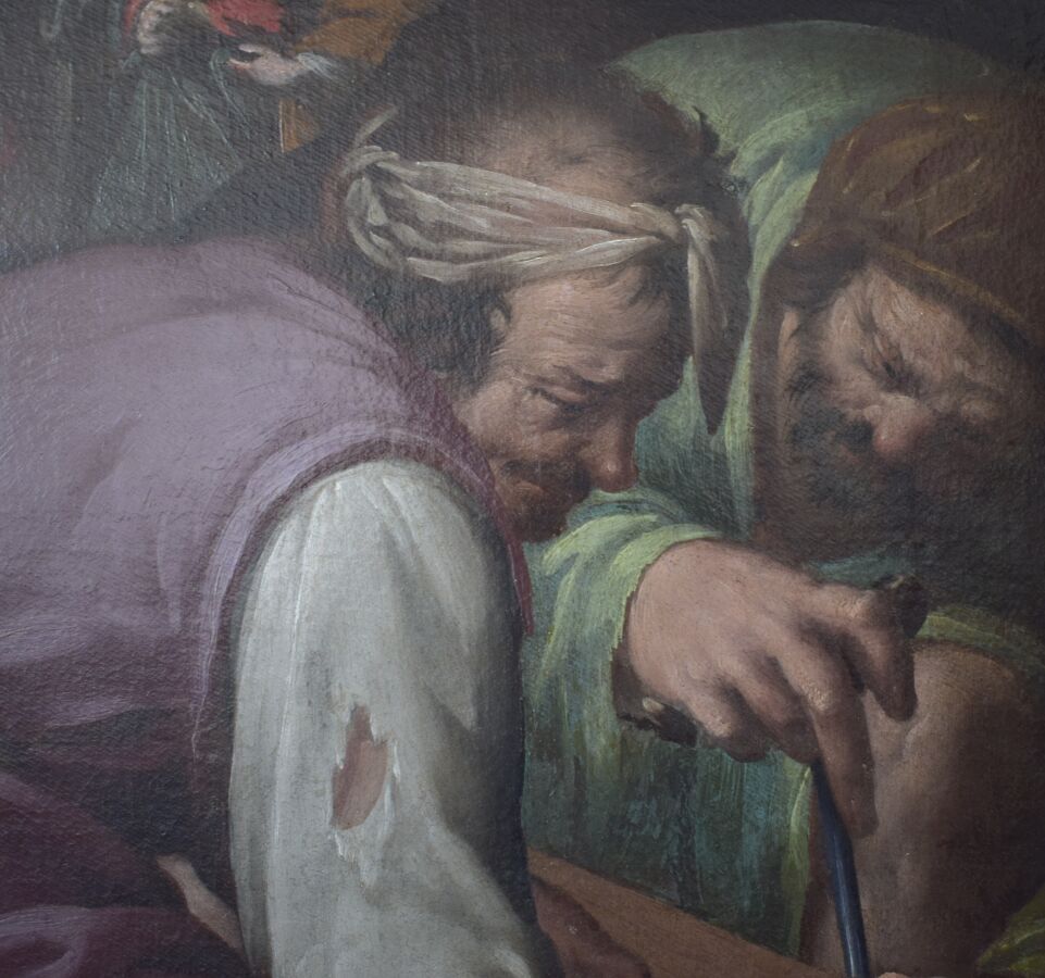 Riccardo TAURINI (1608 - 1678), "Le Christ mis en croix", huile sur toile, encadrement de la première partie du 18ème siècle, 97 x 129 cm, rentoilage et restaurations.