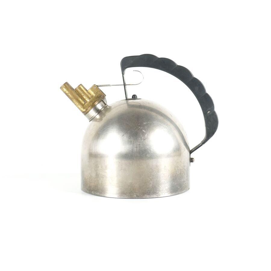 Richard SAPPER (1932) - ALESSI : Bouilloire en inox, anse noire, H. 21cm (petites usures).