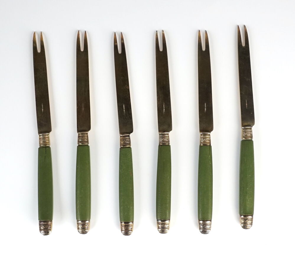 Robert LINZELER : Ensemble de 6 couteaux à crustacé, les lames en vermeil, poinçon Minerve 1er titre, les manches en bakélite verte, signés, L. 15.5 cm (usures et fendillements aux manches). Poids brut : 106 g environ.