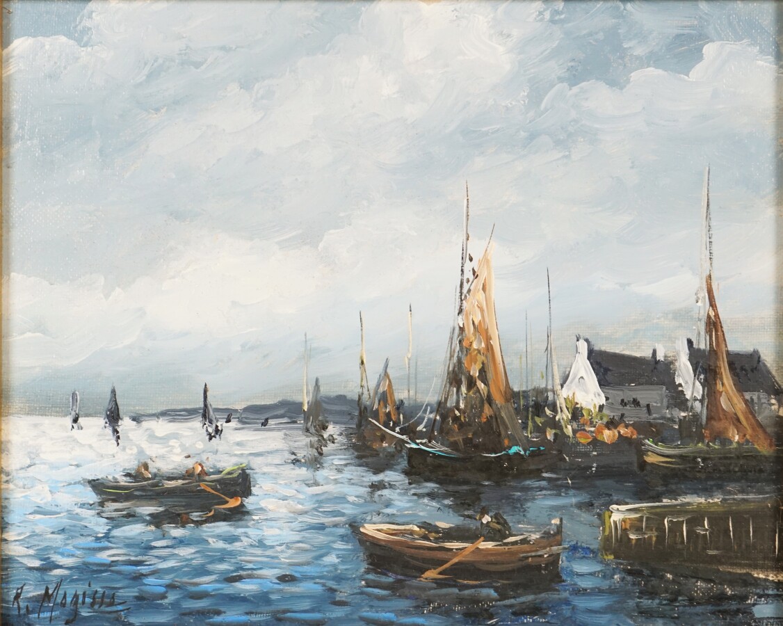 Robert MOGISSE (né en 1933), "Petit port breton" huile sur toile signée en bas à gauche, 22 x 27 cm.
