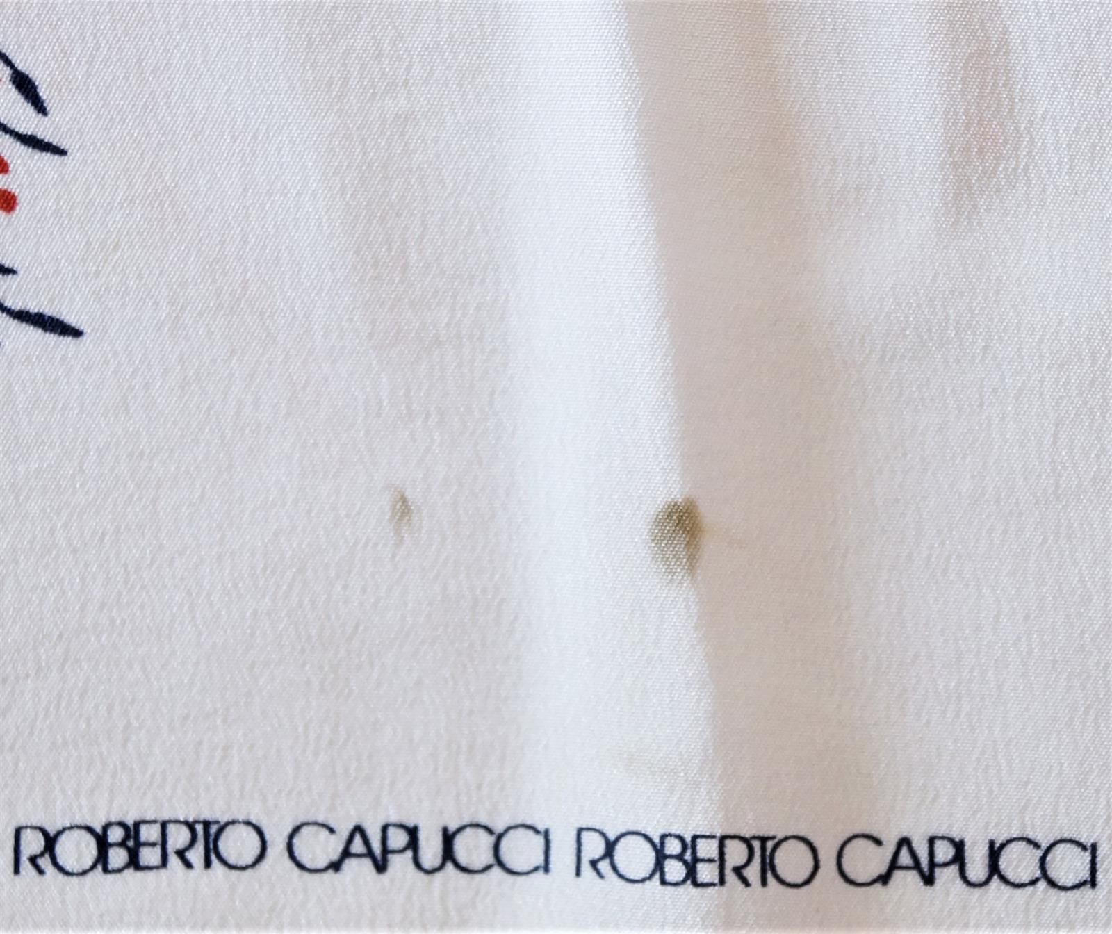 Roberto CAPUCCI : Carré de soie imprimée à décor d'un arbre en fleurs sur fond ivoire, 84 x 85 cm (petite tache).